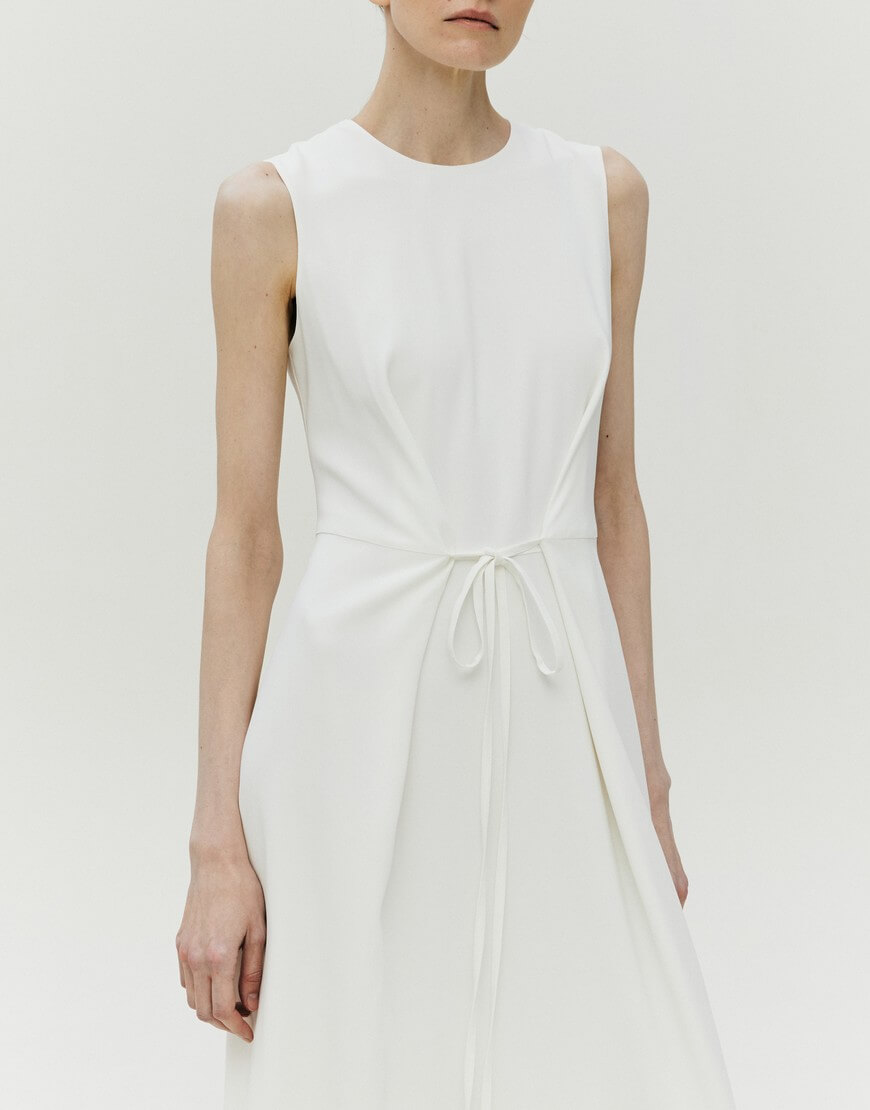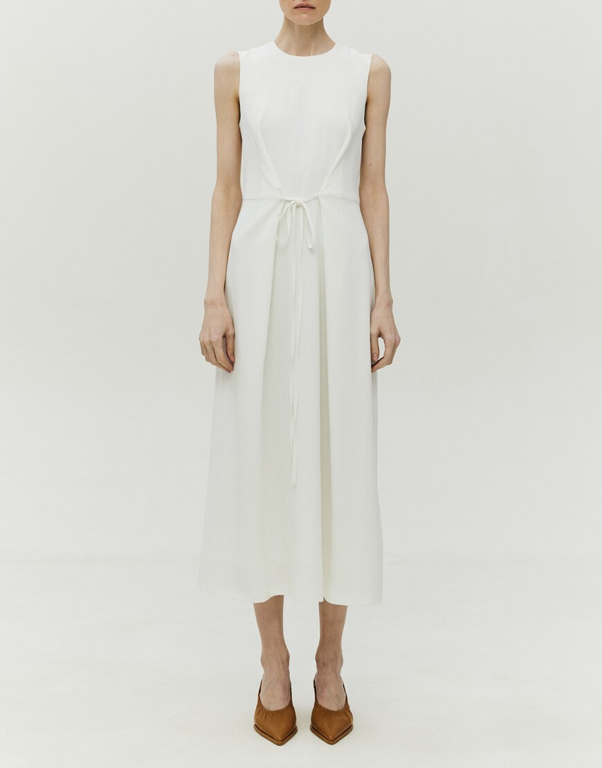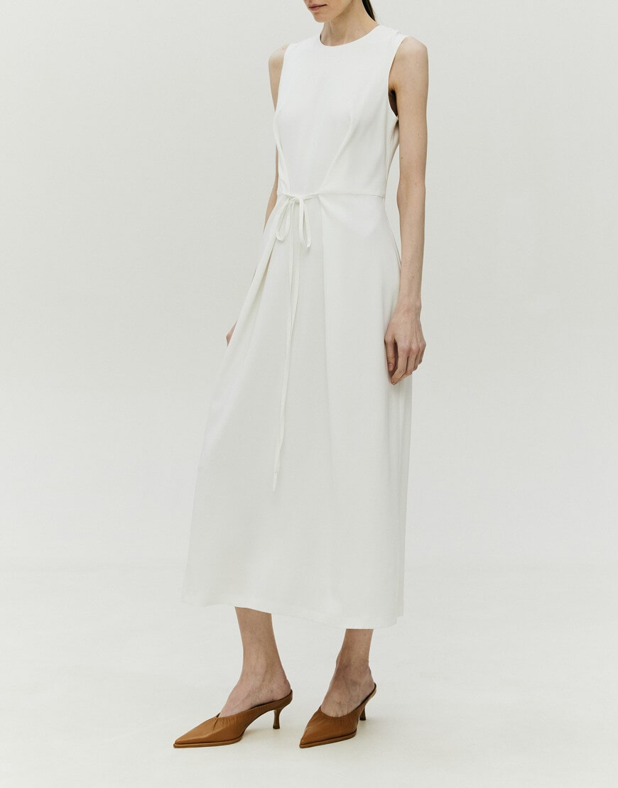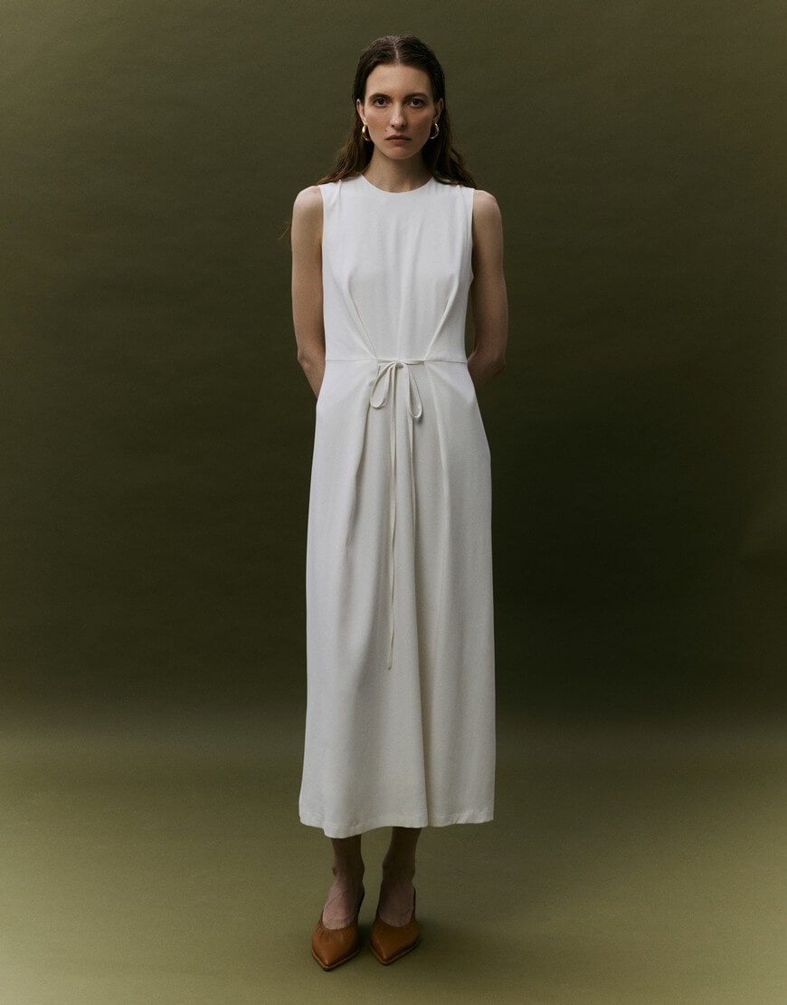 Сукня напівприлягаючого силуету з підкладкою. Спереду пришиті декоративні тасьми, за допомогою яких можна регулювати об’єм виробу в області талії. У бокових швах спідниці – кишені. Ззаду сукня застібається на блискавку. Довжина виробу 129 см.