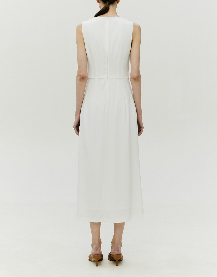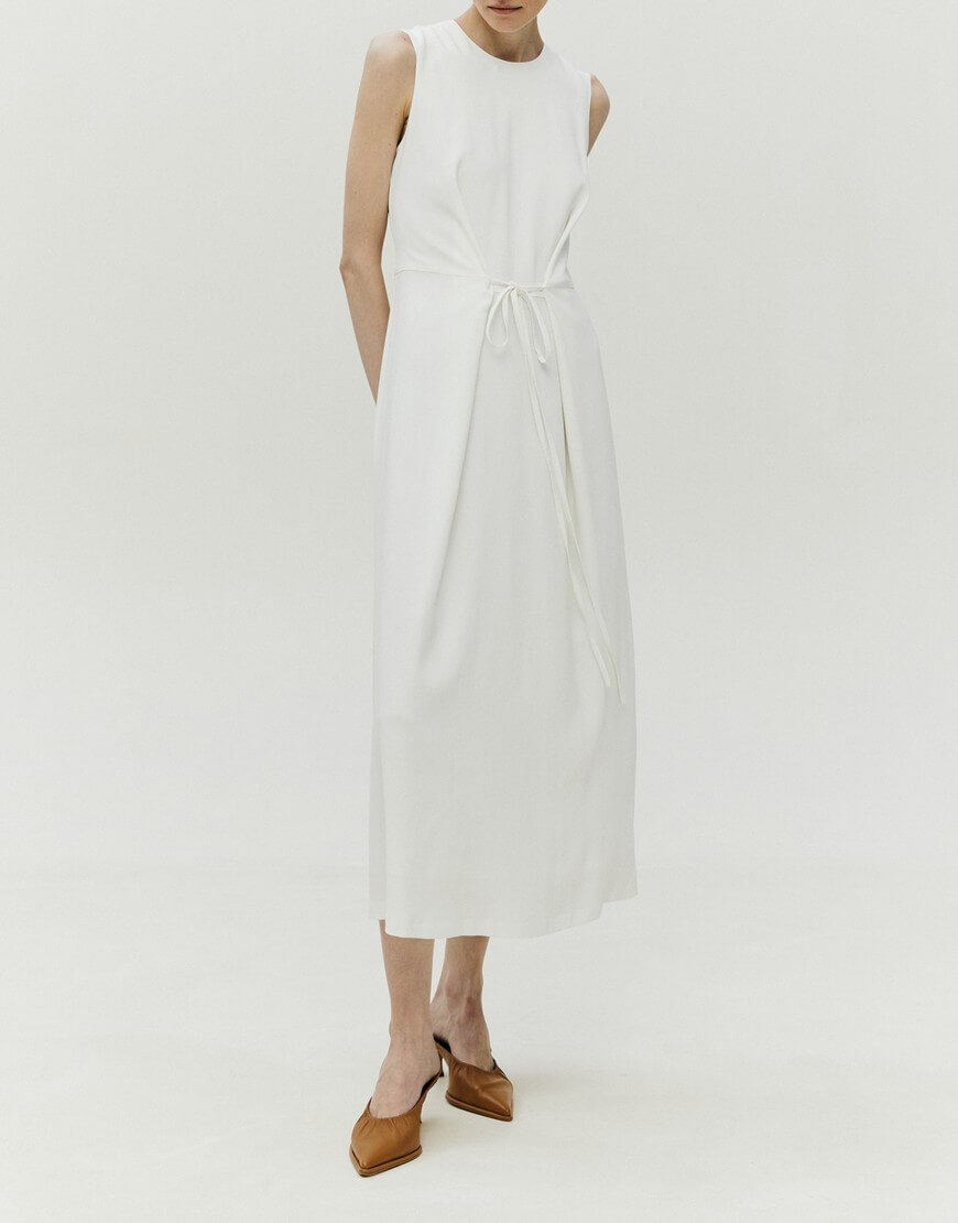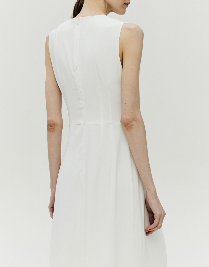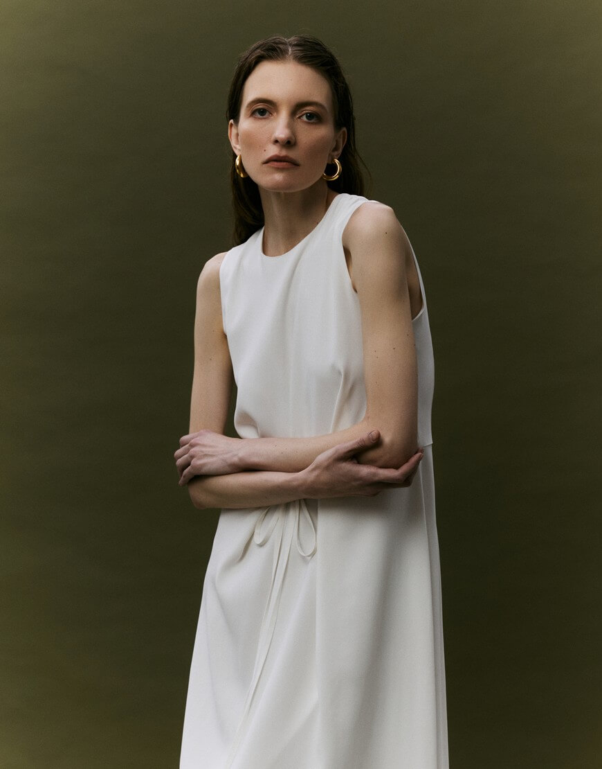 Сукня напівприлягаючого силуету з підкладкою. Спереду пришиті декоративні тасьми, за допомогою яких можна регулювати об’єм виробу в області талії. У бокових швах спідниці – кишені. Ззаду сукня застібається на блискавку. Довжина виробу 129 см.