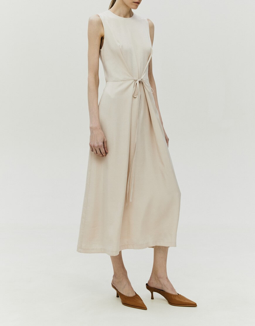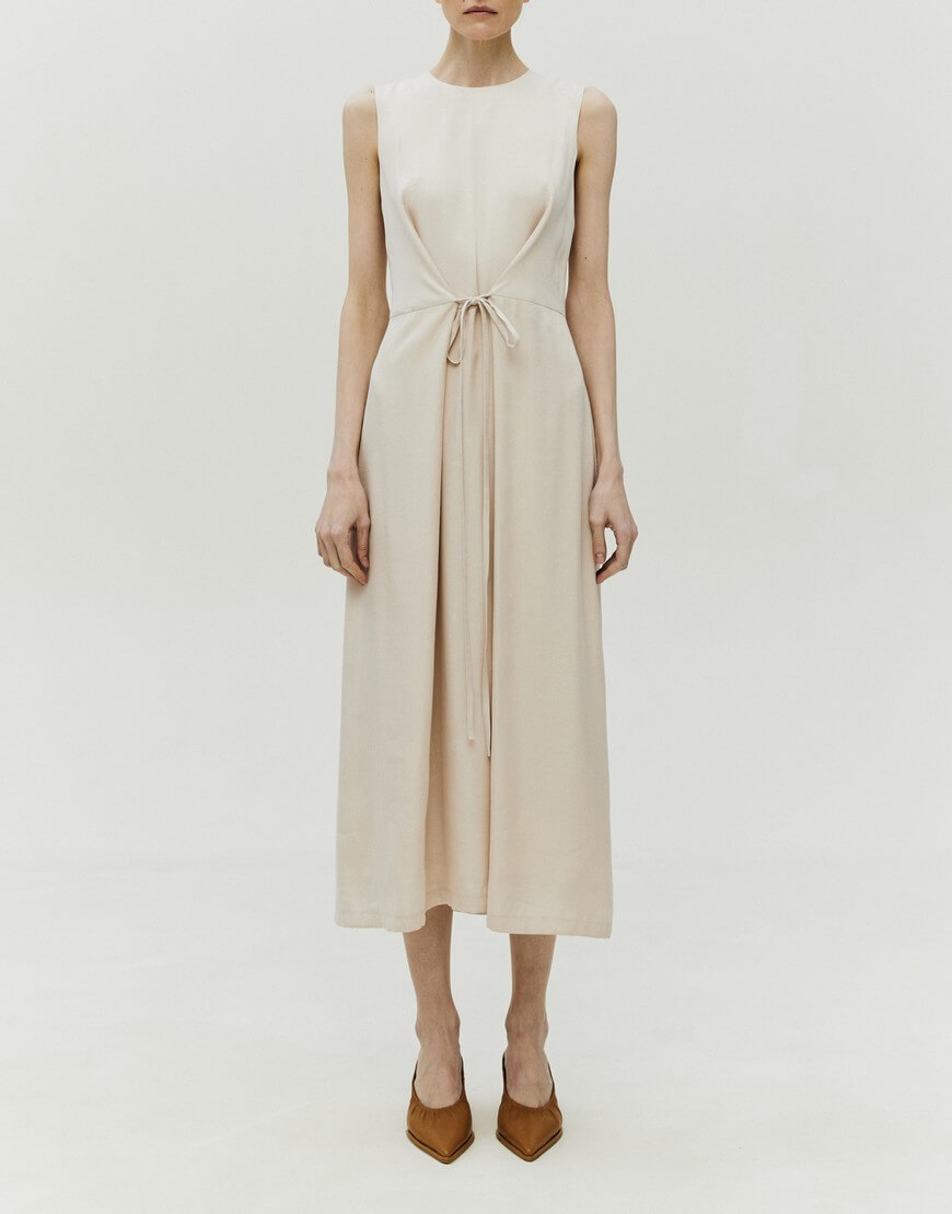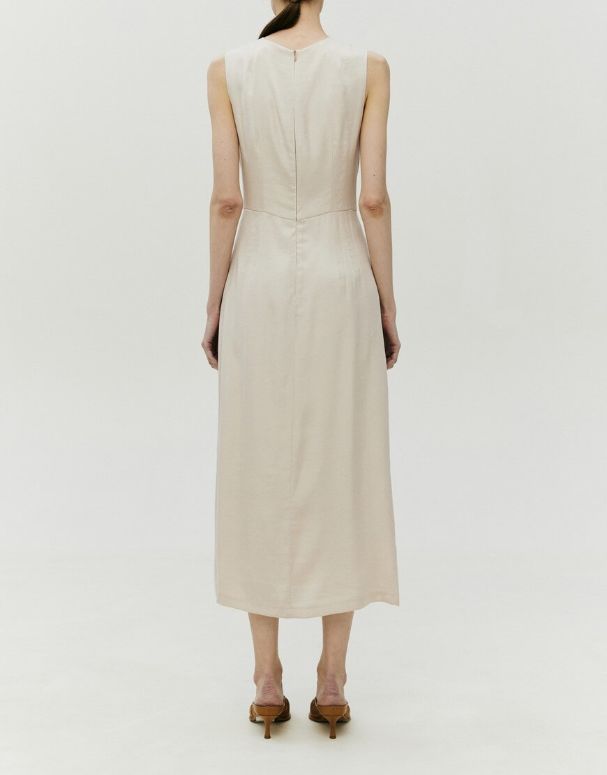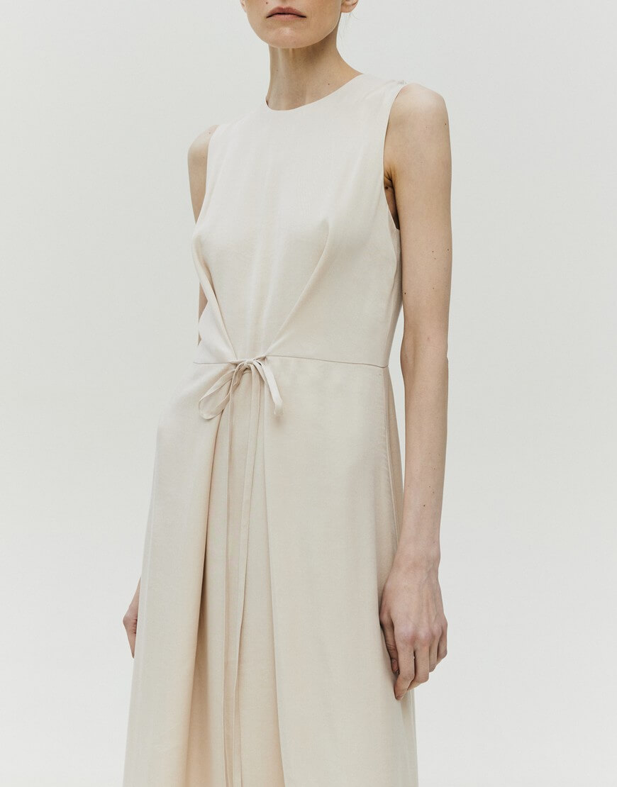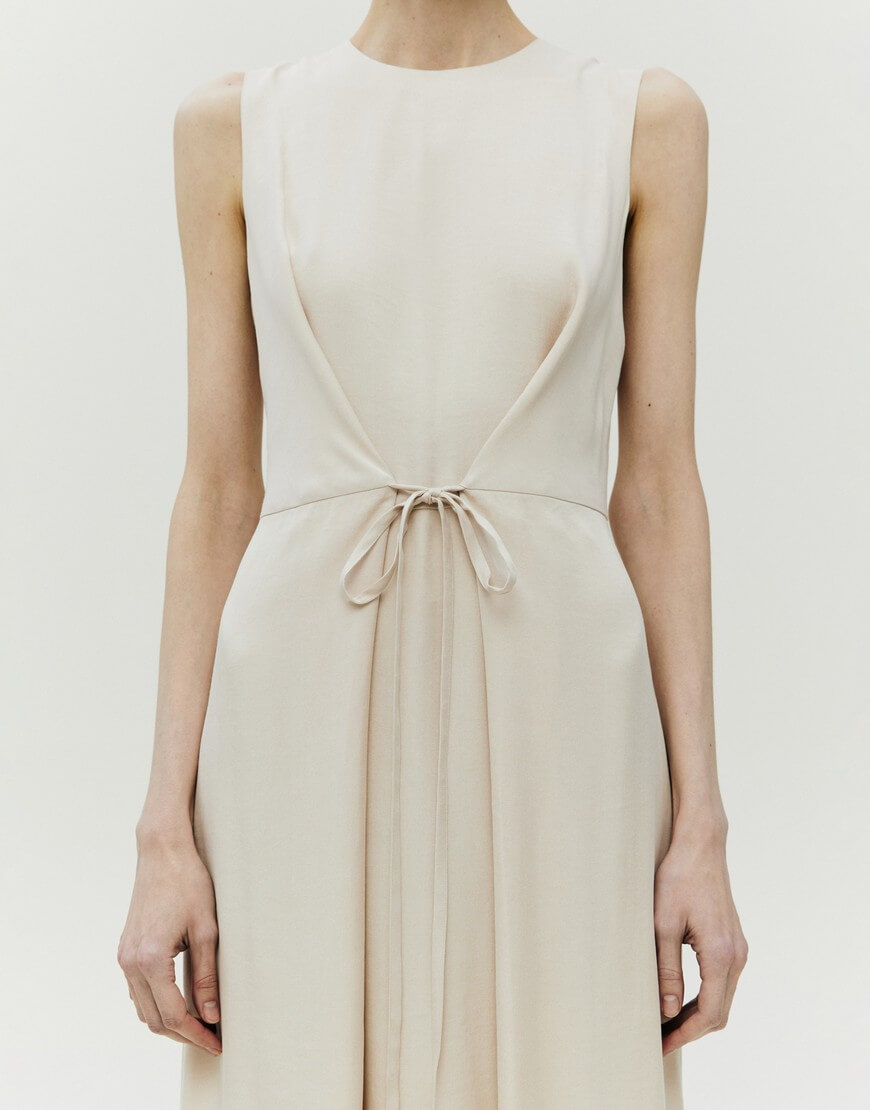 Сукня напівприлягаючого силуету з підкладкою. Спереду пришиті декоративні тасьми, за допомогою яких можна регулювати об’єм виробу в області талії. У бокових швах спідниці – кишені. Ззаду сукня застібається на блискавку. Довжина виробу 129 см.