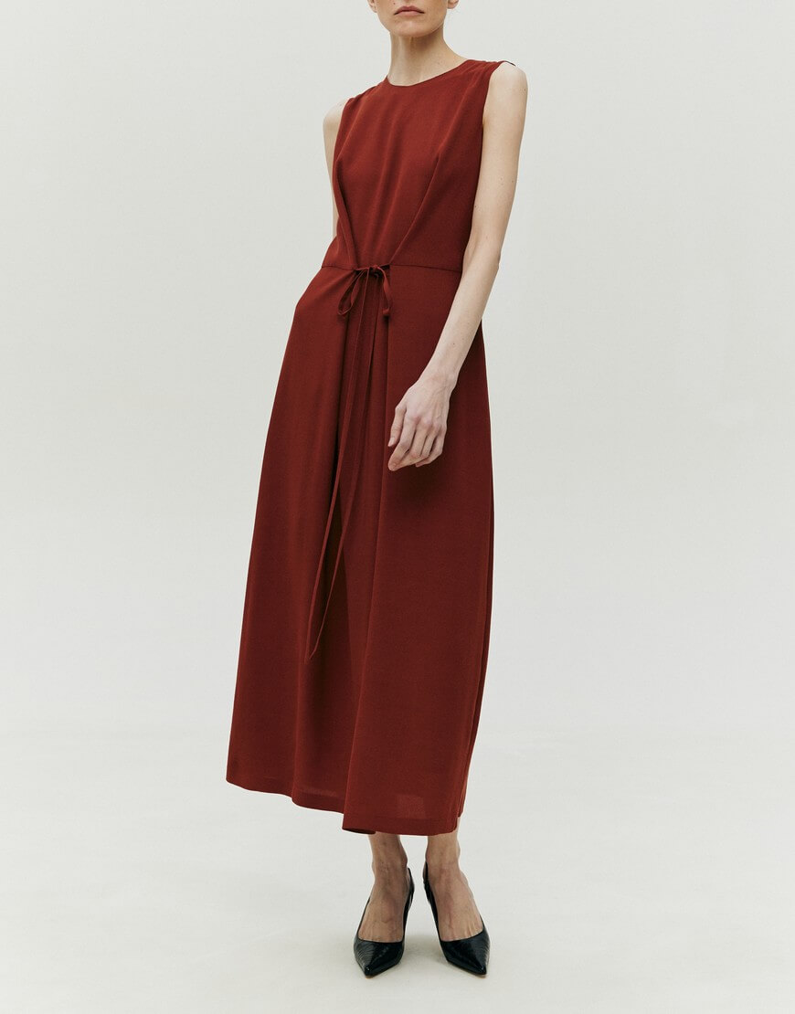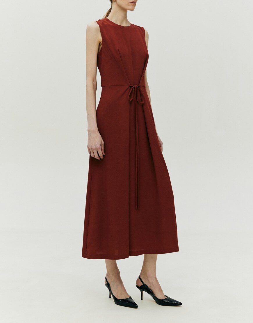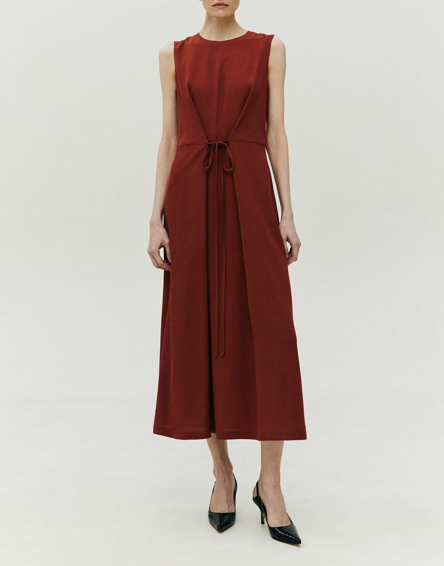 Сукня напівприлягаючого силуету з підкладкою. Спереду пришиті декоративні тасьми, за допомогою яких можна регулювати об’єм виробу в області талії. У бокових швах спідниці – кишені. Ззаду сукня застібається на блискавку. Довжина виробу 129 см.