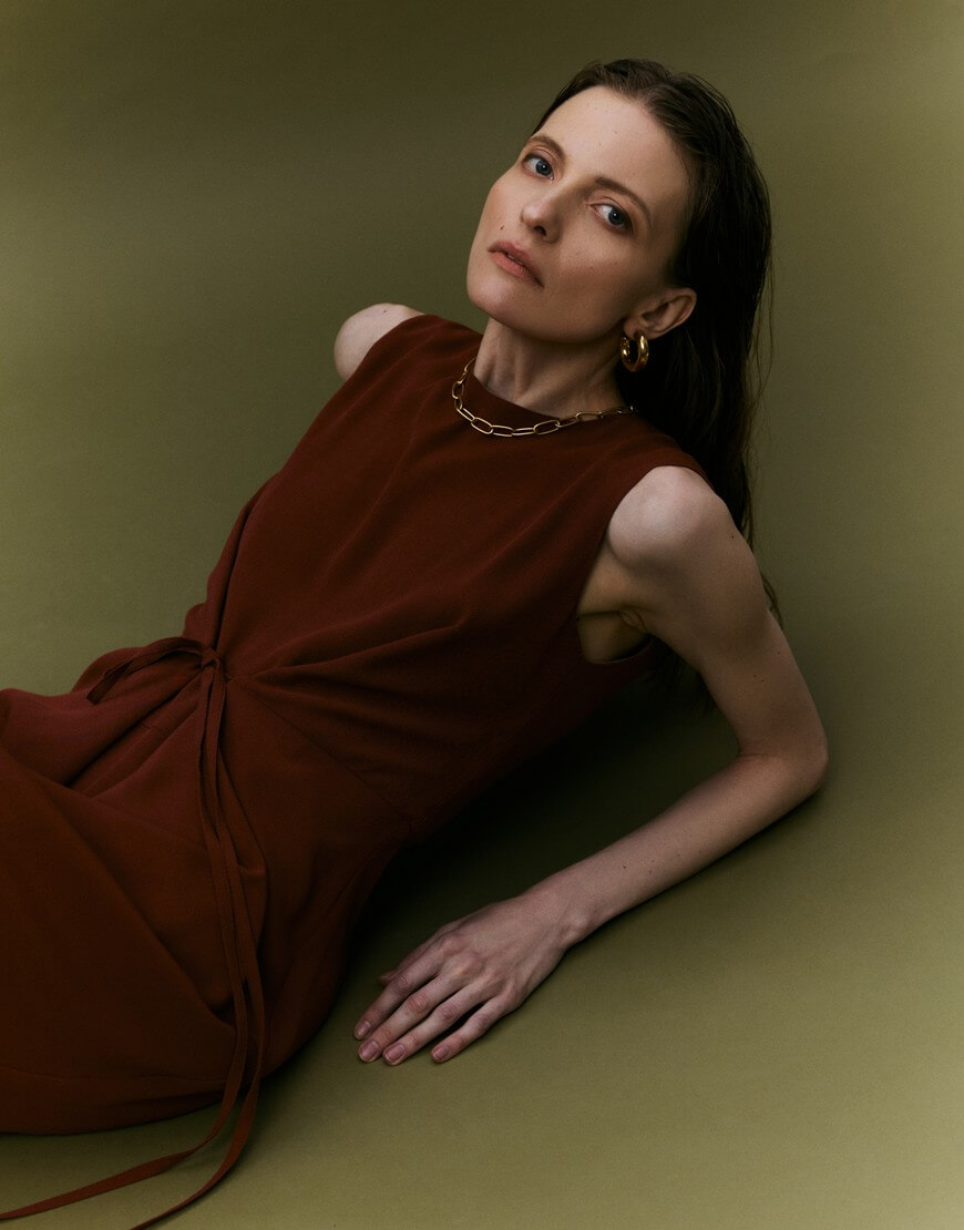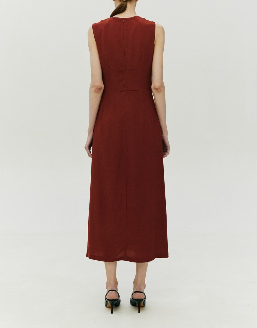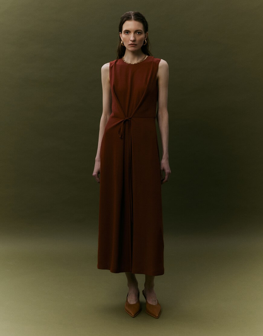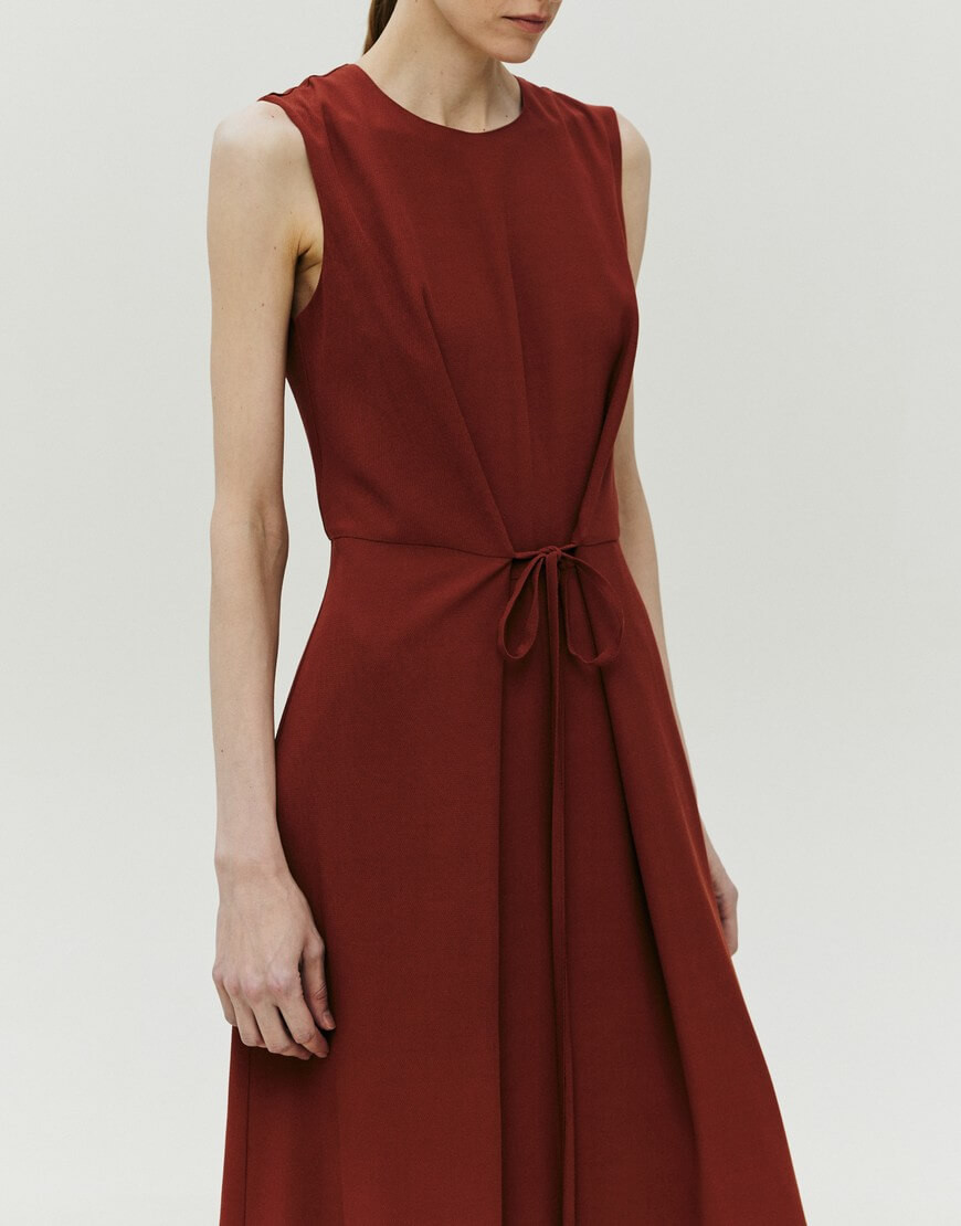 Сукня напівприлягаючого силуету з підкладкою. Спереду пришиті декоративні тасьми, за допомогою яких можна регулювати об’єм виробу в області талії. У бокових швах спідниці – кишені. Ззаду сукня застібається на блискавку. Довжина виробу 129 см.