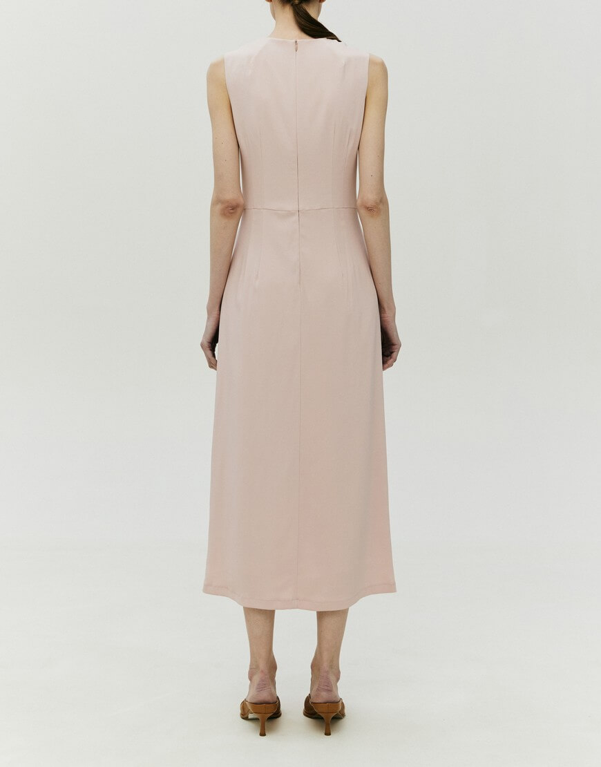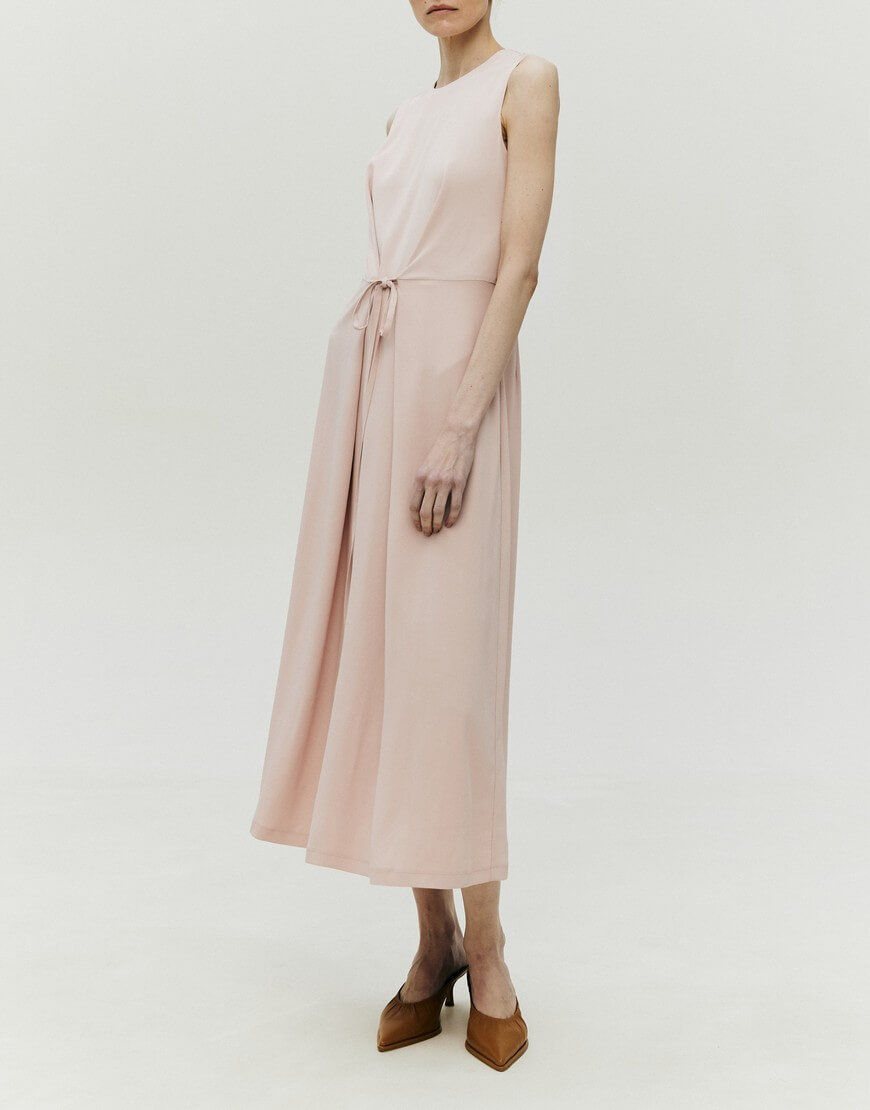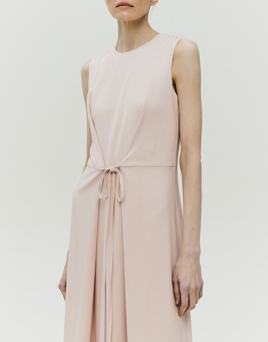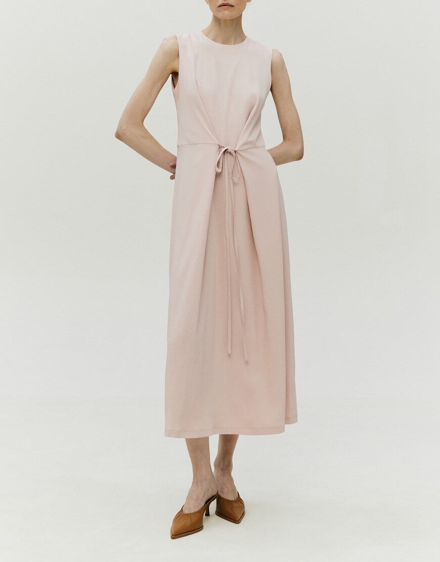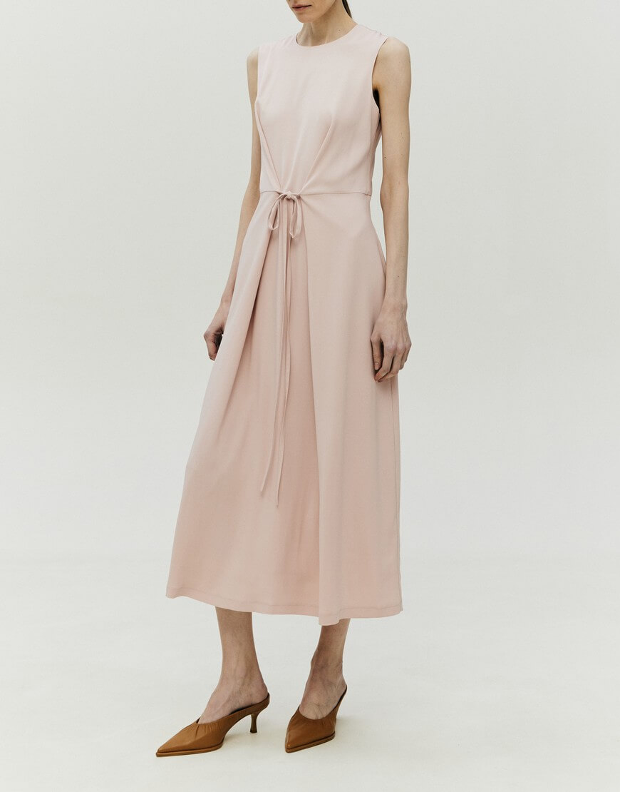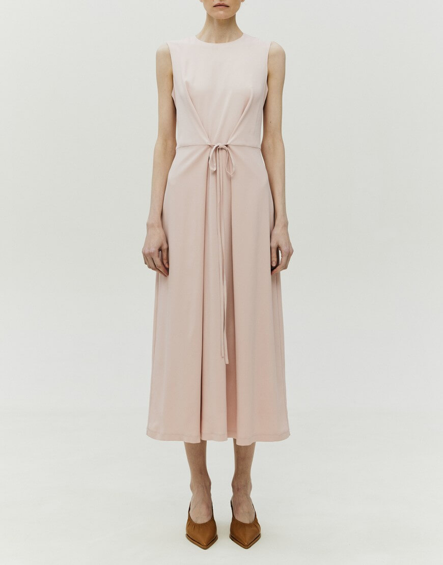 Сукня напівприлягаючого силуету з підкладкою. Спереду пришиті декоративні тасьми, за допомогою яких можна регулювати об’єм виробу в області талії. У бокових швах спідниці – кишені. Ззаду сукня застібається на блискавку. Довжина виробу 129 см.