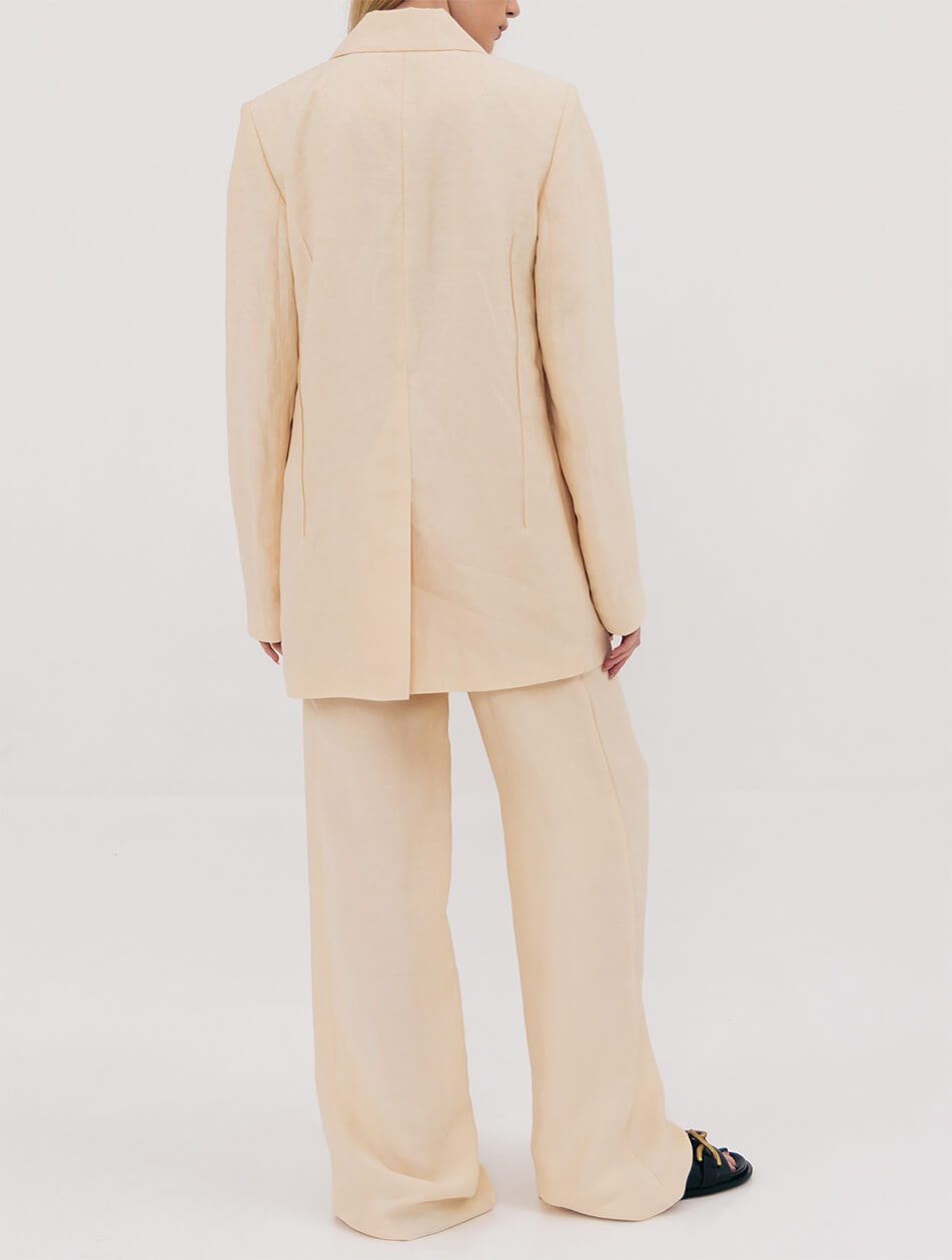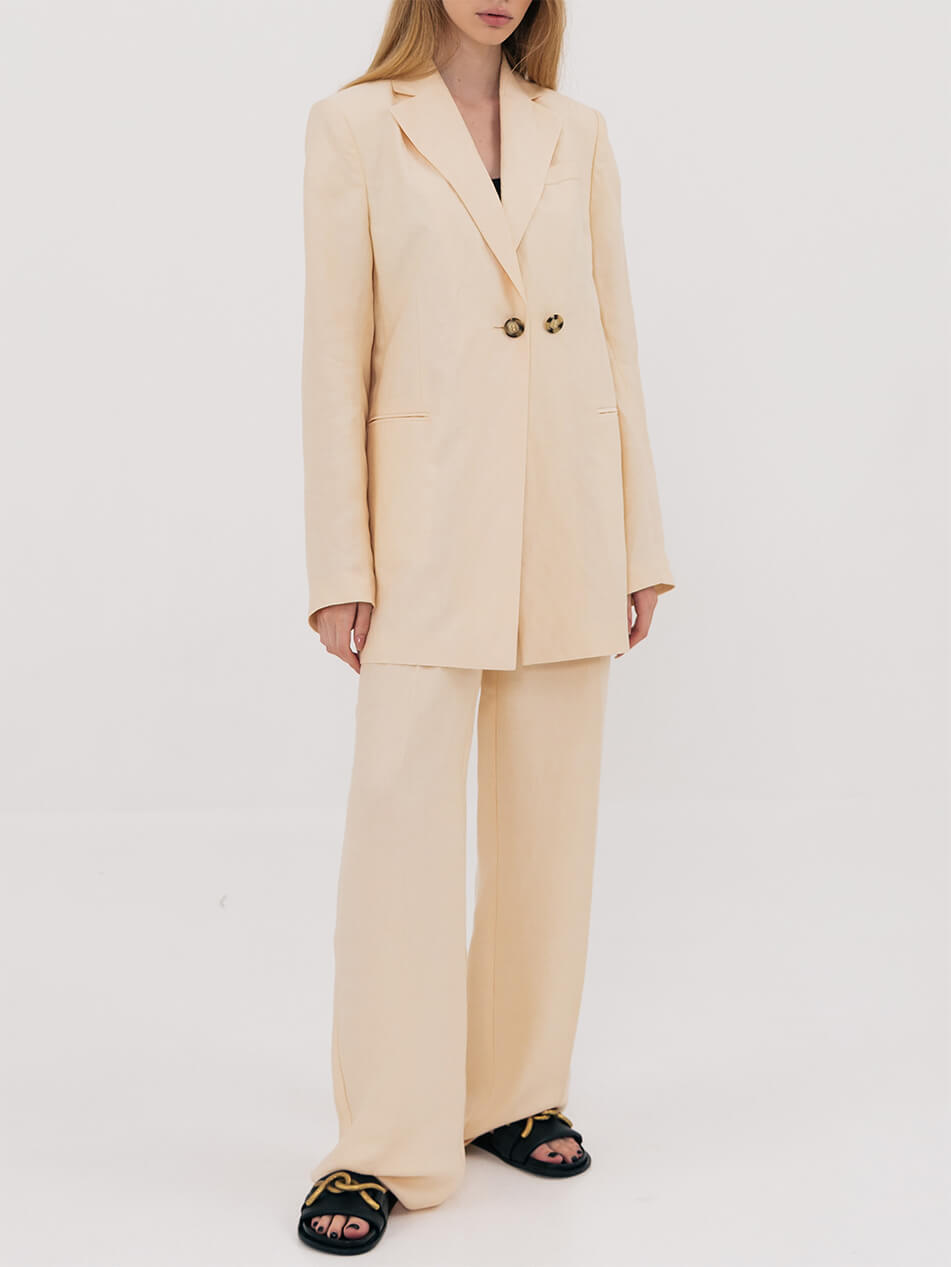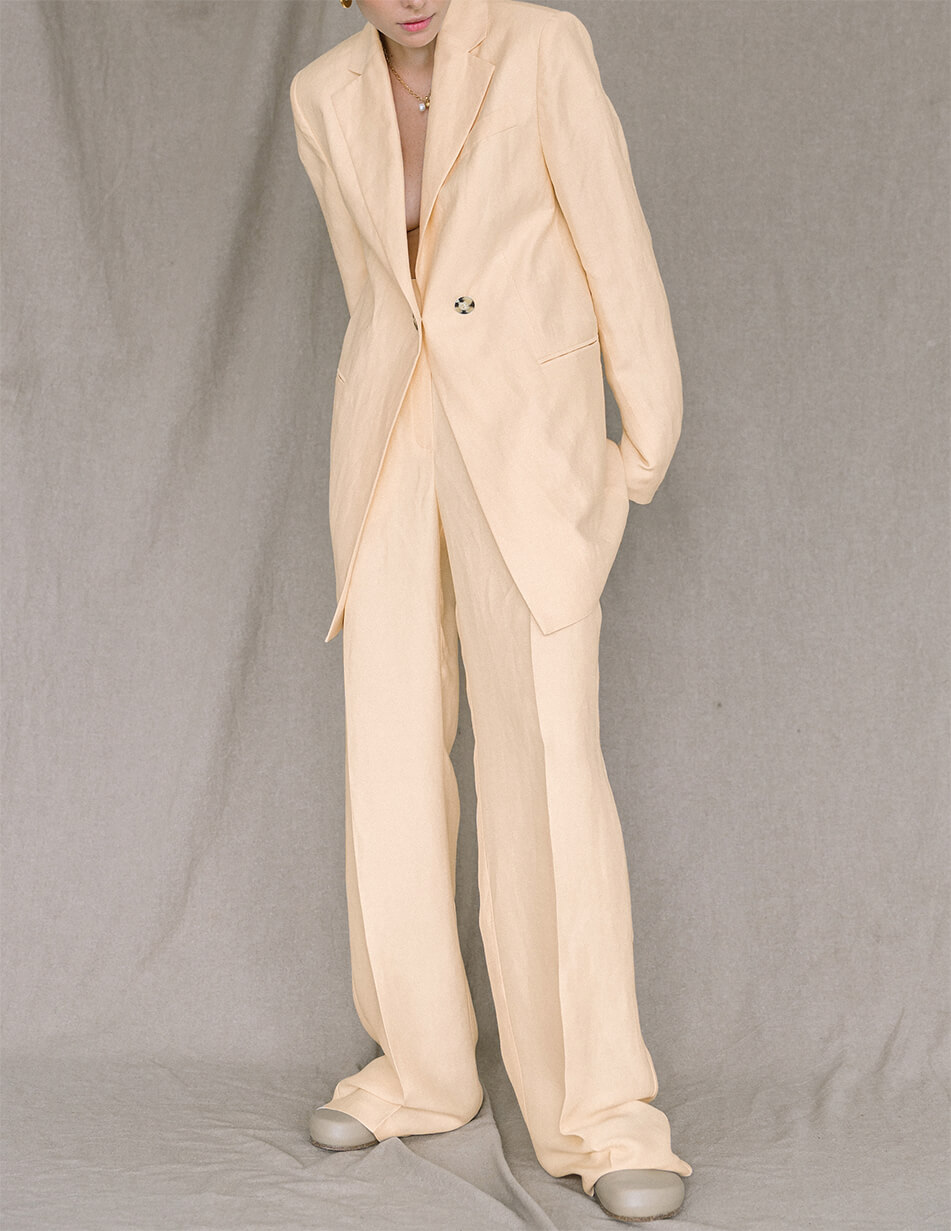 Класичні широкі штани з високою посадкою. Попереду два застрочені защипи, що візуально прибирають об’єм у верхній частині стегна. Вишукані штани-палаццо створюють відчуття польоту. Низ виробу оброблений декоративним швом для індивідуального припасування виробу під зростання жінки. Укоротити штани безкоштовно можна у шоу-румі виробника. Довжина штанини за внутрішнім швом 89 см, ширина штанини на рівні стегна 31 см.
