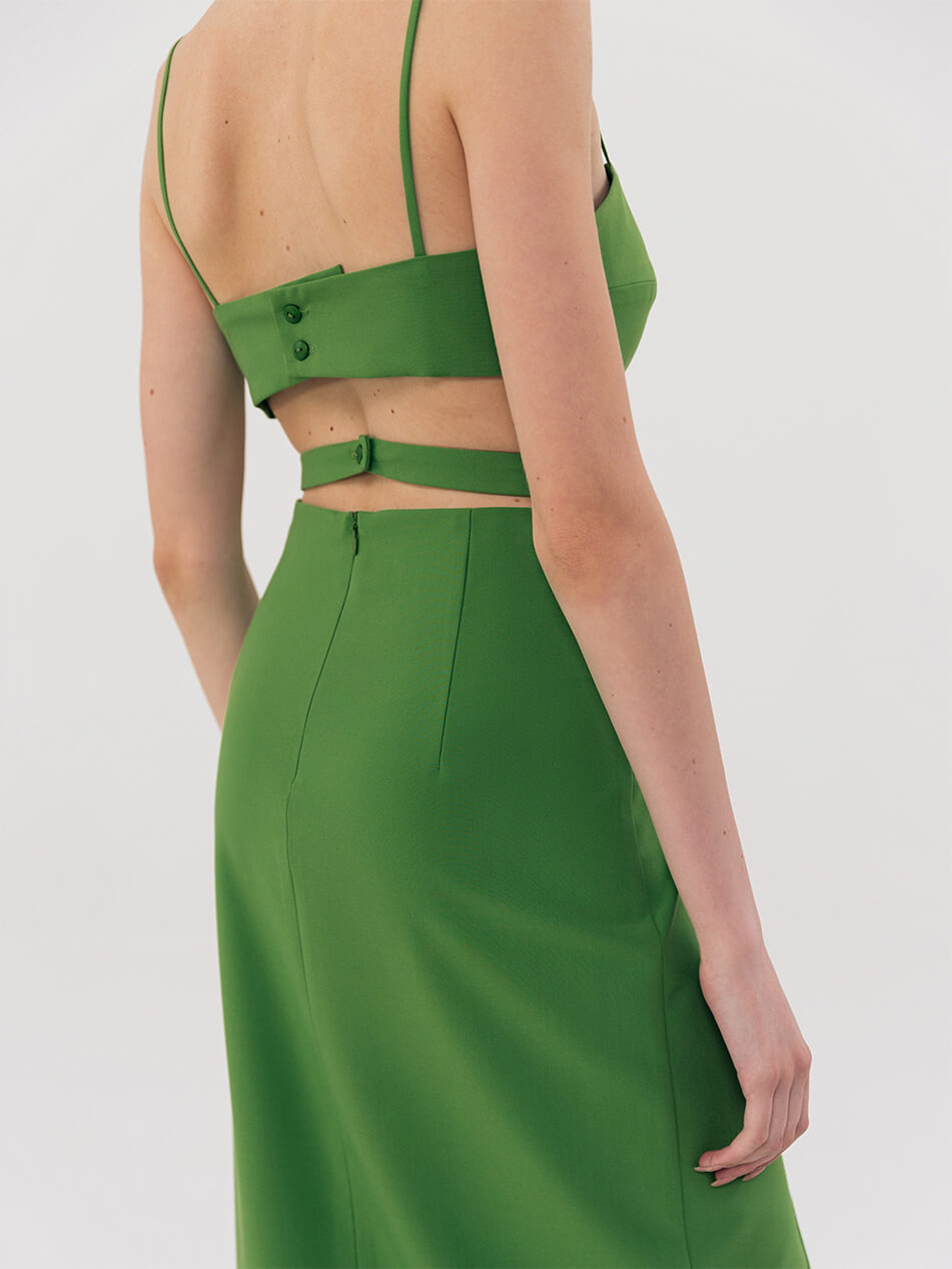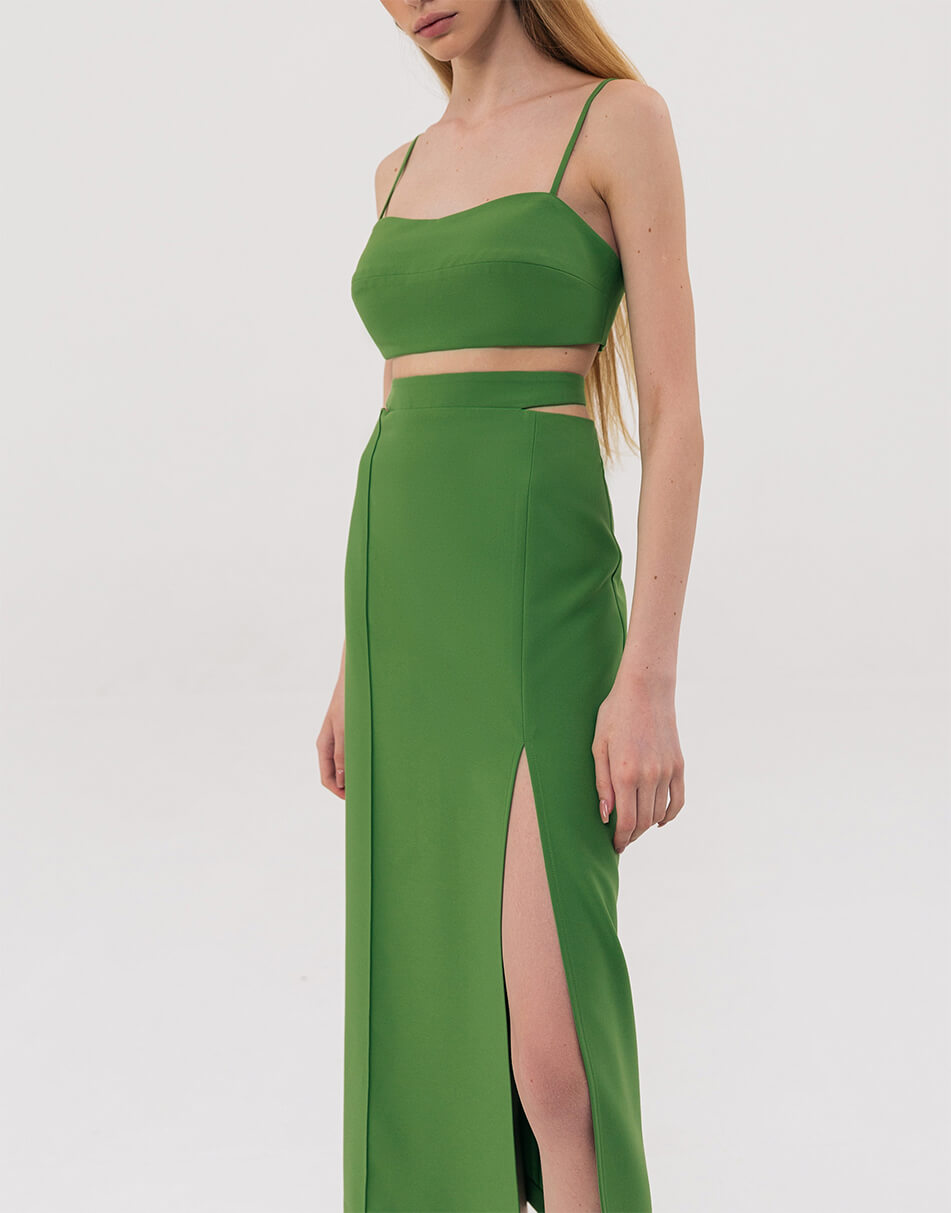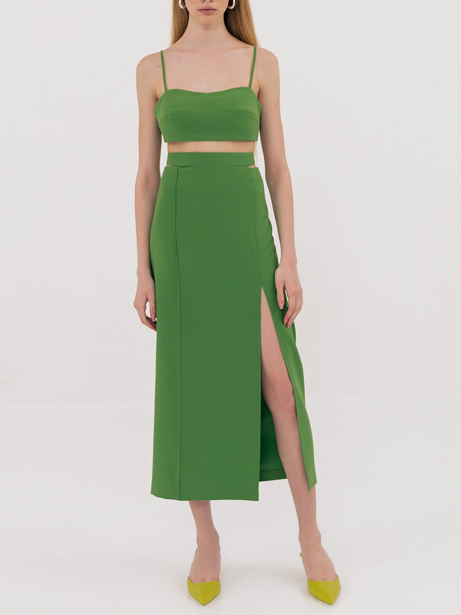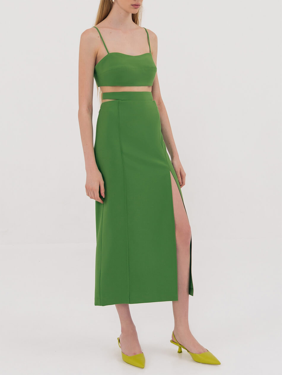 Найпровокаційніший фасон спідниці в новому сезоні обзавівся вирізами на талії. Вузька спідниця-олівець, що облягає стегна, з розрізом попереду. Ззаду застібається на блискавку, пояс застібається на гудзик. Довжина виробу 92 см, довжина розрізу 57 см