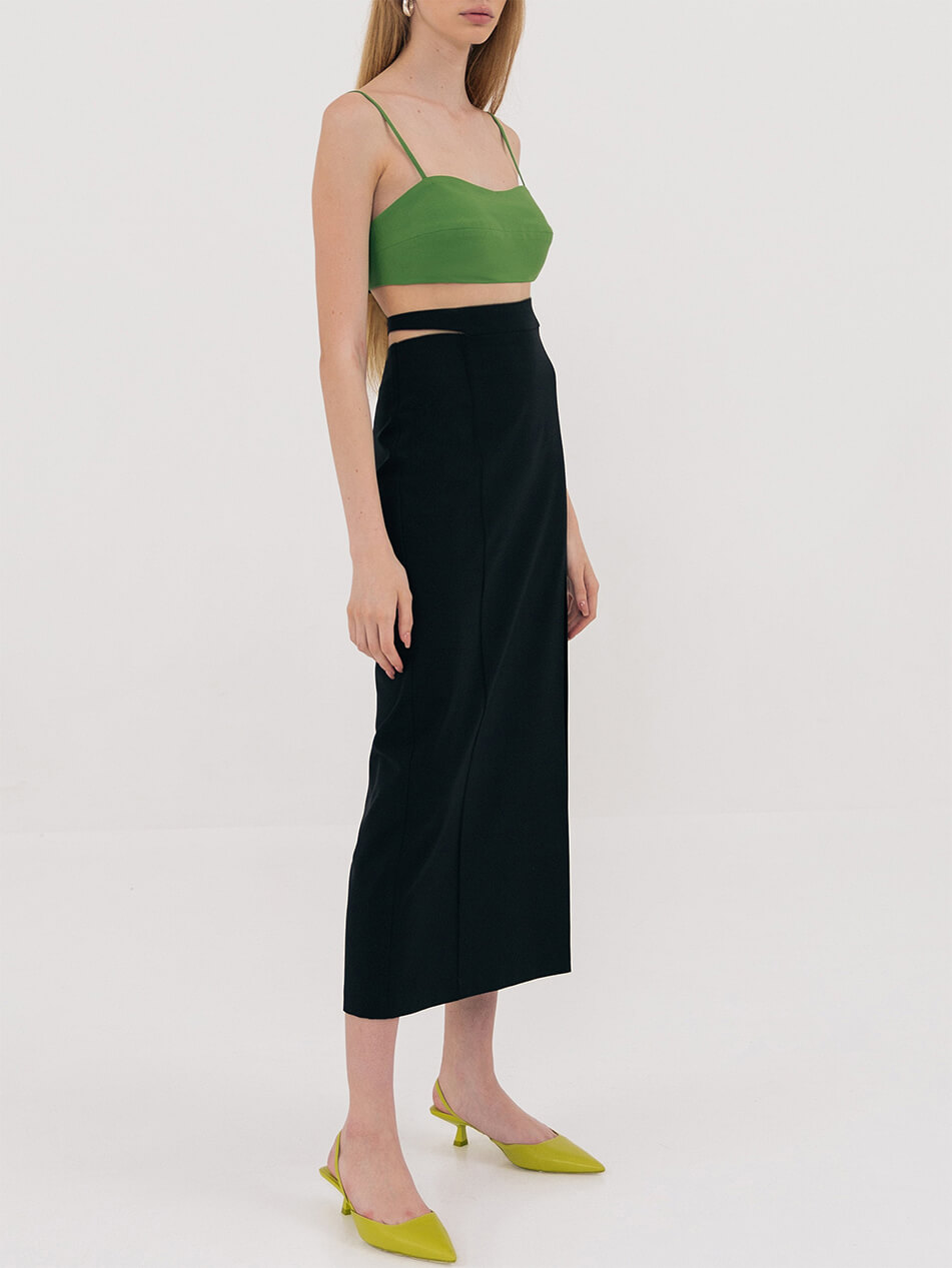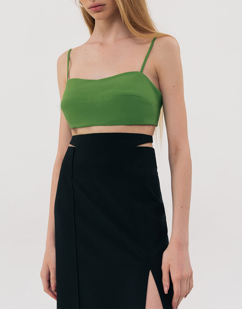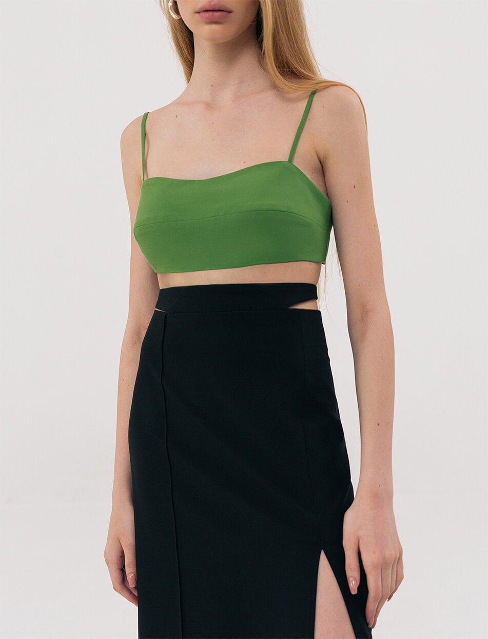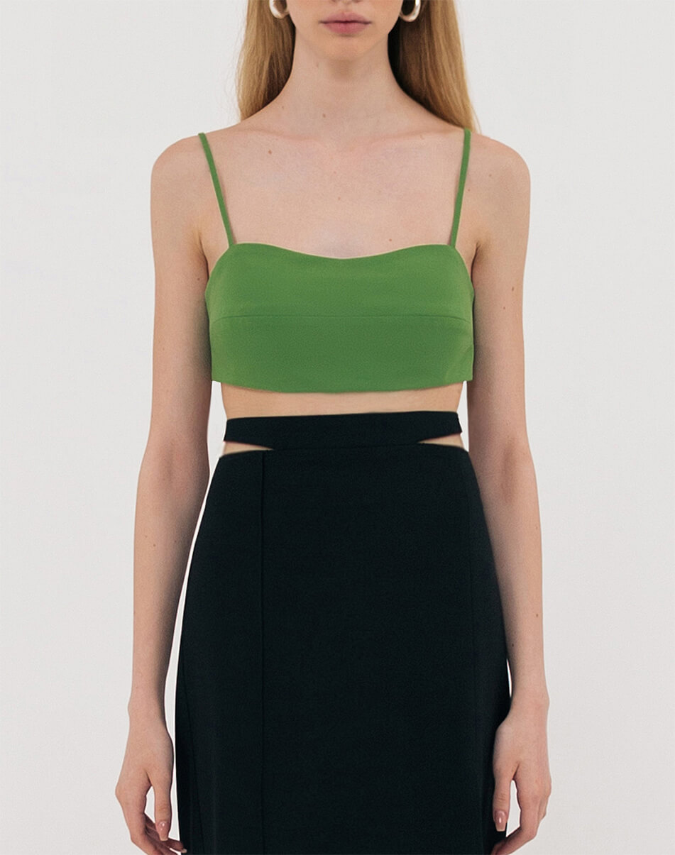 Короткий топ на тонких бретелях із двох шарів тканини. Попереду – горизонтальна виточка. Сконструйований з урахуванням можливості носіння з бюстом та без. Ззаду застібається на 2 пуговиці. Довжина виробу на рівні шлейки по частині грудей, що виступає -17 см, довжина бретелі – 39 см, длина виробу по спинці на рівні шлейки – 6 см.