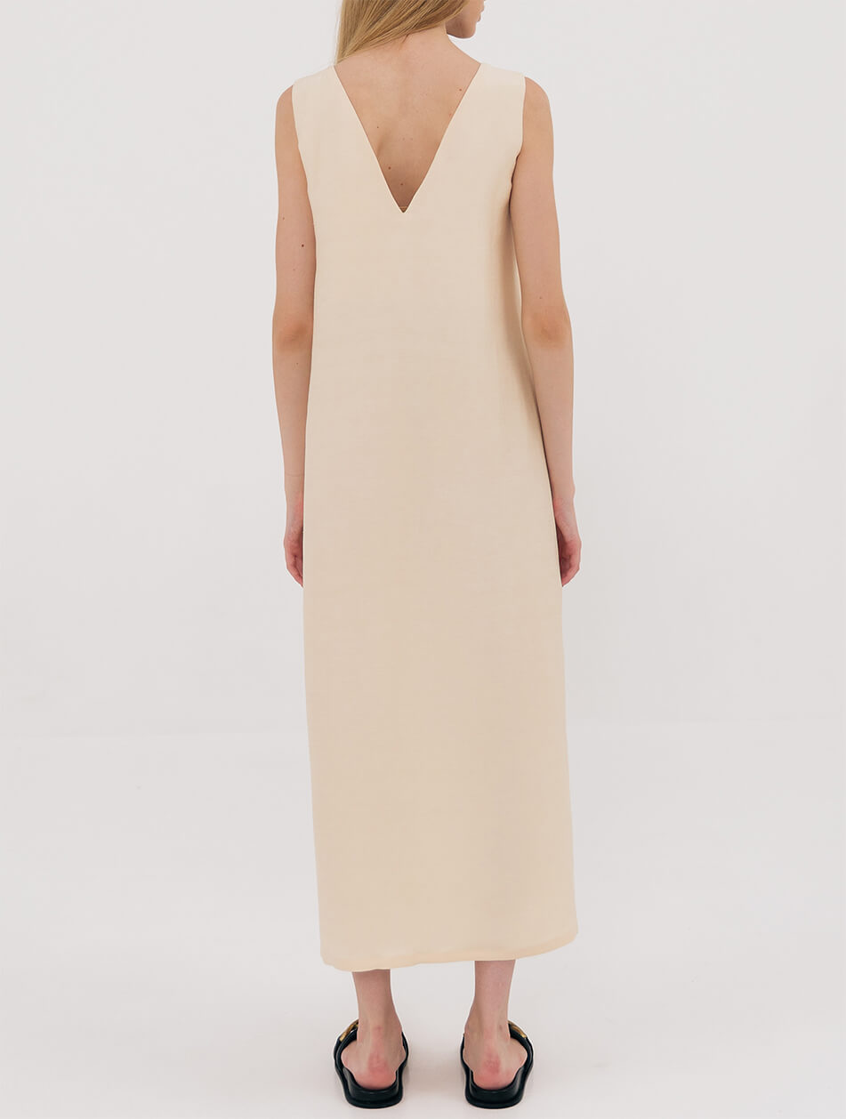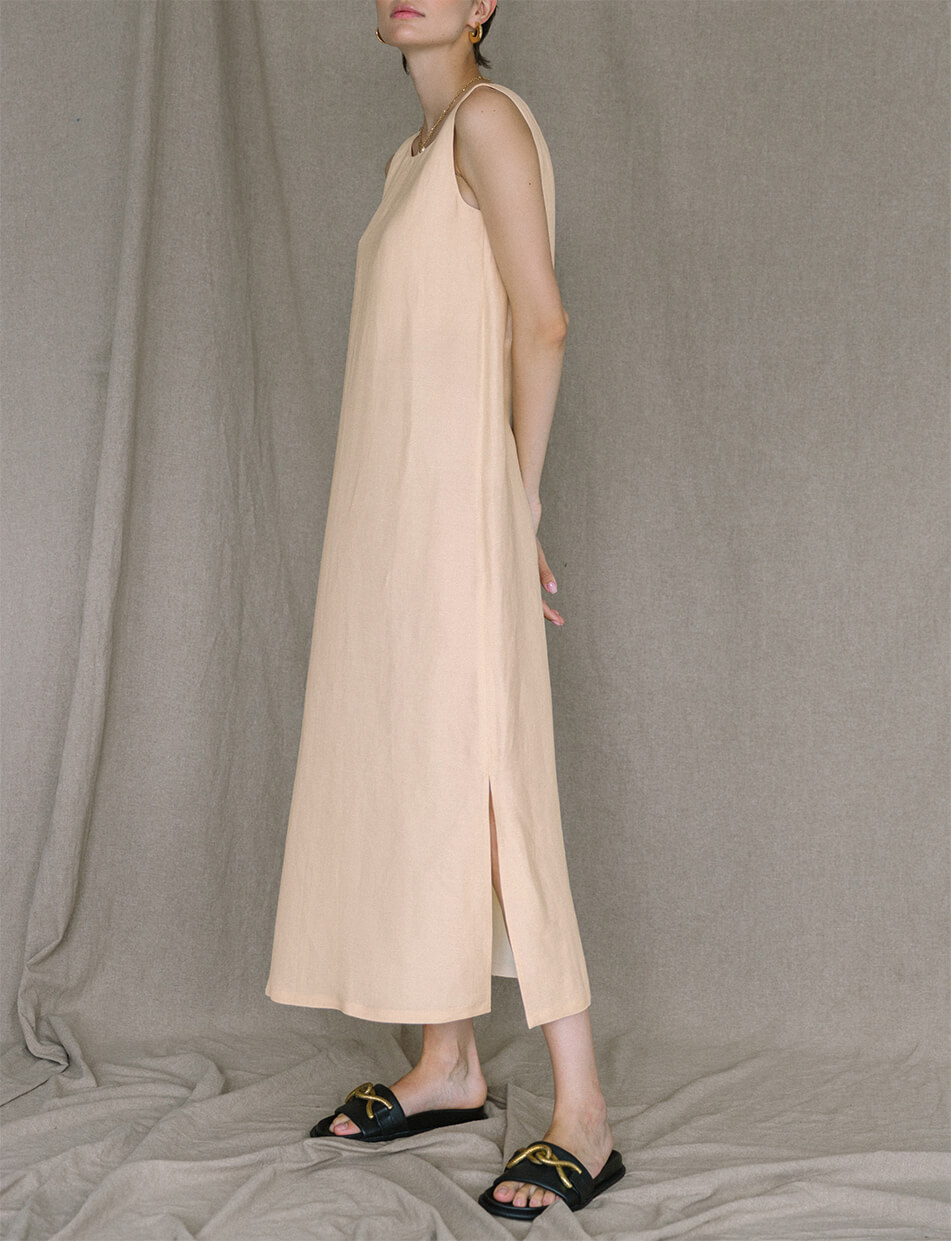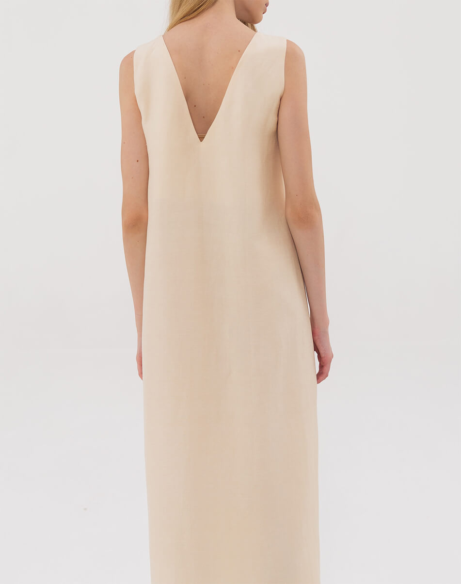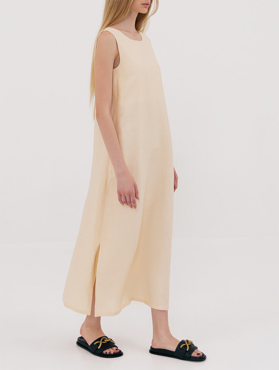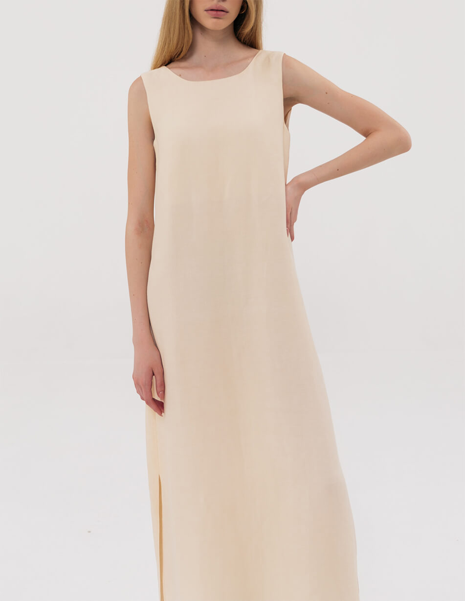 Базова легка сукня без рукавів. Виріб вільного крою з V-подібним вирізом на спинці. У бічних швах – розрізи. У цій сукні ви почуватиметеся затишно і комфортно в будь-якій обстановці. Підходить жінкам із будь-яким типом фігури. Довжина виробу 130 см, довжина розрізу см.