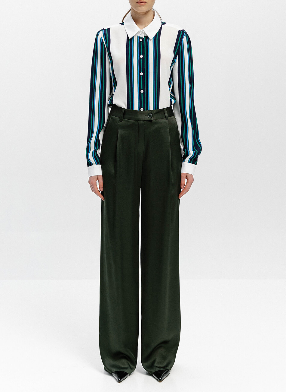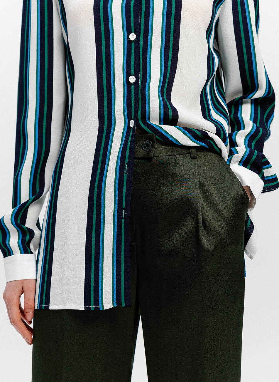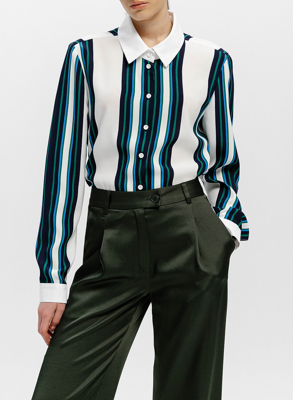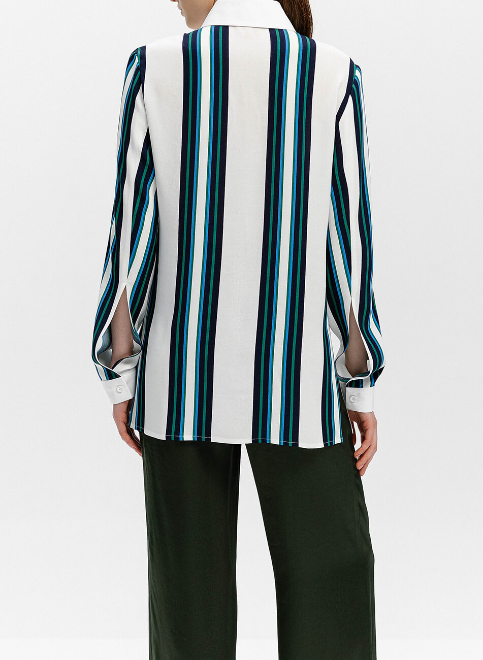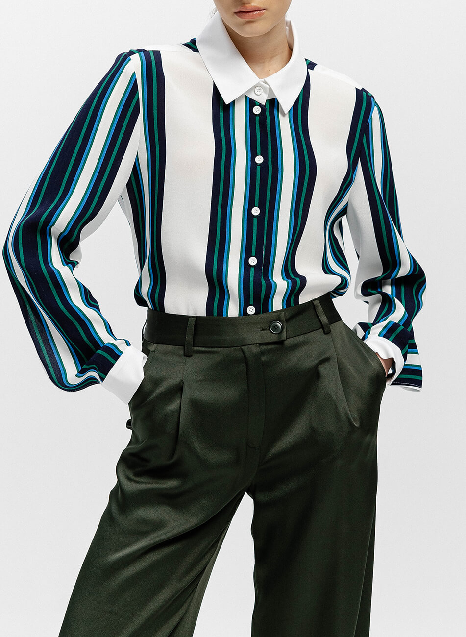 Базова сорочка прямого крою – справжня знахідка для модниць, що живуть у ритмі великого міста. Сорочка без виточок. З боків – розрізи. Від плеча на рукаві застрочено ліктьовий шов. Рукав закінчується манжетом на одному гудзику. Довжина виробу 74 см, висота розрізів із боків 20 см.