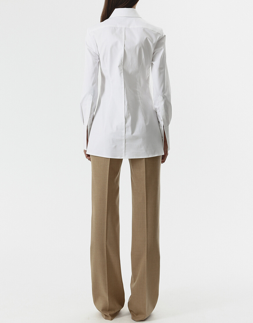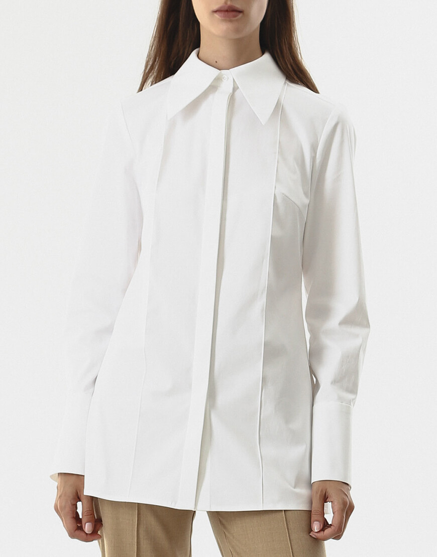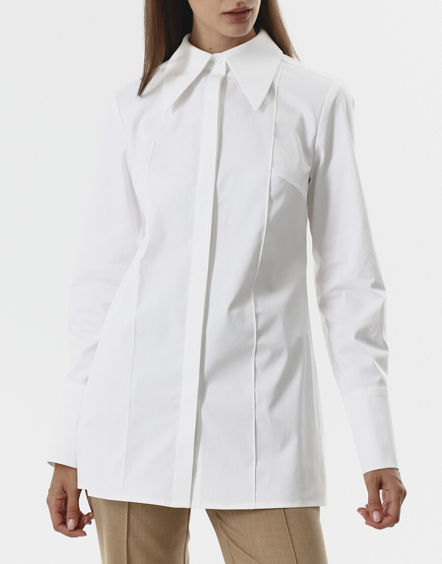Сорочка полуприлеглого силуету. Спереду декоративні застрочені рельєфи. Ззаду, для кращої посадки по фігурі, виїмки та застрочений декоративний середній шов. Довгий рукав закінчується широким манжетом на двох ґудзиках. Довжина виробу 73 см.
