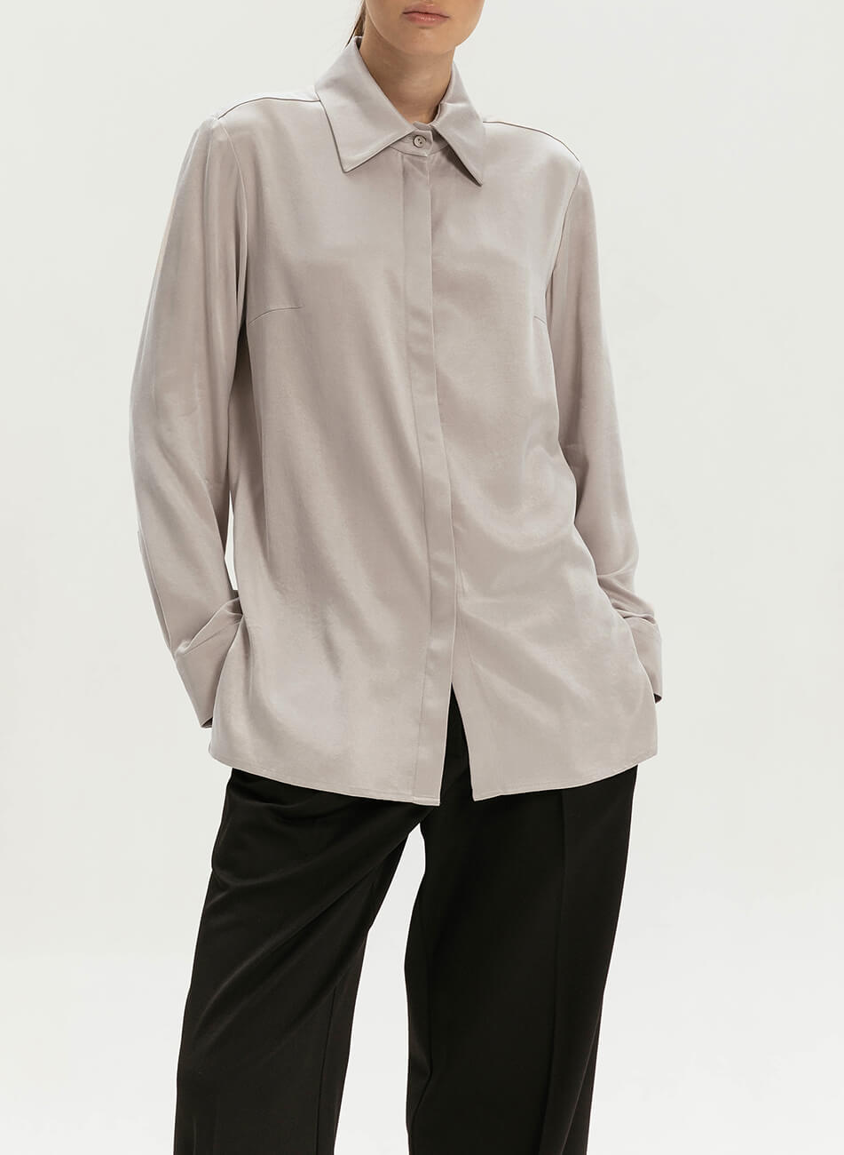Лаконічна блуза прямого крою з розрізами по боках — must have гардероба кожної модниці. Виготовлена з віскози-купри, властивості якої близькі до натурального шовку. М’яка, приємна до тіла, ця тканина пропускає повітря і зберігає тепло. Довгий рукав закінчується манжетом на одну ґудзик. На спинці — кокетка. Довжина виробу — 74 см, висота бокових розрізів — 18 см.
