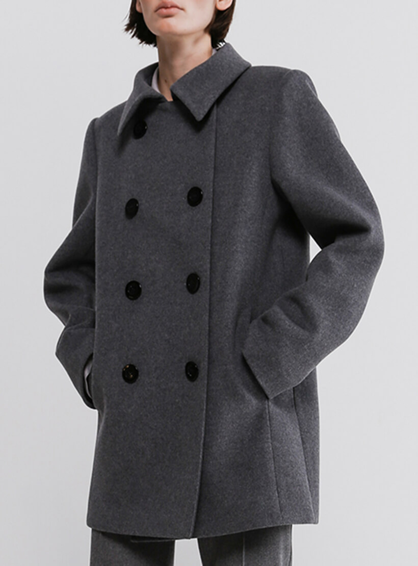 Укорочене двобортне пальто прямого силуету з рубашечним воротником в стилі кежуал. Спереду пальто застібається на ґудзики. З двох сторін прорізні кармани. Довжина виробу — 85 см.