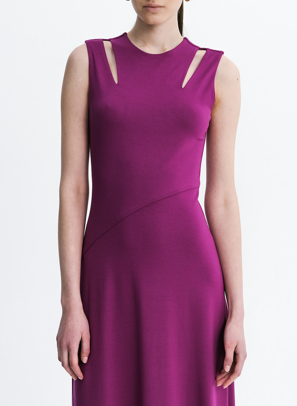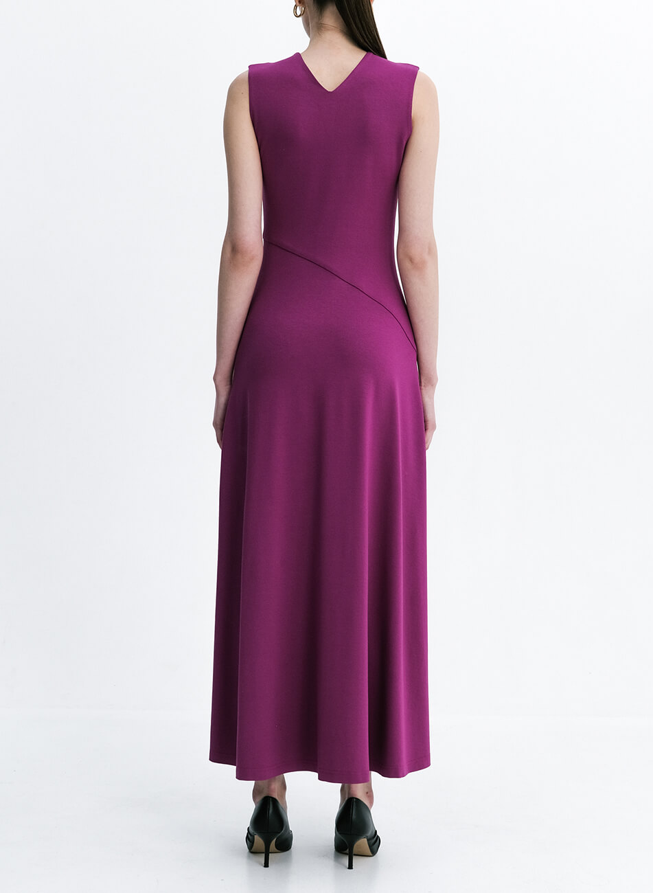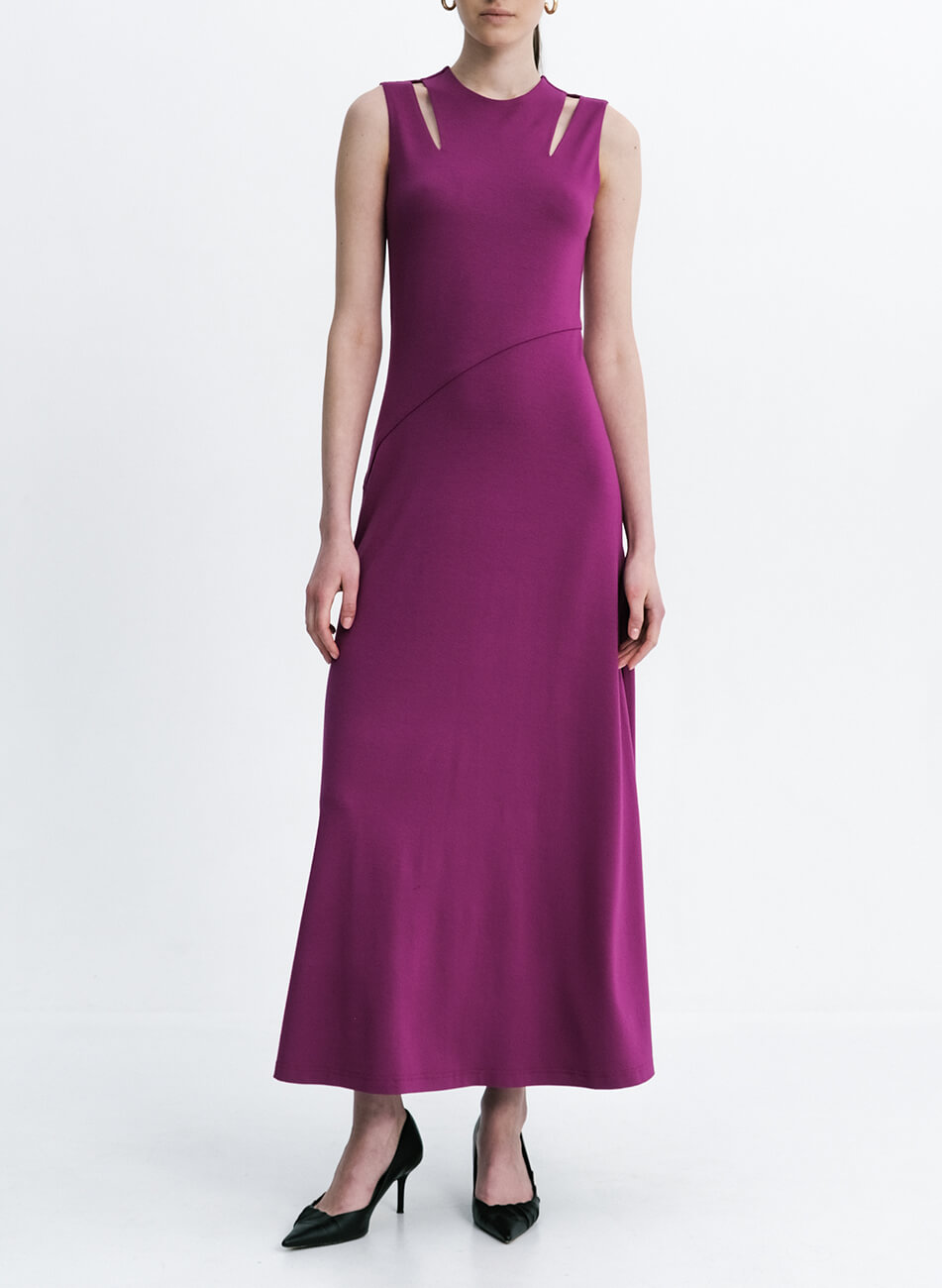Елегантна максі сукня, яка підкреслює жіночність і витонченість. Приталений силует чудово сидить по фігурі, а елегантні вирізи відкривають лінію ключиць, надаючи образу спокусливості та витонченості. Спідниця асиметрична, відрізається по лінії талії, розширюючись до низу. Сукня без застібки, що додає легкості та комфорту в носінні.