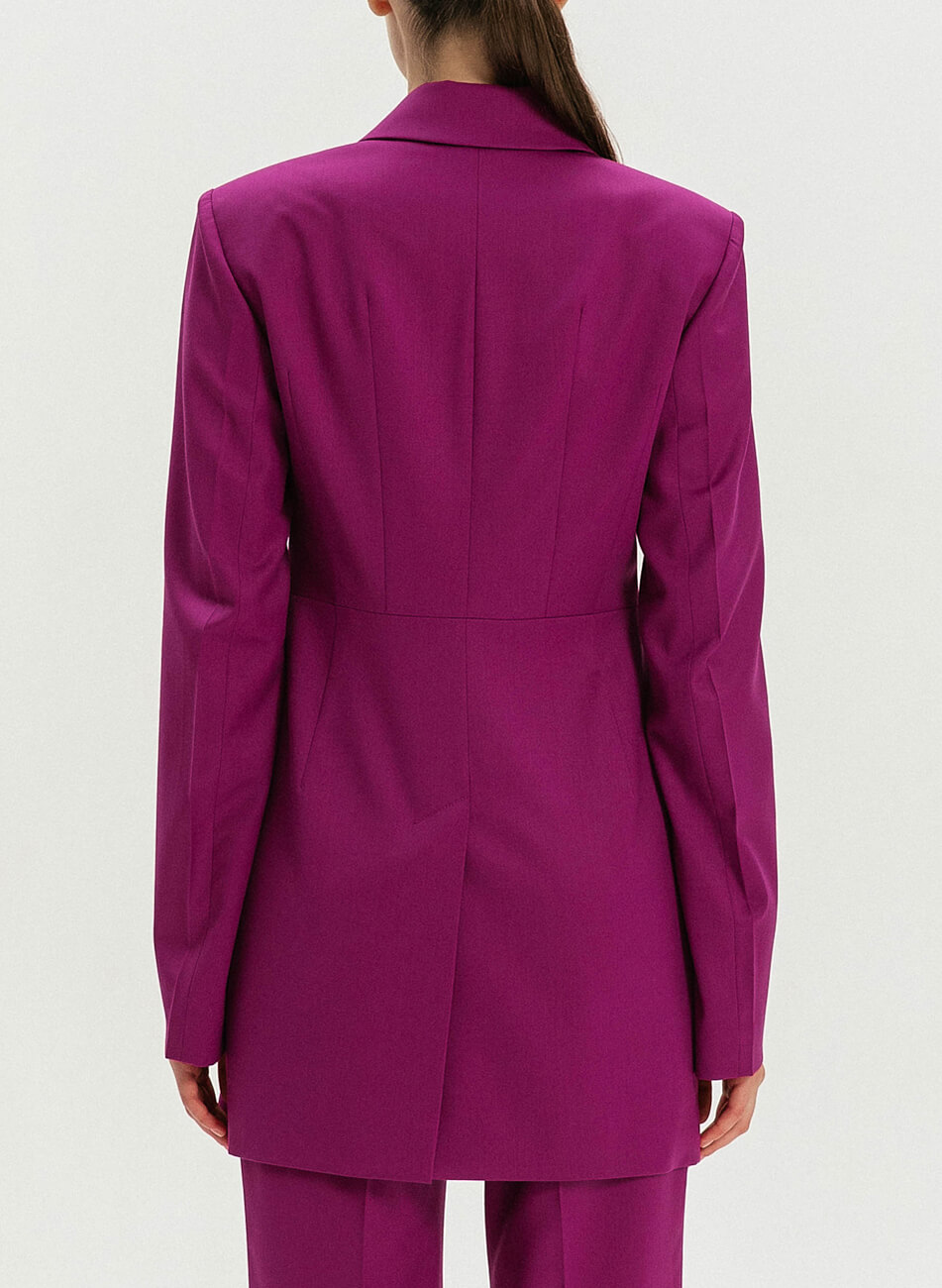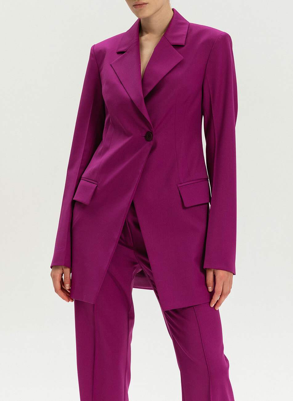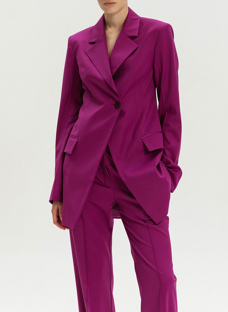 Елегантний жакет прилеглого силуету на підкладці. Виконаний із високоякісної італійської вовни. Спереду жакет застібається на один зовнішній гудзик і один внутрішній для кращої фіксації на талії. З двох боків прорізні кишені із клапанами. Додаткові вертикальні виточки ззаду та відрізна лінія талії покращують посадку та візуально зменшують об’єми. Свободу руху забезпечує шліца. Довжина виробу 79 см.