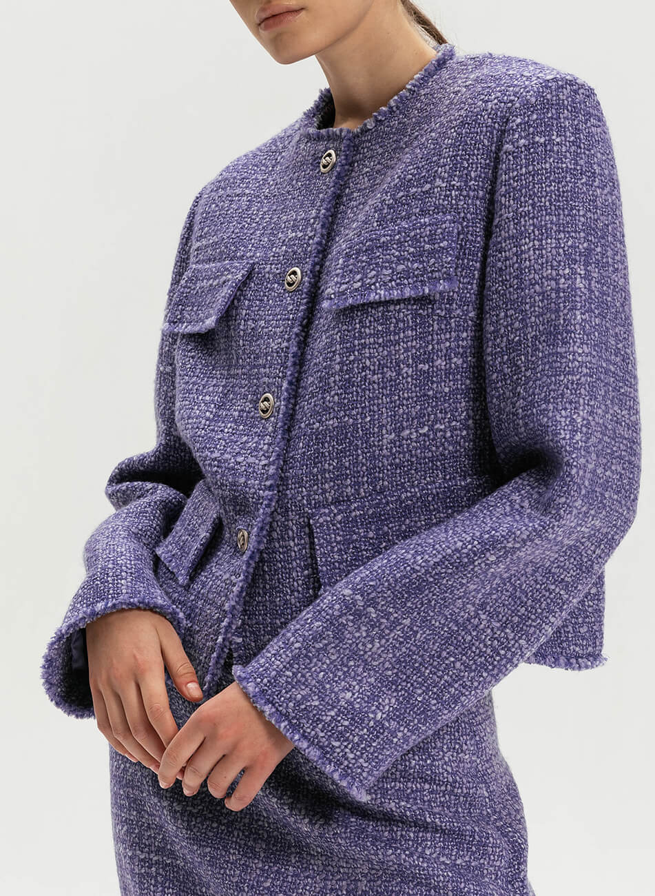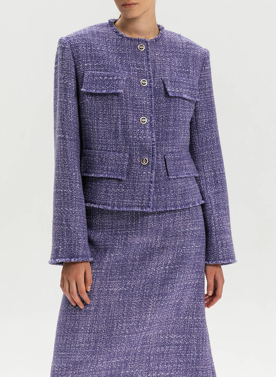 Шерстяний твідовий жакет з підкресленою лінією плеча. Свіжий колір сирені додасть ніжності будь-якому образу. Модель прямого силуету, всередині – віскозна підкладка в тон. Спереду – кармани-обманки з клапанами. Застібається на чотири ґудзики. Довжина виробу 54 см.