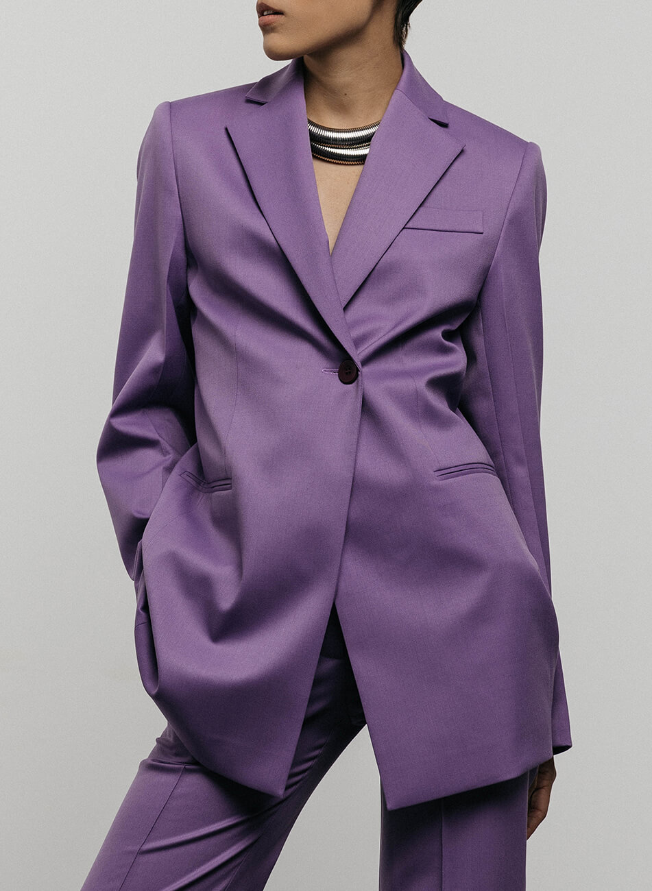 Ефектний жакет прямого крою з коміром. Підходить жінкам різного віку, які не бояться виглядати яскраво і розкішно. Відмінною деталлю жакета є нестандартно розташовані гудзики та петля, які дозволяють застібати його у двох варіантах. Залежно від вибору гудзика, регулюється об’єм піджака в області талії та стегон. Чіткість лінії плеча забезпечують підплічники. На спинці – застрочені нагору виточки. Спереду – дві кишені в рамку і одна – кишеня-обманка. Свободу руху забезпечує шліца. Довжина виробу 78 см.