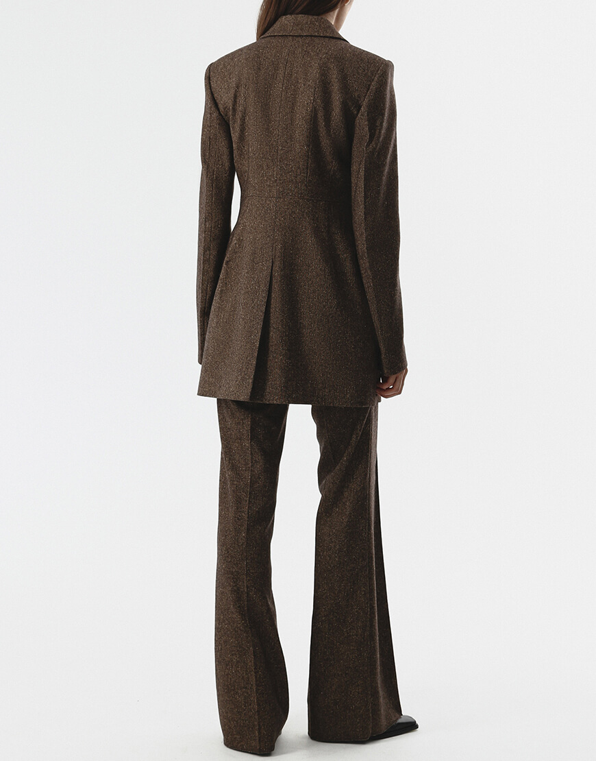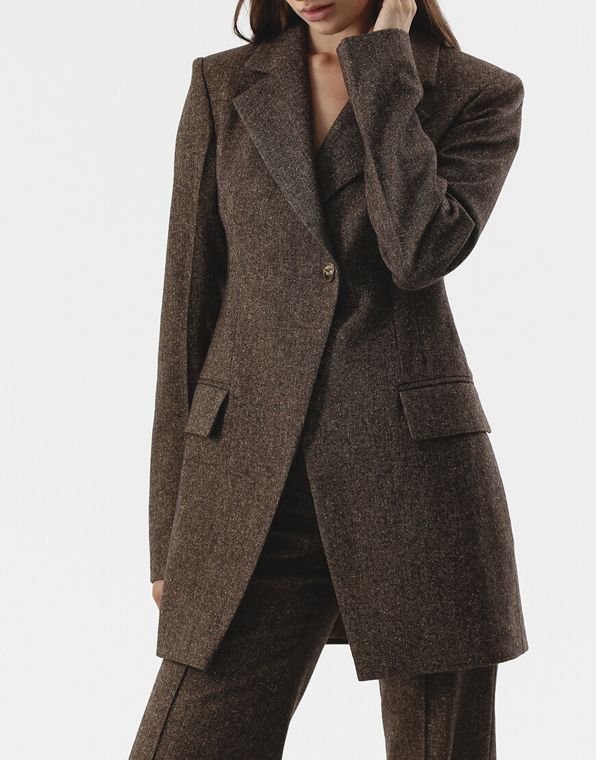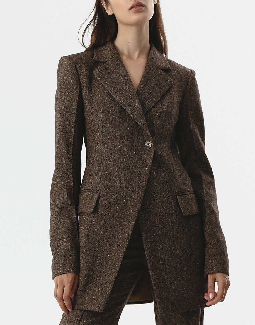 Елегантний жакет на підкладці прилеглого силуету. Виконаний з високоякісної італійської шерсті. Спереду жакет застібається на одну гудзик. З обох сторін прорізні кармани з клапанами. Додаткові вертикальні витачки ззаду та відрізна лінія талії покращують посадку і візуально зменшують об’єми. Свободу рухів забезпечує шліца. Довжина виробу 79 см.