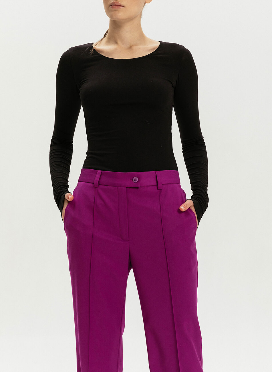 Стильні брюки прямого крою зі стрілками – завжди знахідка. Середня посадка. Ця модель з боковими кишенями підходить як для ділового образу, так і для вихідного дня та відрізняється своїм неймовірним комфортом і практичністю. Низ виробу оброблений оверлоком для індивідуальної підгонки під зріст жінки. Укоротити брюки безкоштовно можна в шоу-румі виробника. Довжина виробу 118 см, довжина штанини по внутрішньому шву 89 см.
