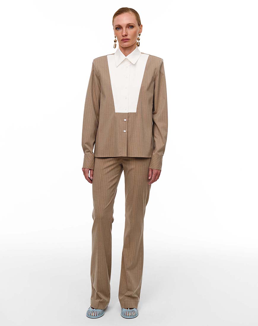 Доставка від 14 днівШтани виготовлені з якісного матеріалу у стриманому бежевому кольорі в тонку смужку, що візуально витягує силует. Дизайнерська архітектура підкреслена високою посадкою та бездоганним прямим кроєм, який ідеально сидить по фігурі.