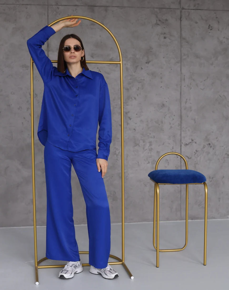Штани Електро — це втілення вишуканості та бездоганного комфорту у вашому гардеробі. Модель виконана з розкішного полотна, що на половину складається з натурального шовку та бавовни. Таке поєднання створює унікальну м’яку фактуру з делікатним блиском, яка надзвичайно приємна до тіла та забезпечує чудову терморегуляцію. Насичений синій відтінок додає образу свіжості та глибини, роблячи ці штани універсальним рішенням: від витончених повсякденних комплектів до елегантних виходів для особливих подій. Плавні лінії крою підкреслюють благородство тканини, створюючи легкий та впевнений силует.