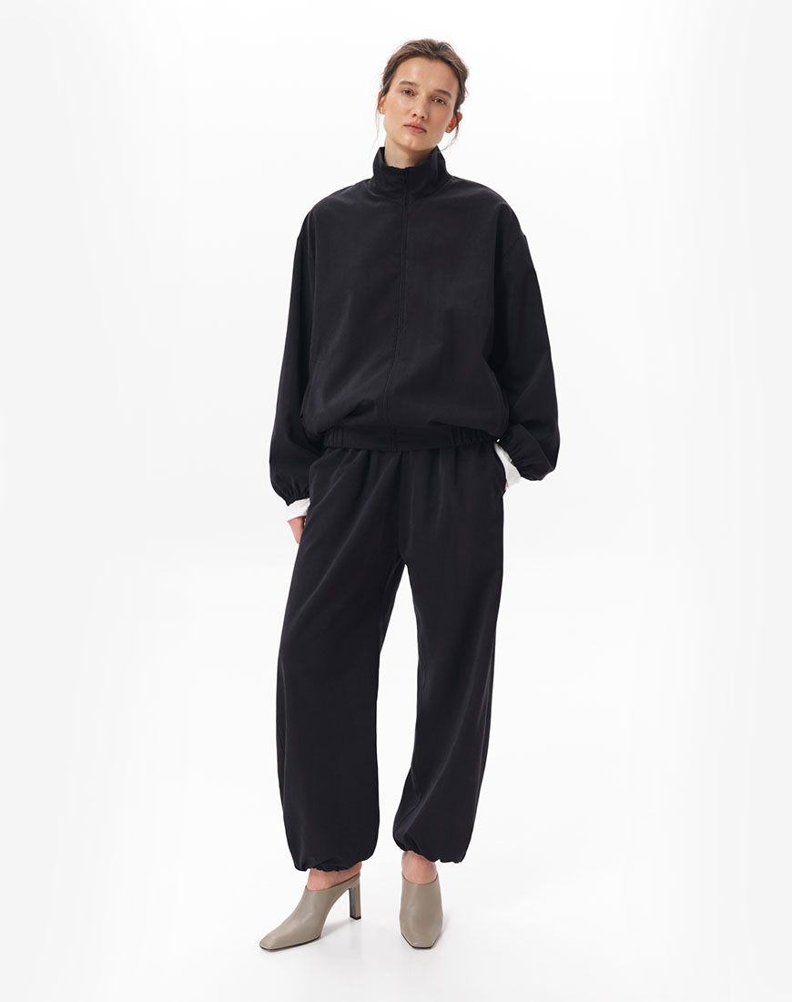 Доставка впродовж 5-7 робочих днівШтани з легкої технічної плащової тканини з оксамитовим фінішем. Вільний крій. Еластичний пояс. Бічні кишені. Унизу штанин — гумка-куліска, що дозволяє регулювати форму: носити модель прямою або трохи зібраною. Легко поєднуються з базовими речами або з вітровкою з цієї ж тканини.