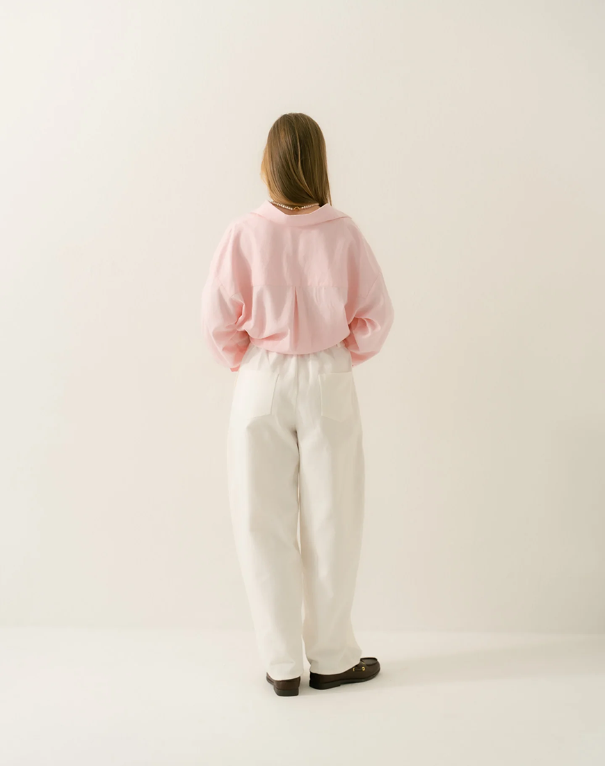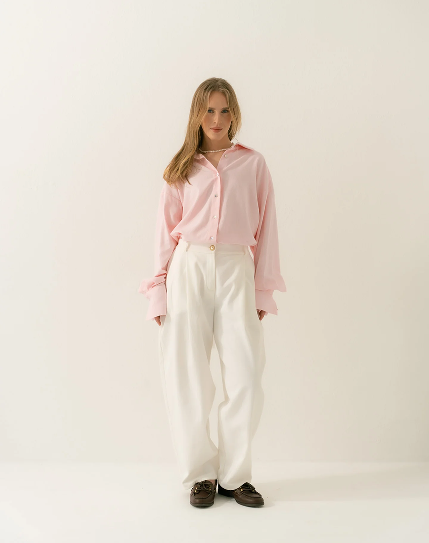 Доставка впродовж 5-14 робочих днівШтани виготовлені зі 100% бавовни представлені у ніжному молочному кольорі. Матеріал м’який і приємний до тіла, забезпечуює комфорт протягом усього дня. Ця модель, доступна у трьох розмірах, підкреслює жіночний силует та додає витонченості образу. Вони чудово поєднуються з лонгслівами, футболками, сорочками та светрами, створюючи стильні повсякденні образи.