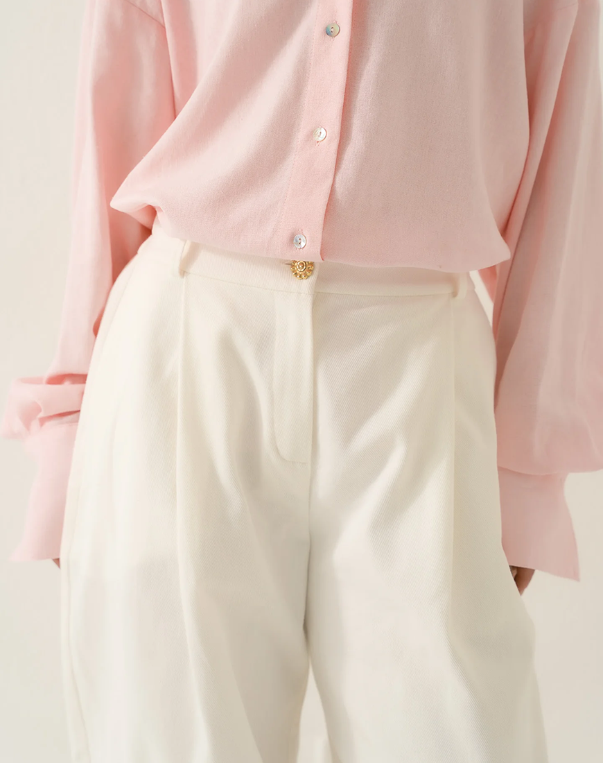 Штани доповнені фірмовим ґудзиком у формі квітки — витонченою деталлю, виготовленою вручну з латуні, що підкреслює унікальний характер виробу.
