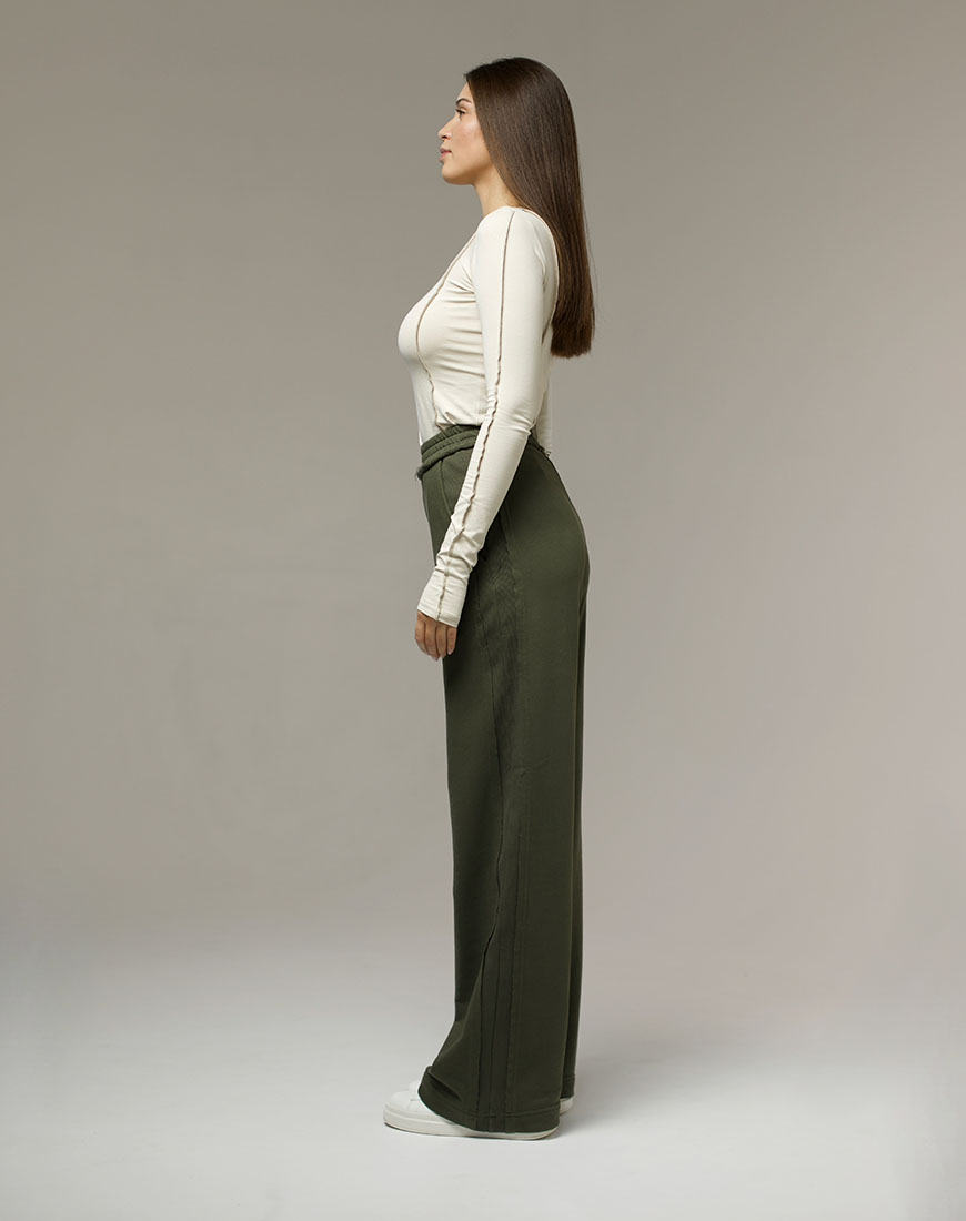Жіночі штани прямого крою зі стрілками та внутрішніми кишенями. Стильні штани зі швами назовні дуже комфортні, з ними можна зібрати безліч образів. Матеріалу властиве зминання завдяки натурального складу, тканина приємна до тіла та пропускає повітря.