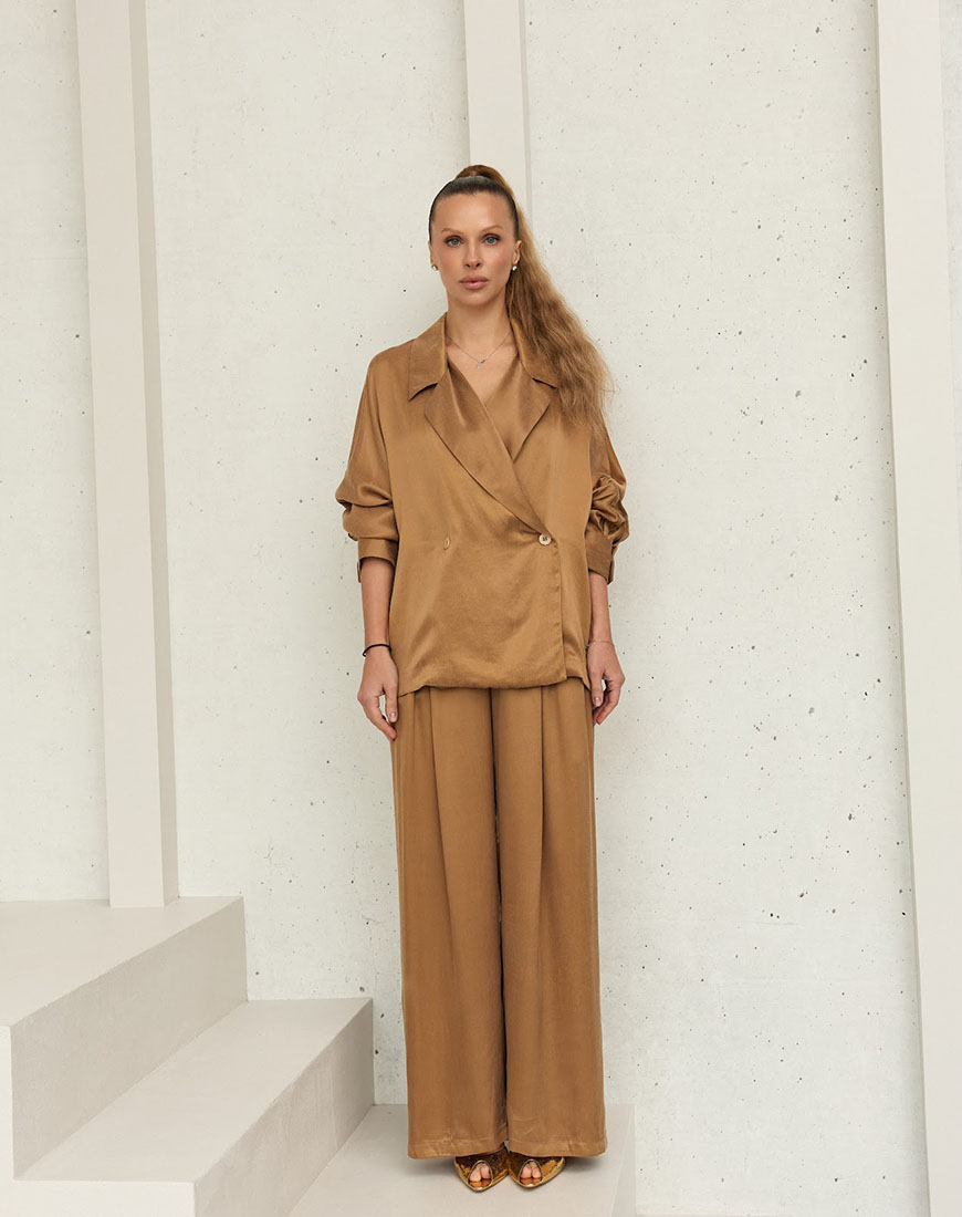 Доставка впродовж 5-7 робочих днівБрюки із защипами та середньою посадкою. Широкий прямий крій створює рівний, витягнутий силует. Пояс має внутрішню резинку з ґудзиком, що дозволяє регулювати посадку по талії.
