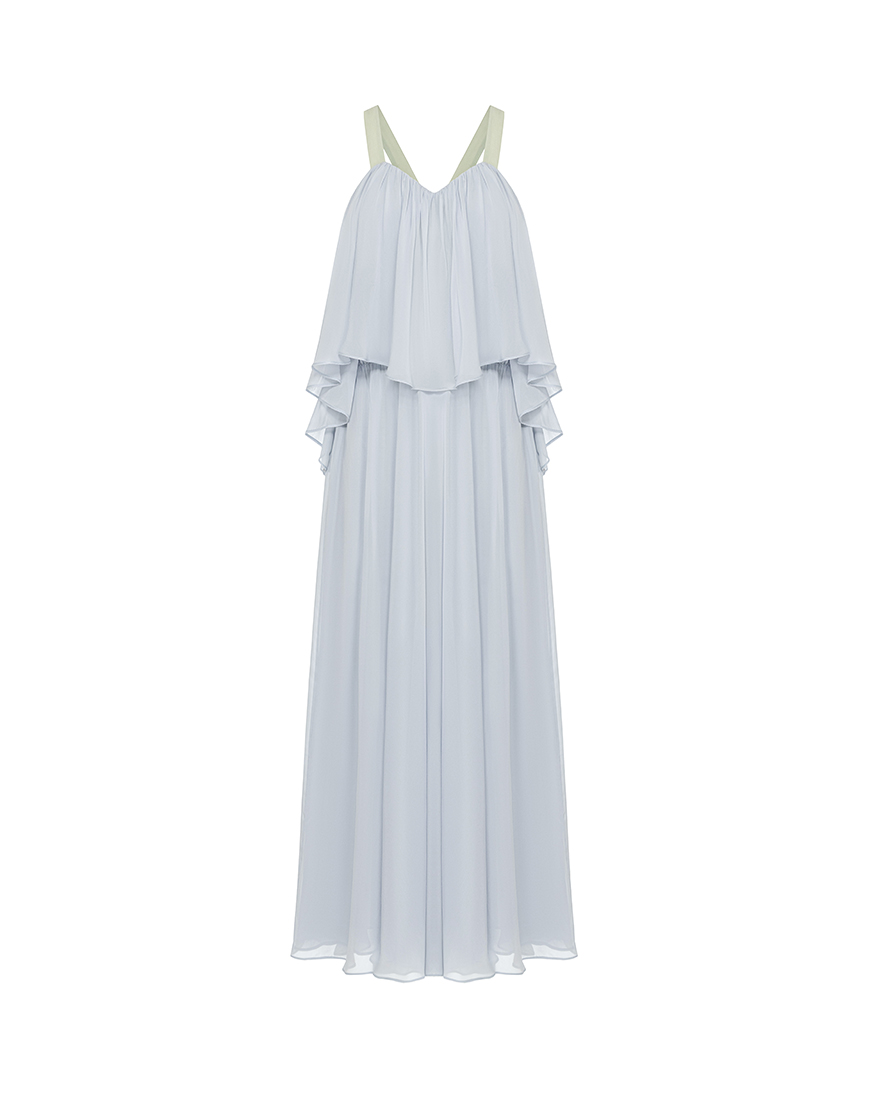 Сукня з воланом на грудях. Модель та волан розкроєні за косою, що створює неповторний ефект м’якого фалдування. Сукня на тонких бретелях, які зав’язуються на спинці витонченими бантами.
