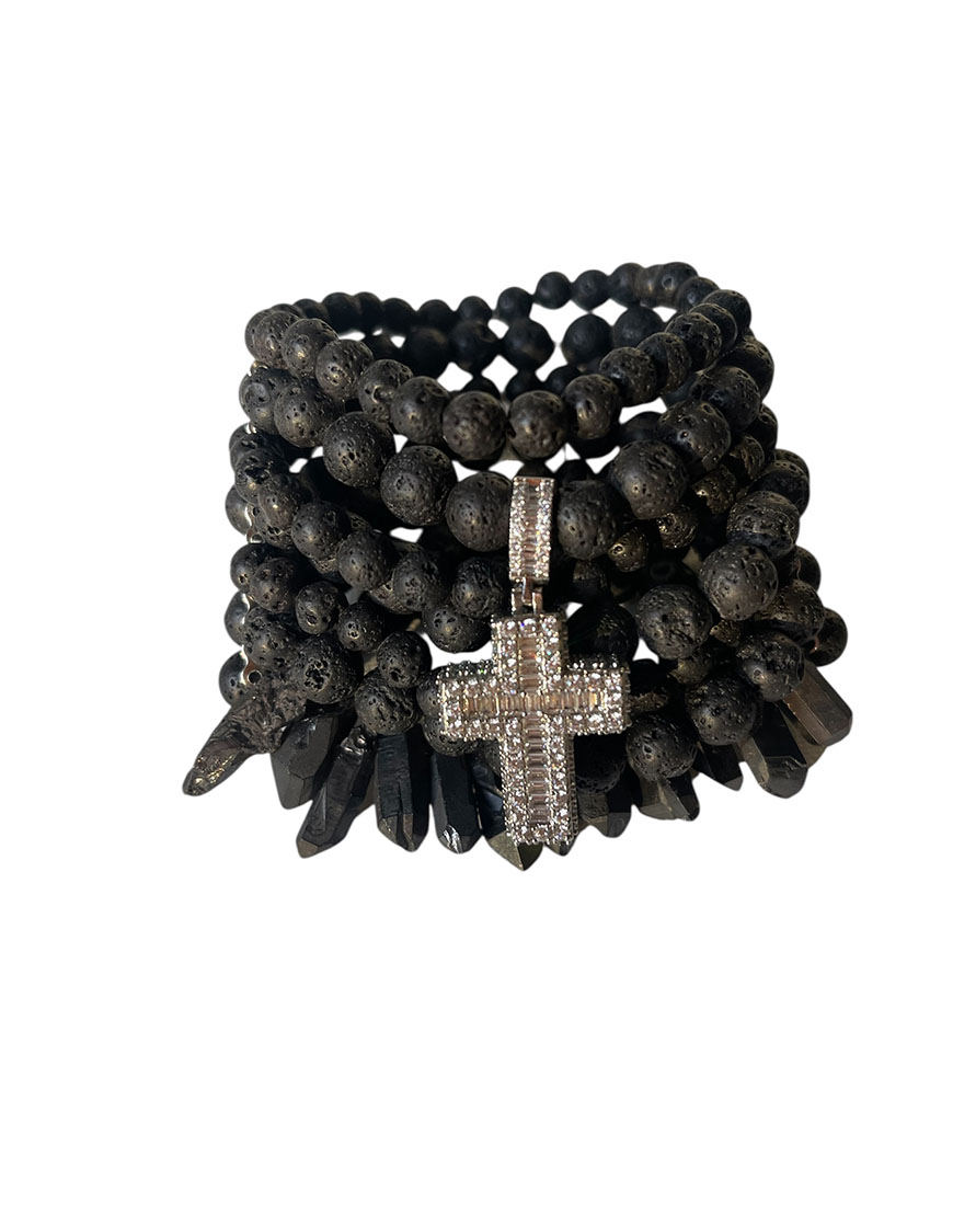 Доставка впродовж 2-5 робочих днівБраслет виготовлений із натурального каміння, прості намистини лави поєднані з виразним кварцем. Центральний елемент – хрест із цирконієм, який додає яскравий акцент.