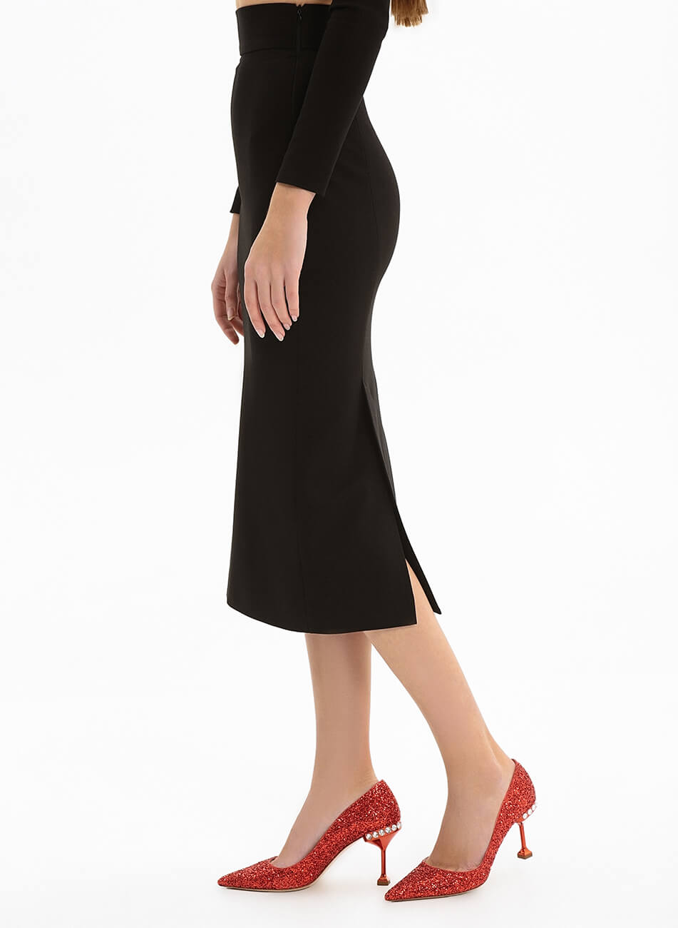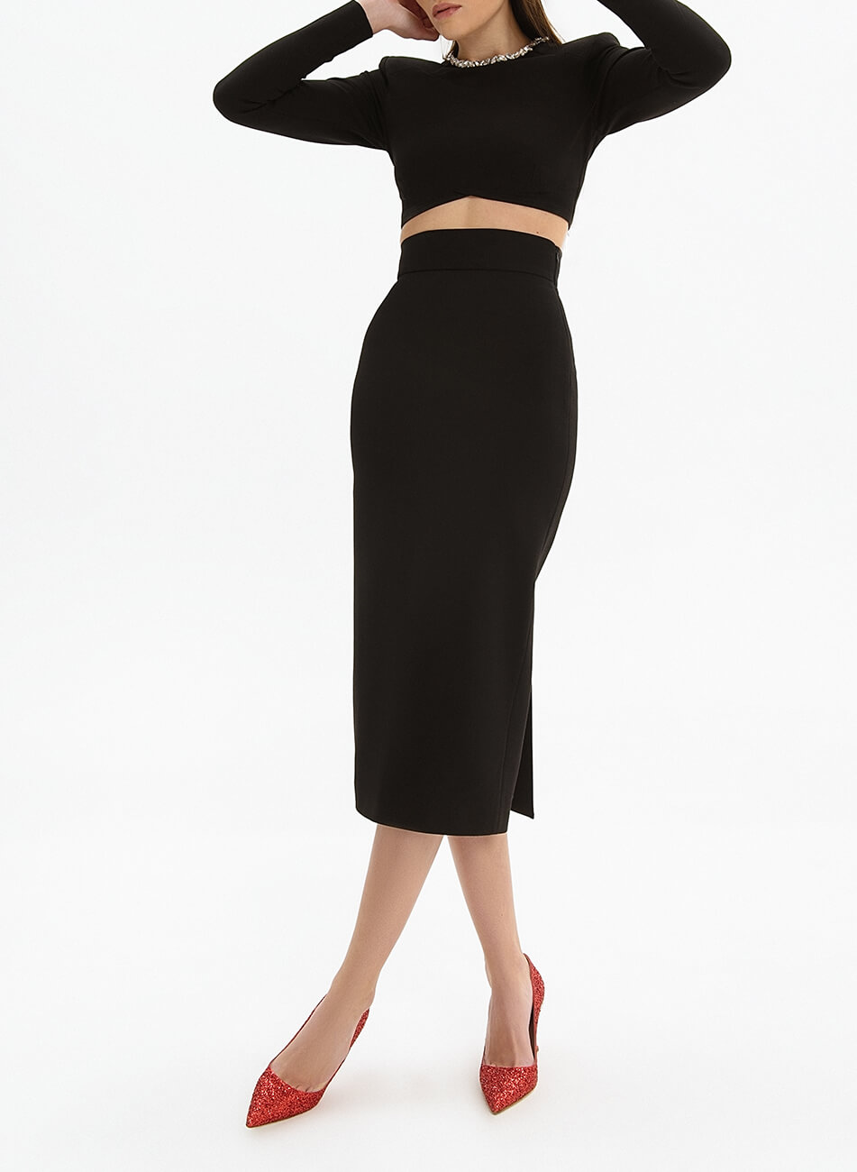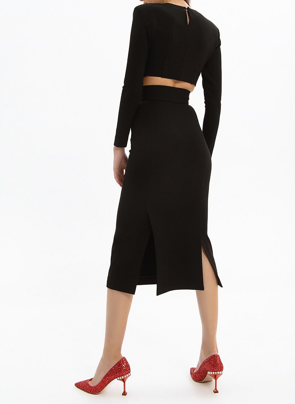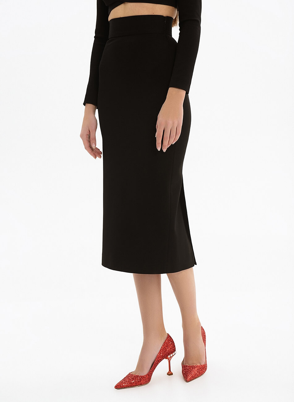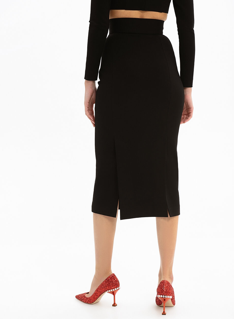 Спідниця прямого крою з двома шліцами ззаду. Спідниця виконана зі щільного трикотажу і має бандажний (стягуючий ефект).