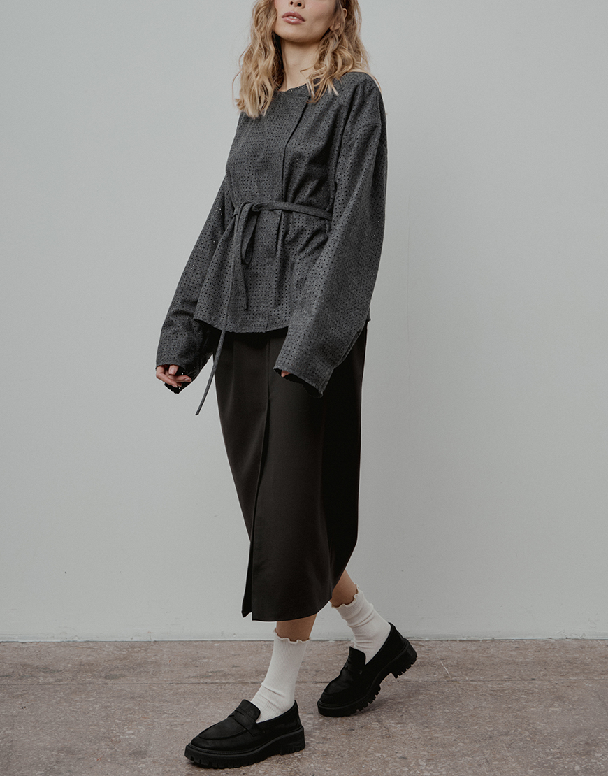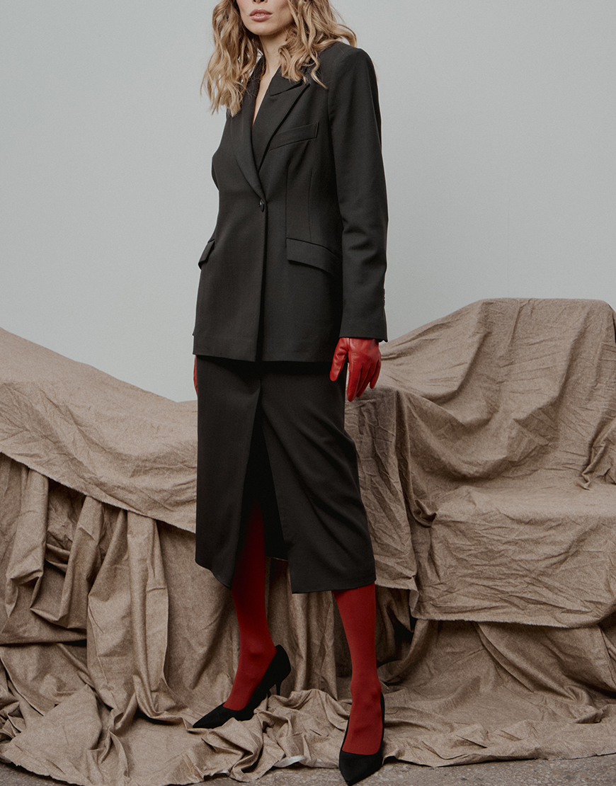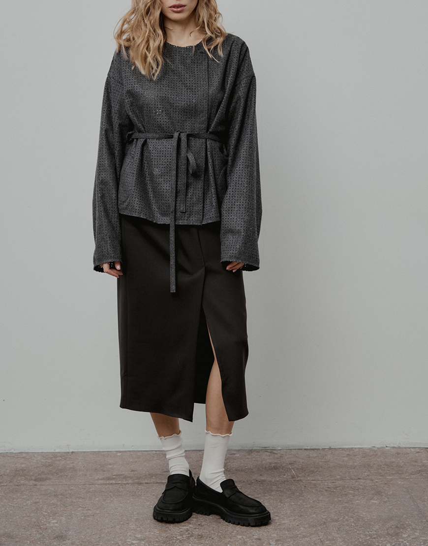 Спідниця має високий передній розріз, що поєднує сучасний стиль з класичним кроєм. Довжина міді додає елегантності, а розріз додає вишукану деталь, дозволяючи зручність рухів і створюючи витончений вигляд.