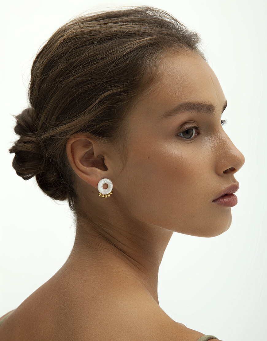 Сережки з вирізьбленого вручну перламутру, доповнені каплями срібла в позолоті