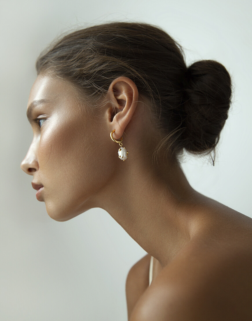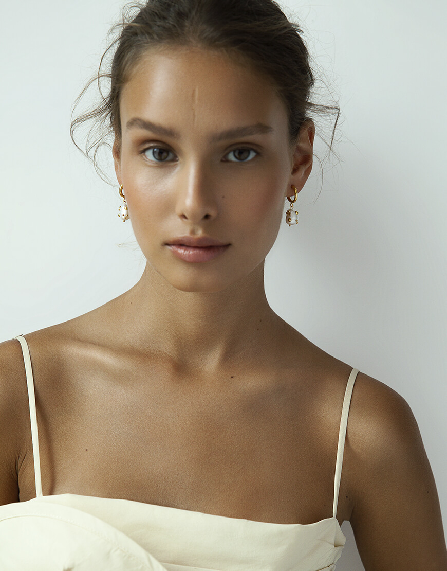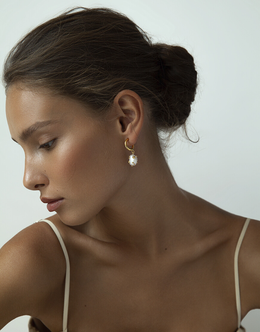 Сережки-кільця з білими бароковими перлинами, інкрустованих каплями срібла в позолоті