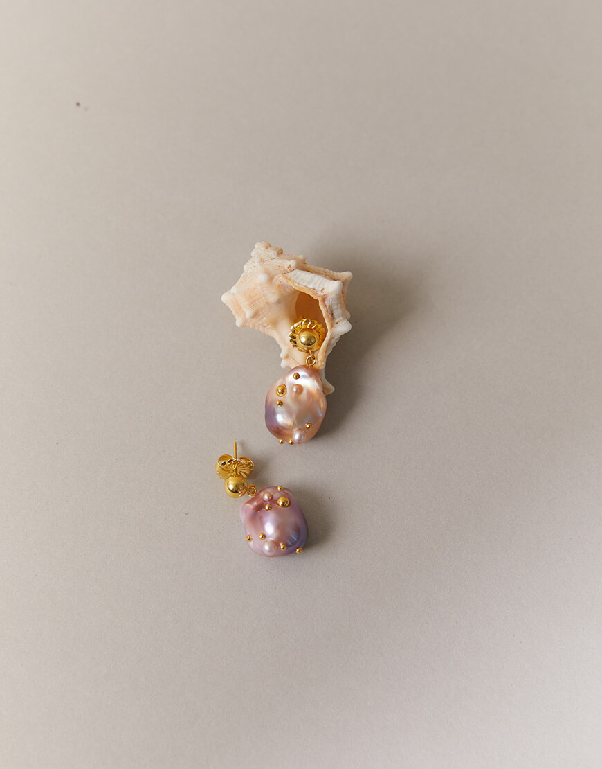 Доставка в течение 2-5 рабочих днейСережки цвяшки з бароковими перлинами пурпурово-персикового відтінку інкрустованими каплями срібла в позолоті та мініатюрними перлинами.