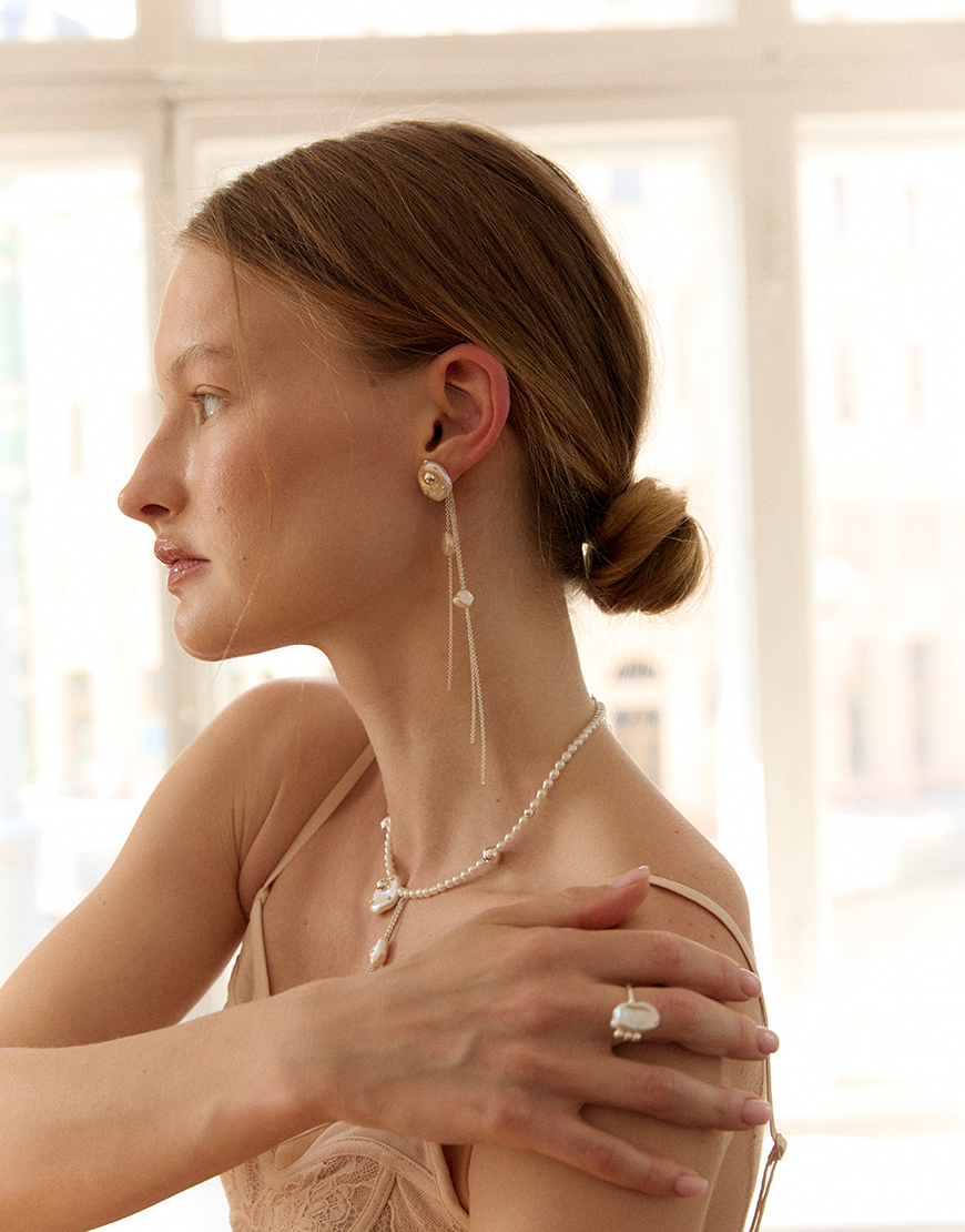 Доставка в течение 2-5 рабочих днейБілі барокові перлини, ніби витягнуті з морської глибини, інкрустовані срібними краплями – наче сліди води на шовку.