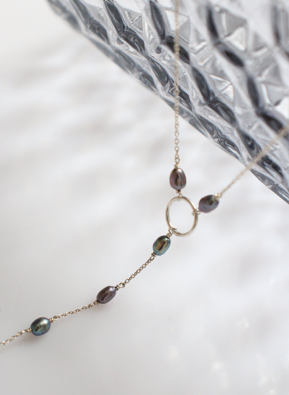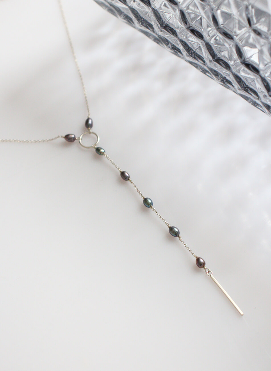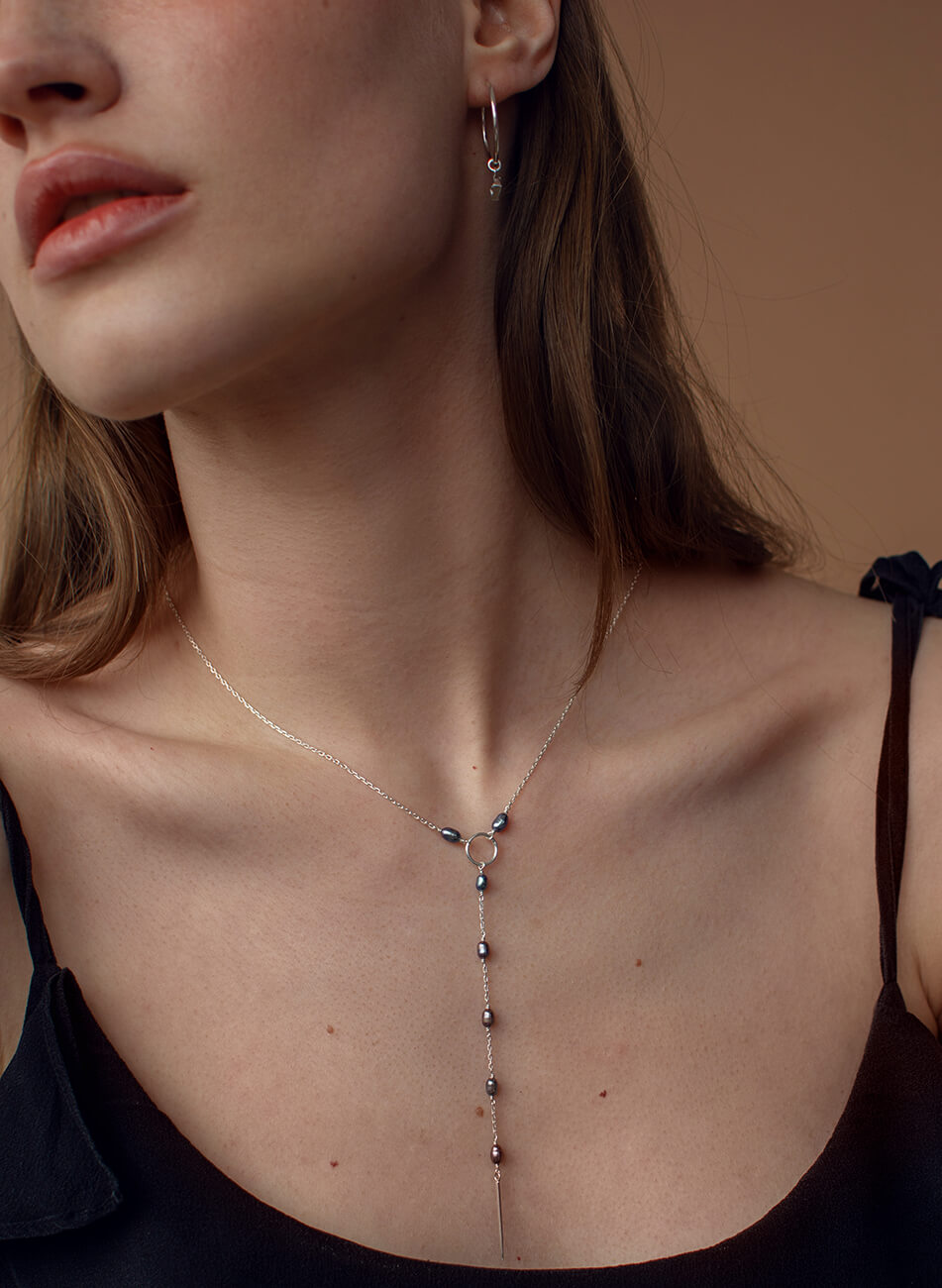Кольє краватка з чорними перлами та підвіскою паличкою
