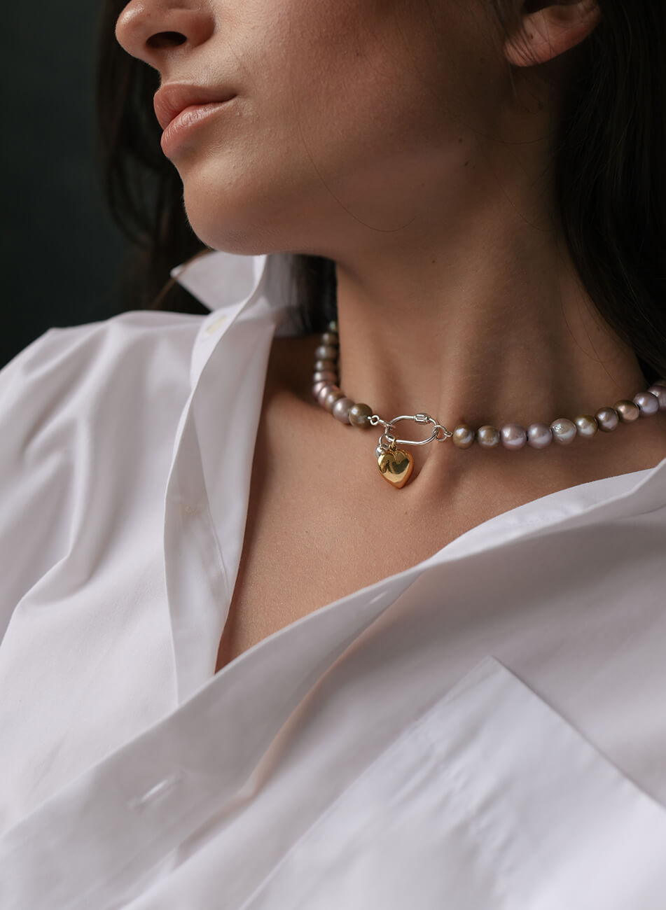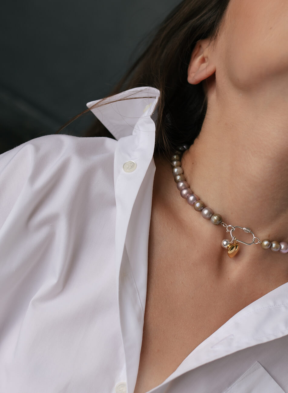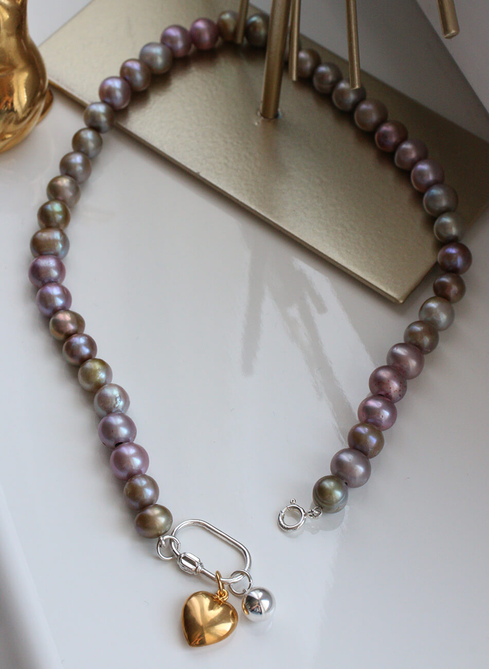 Намисто з перлів лавандового і оливкового відтінку з двома підвісами з різних металів
