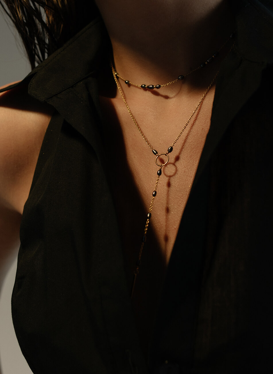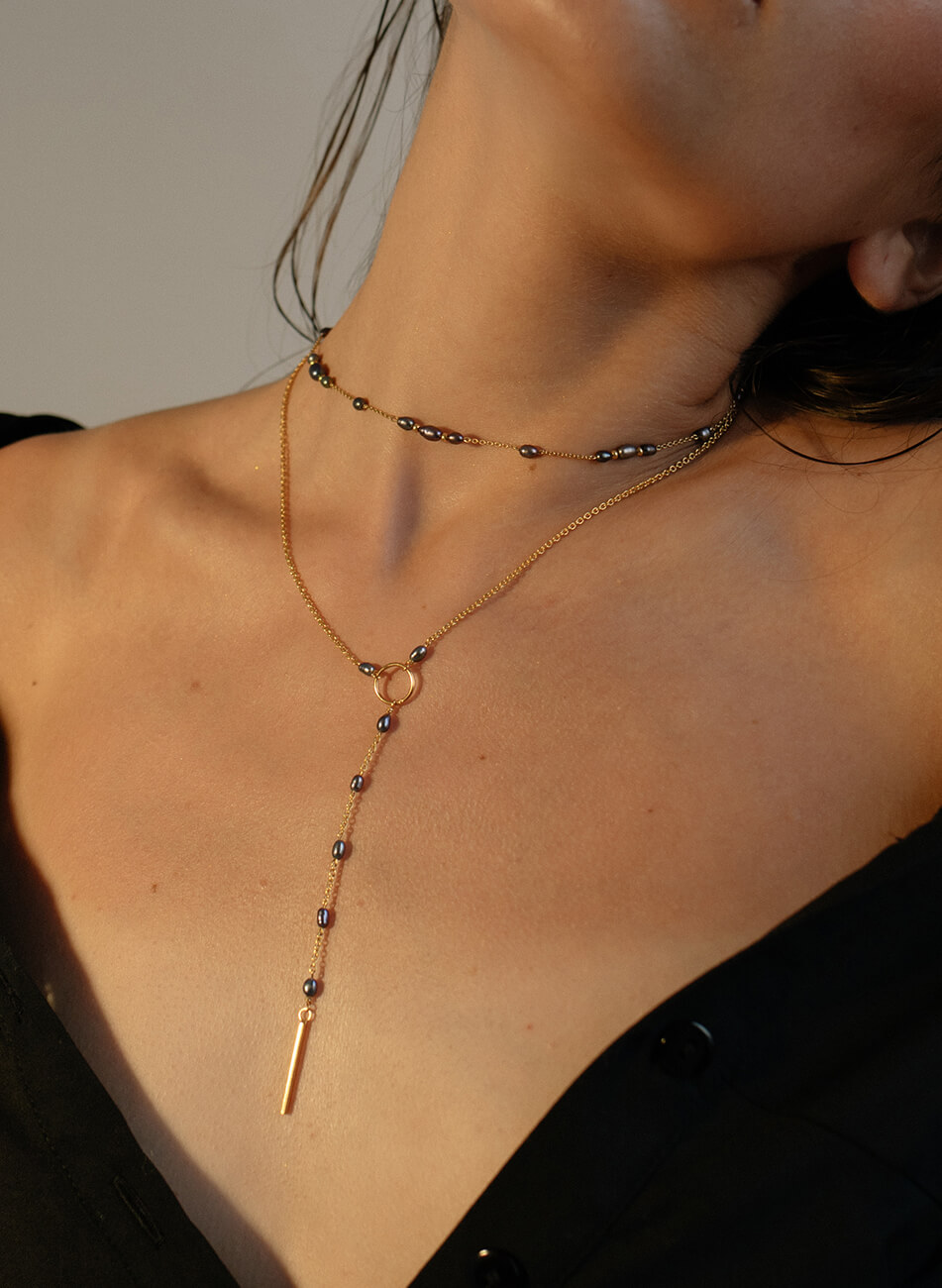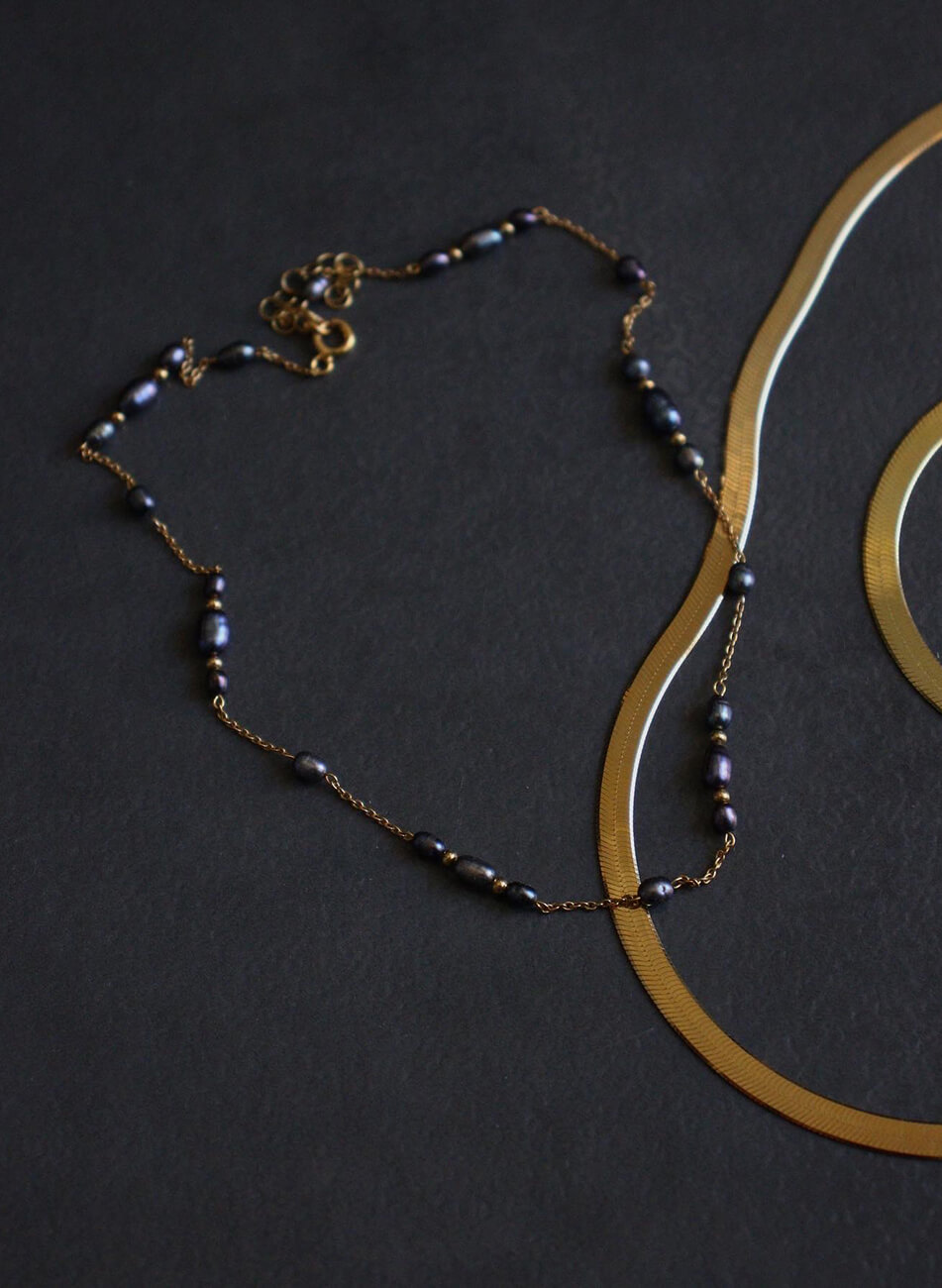 Короткий плетений ланцюжок з міні перлами чорного кольору