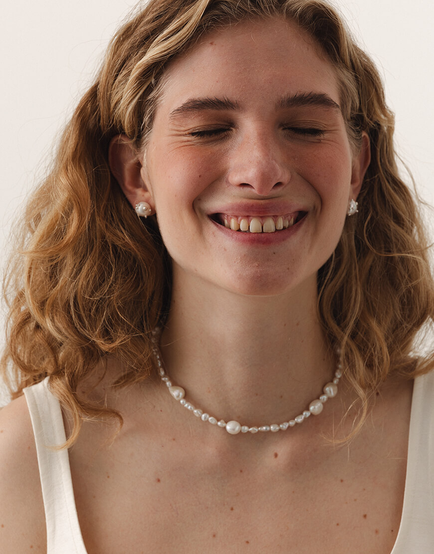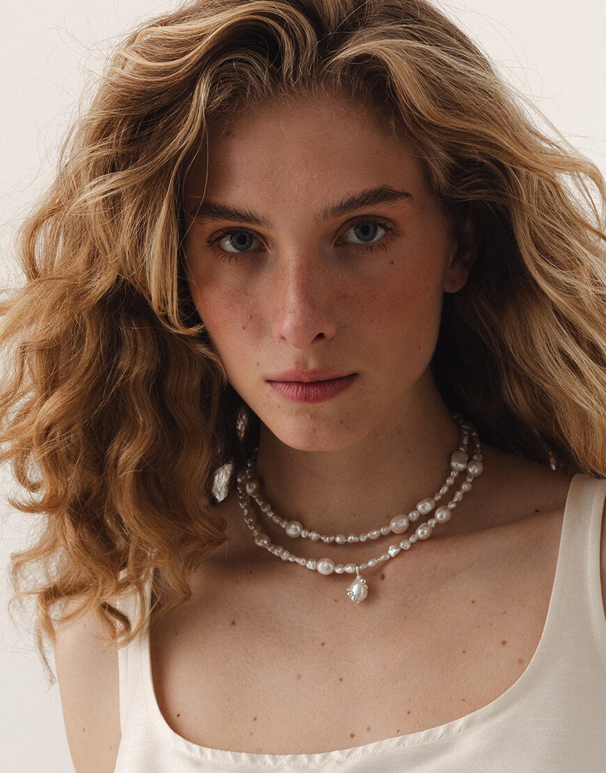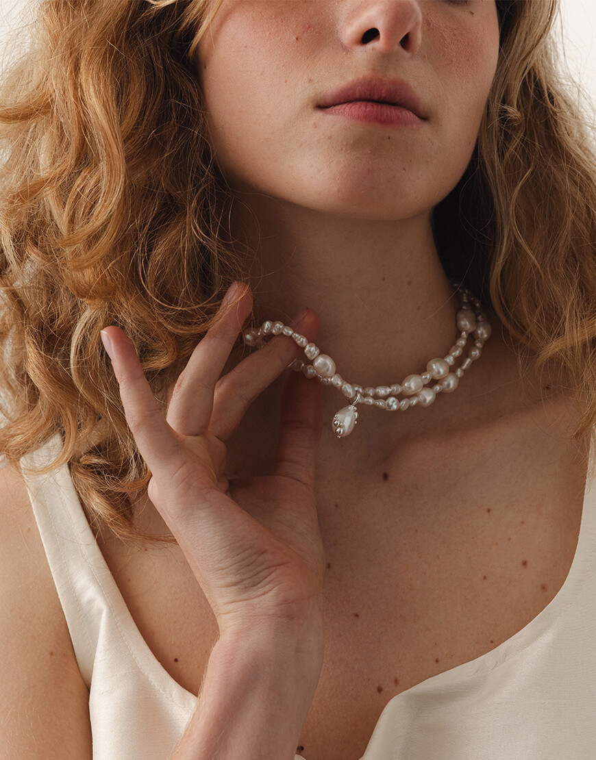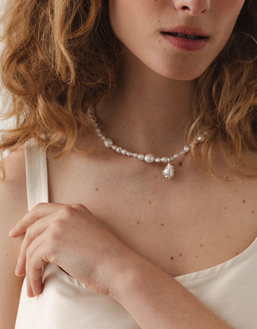 Намисто з білих перлин зі з’ємним підвісом, інкрустованим краплинами срібла.