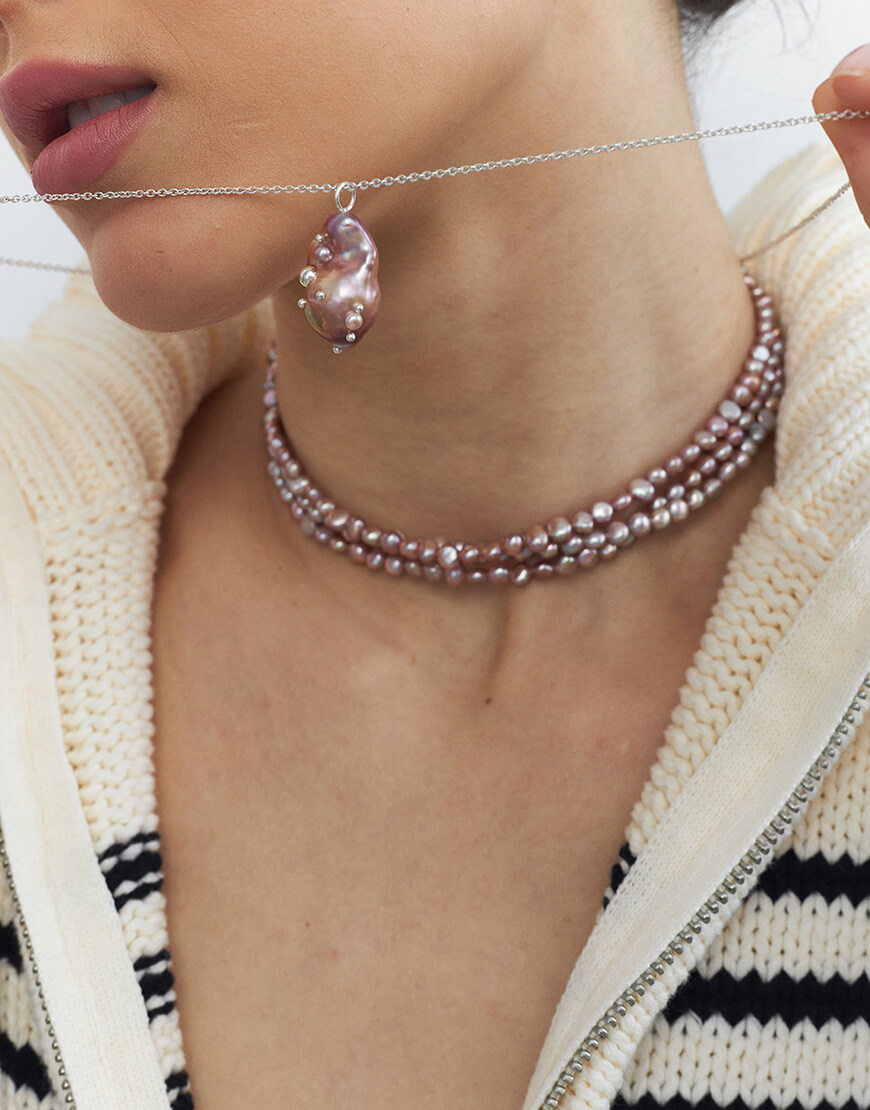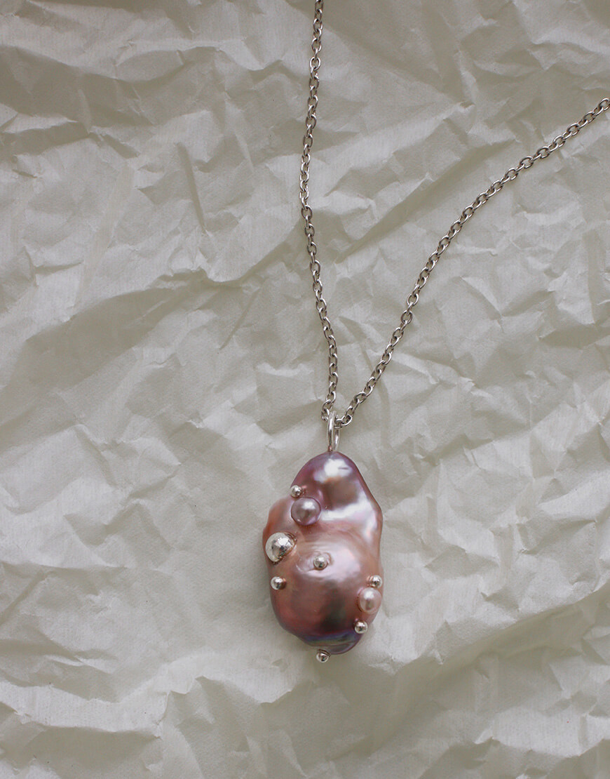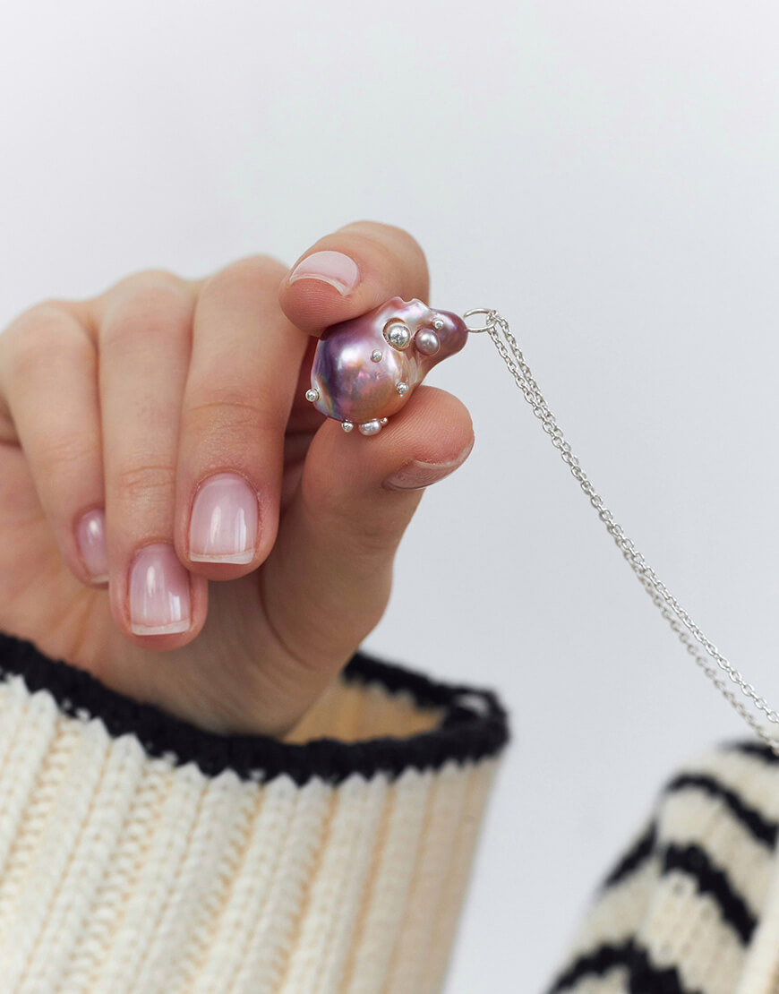 Доставка в течение 2-5 рабочих днейЛанцюжок з бароковою перлиною пурпурового відтінку інкрустованою каплями срібла та мініатюрними перлинами.