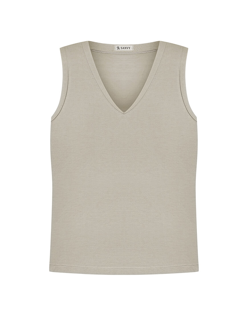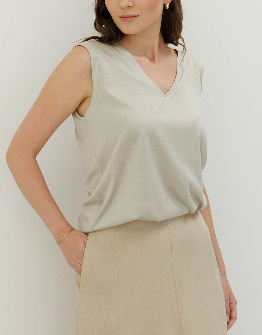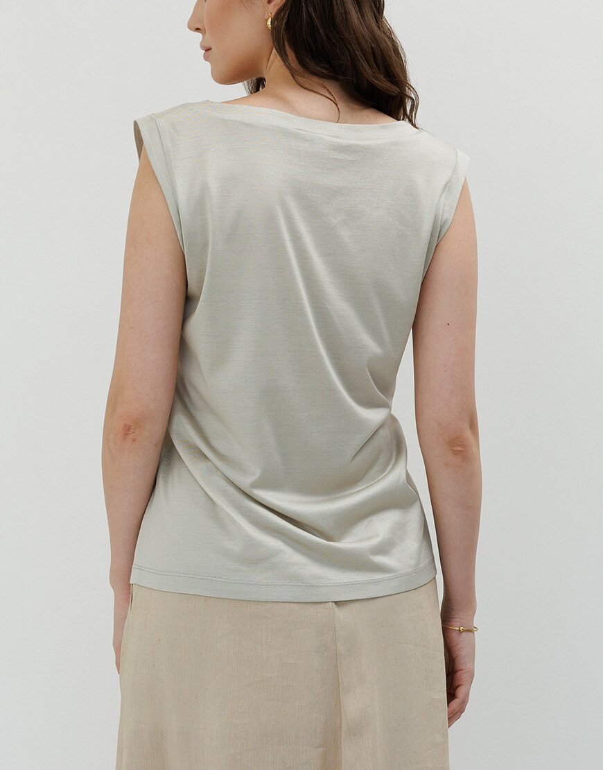 Топ вільного крою у кольорі сіро-зелений беж з бавовни з шовком. Має сатинову поверхню та цікаву обробку горловини та рукава.