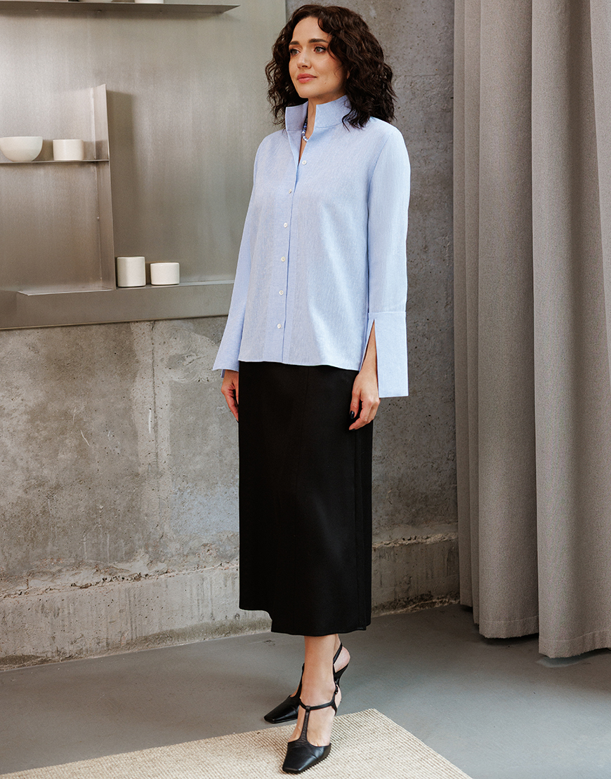 Доставка впродовж 3-5 робочих днівЛляна сорочка з коміром-стійкою. Має подовжені манжети з декоративними розрізами.