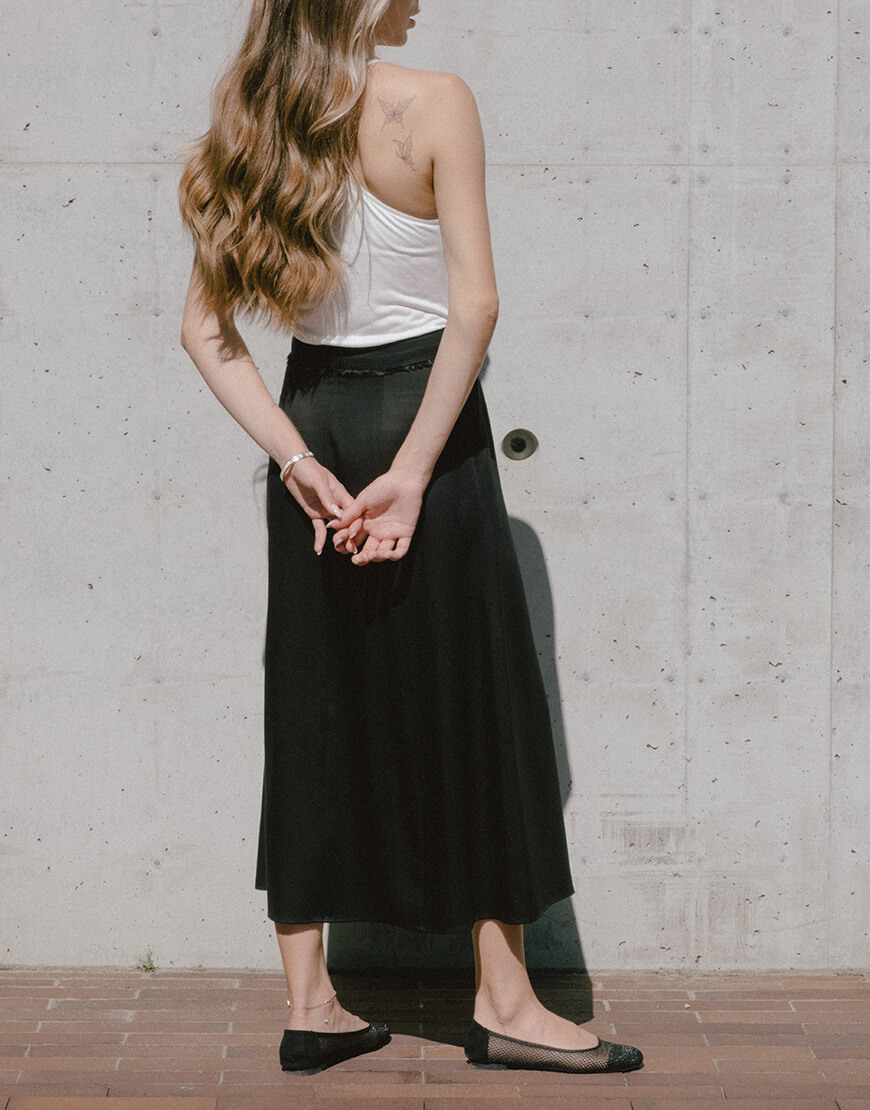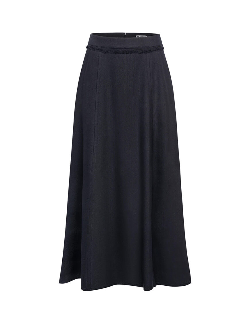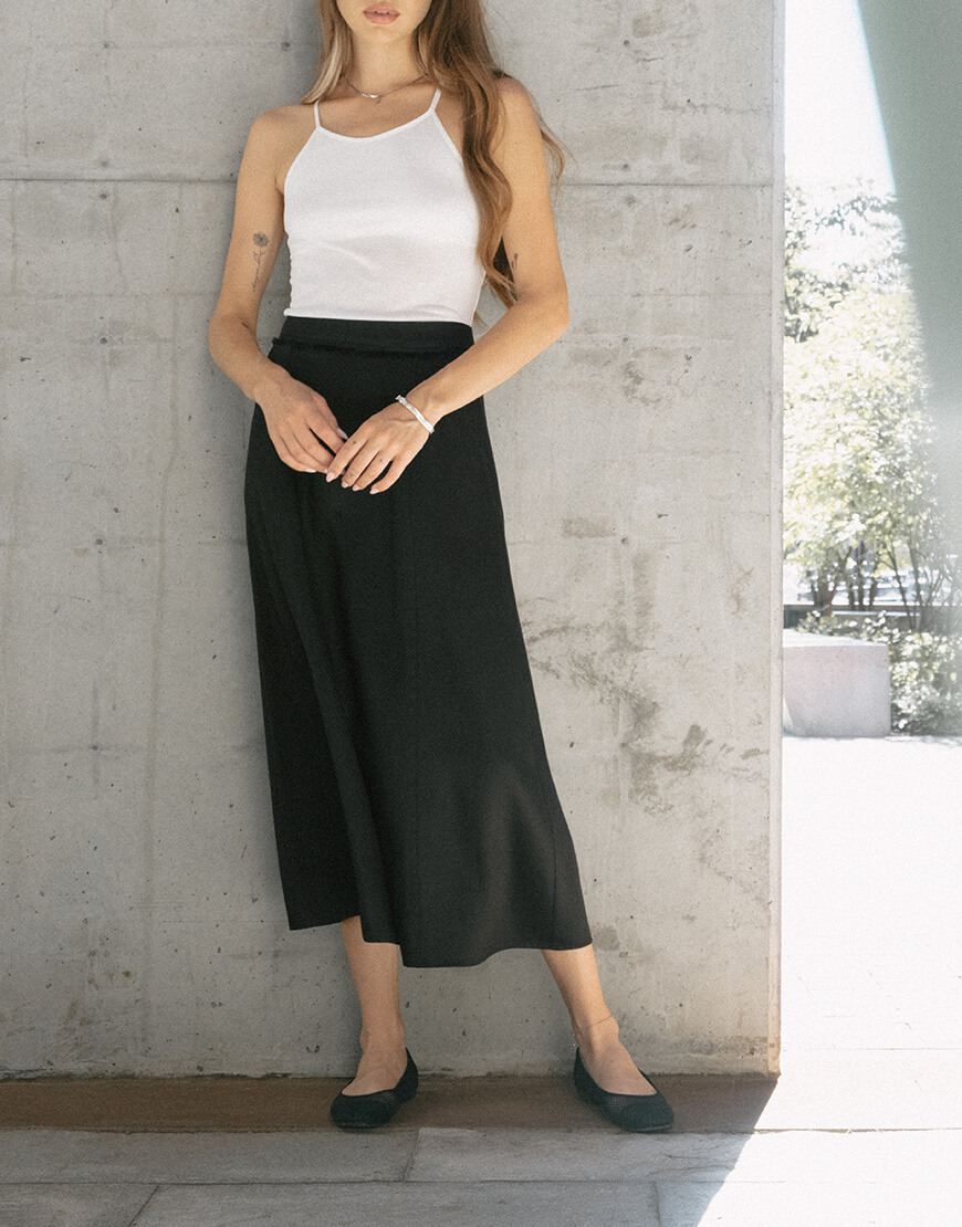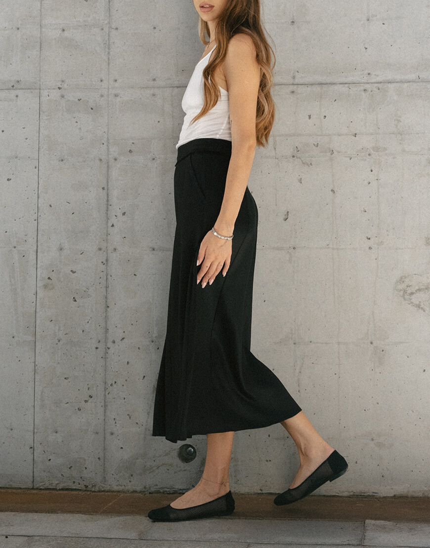 Чорна спідниця довжини міді з середньою посадкою. Гарно спадає. Має бокові кишені.