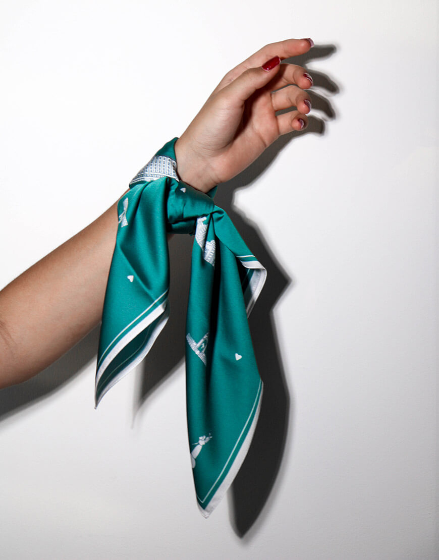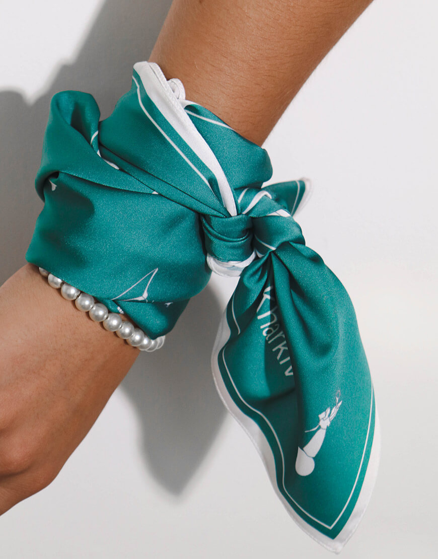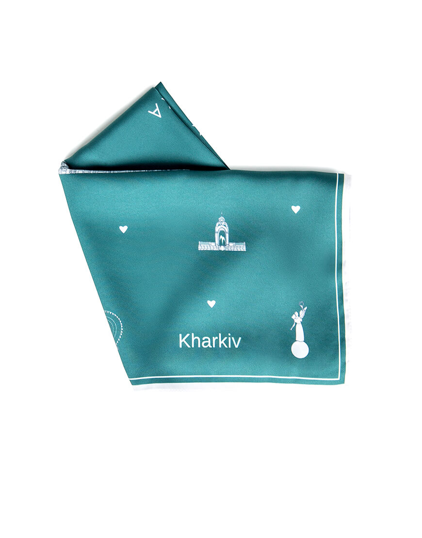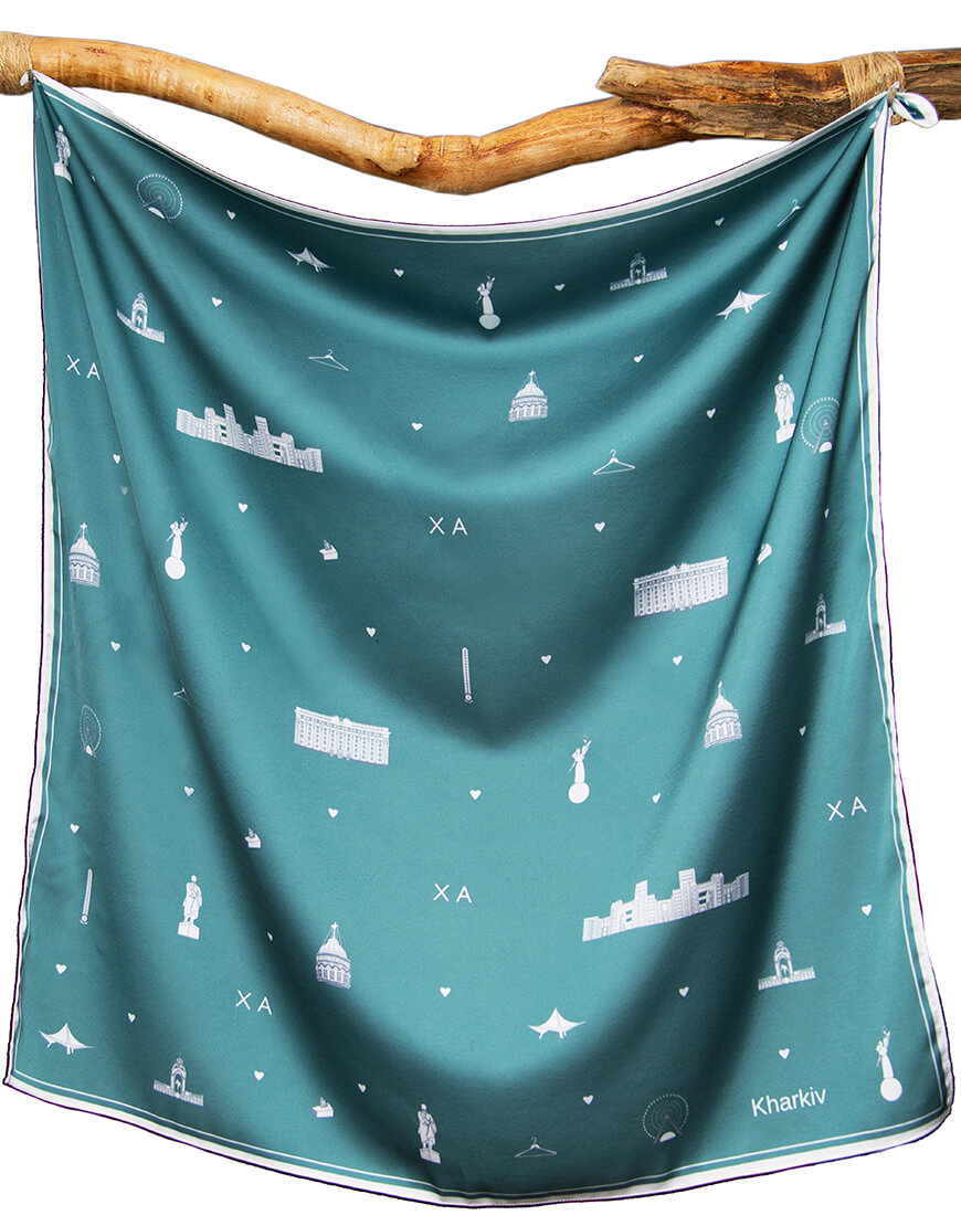 Хустинка з символами Харкова із штучного шовку, край з потаємним швом, зробленним вручну. Дрібний принт