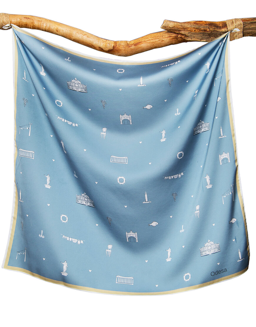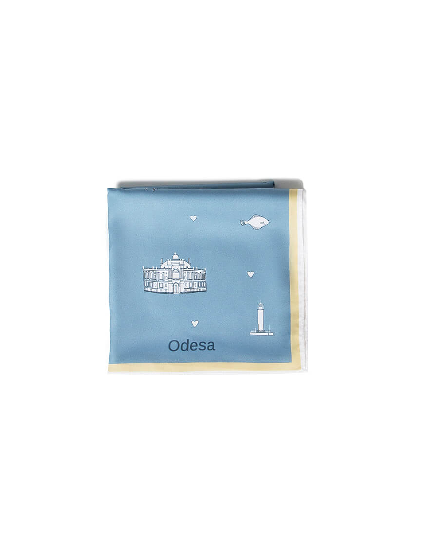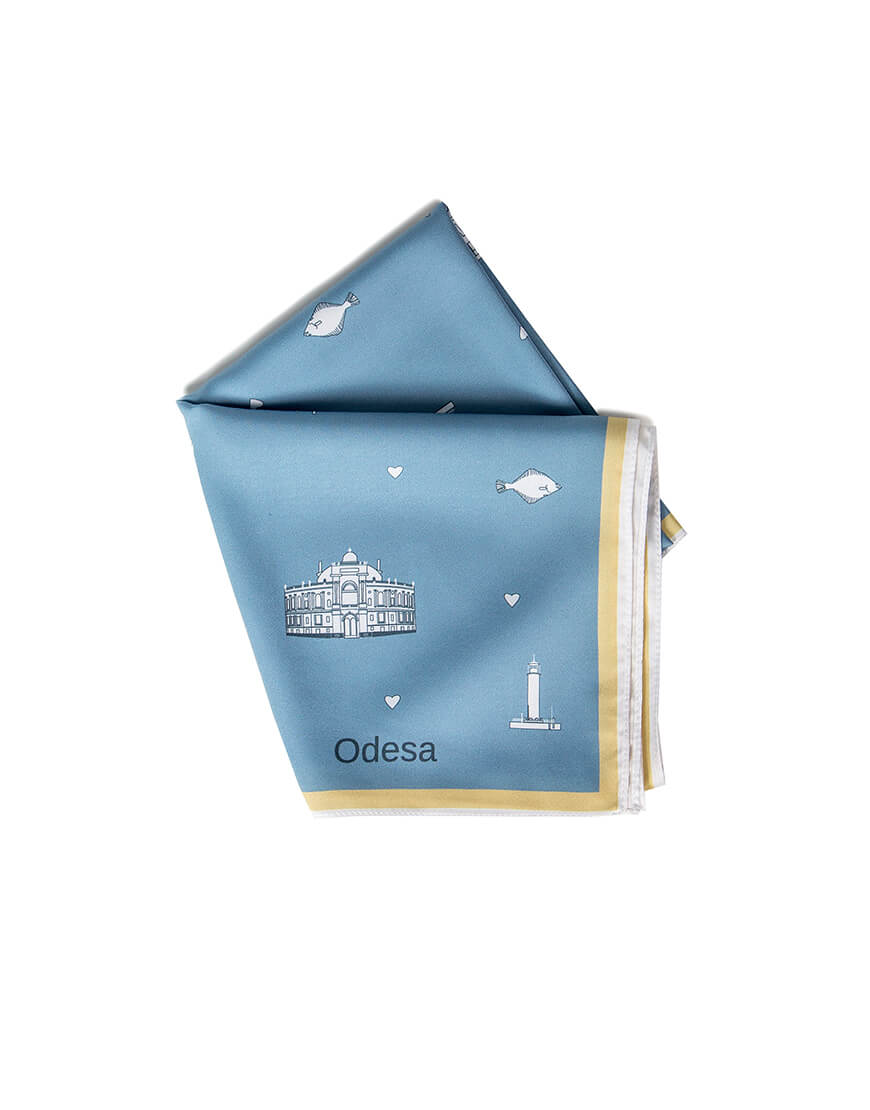 Хустинка з символами Одеси із штучного шовку, край з потаємним швом, зробленним вручну. Дрібний принт