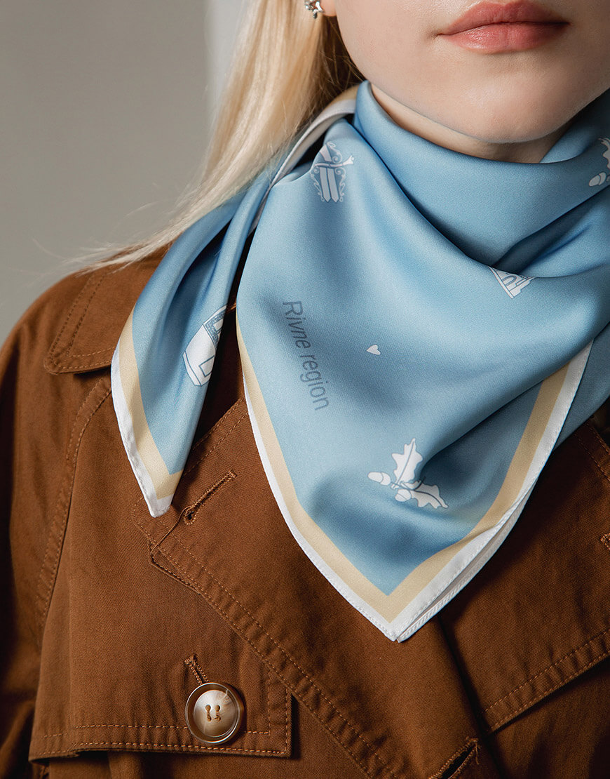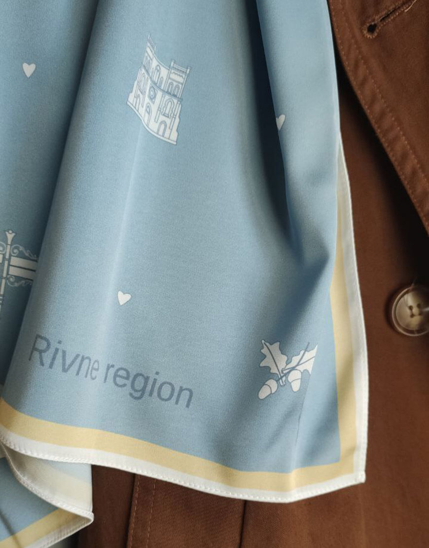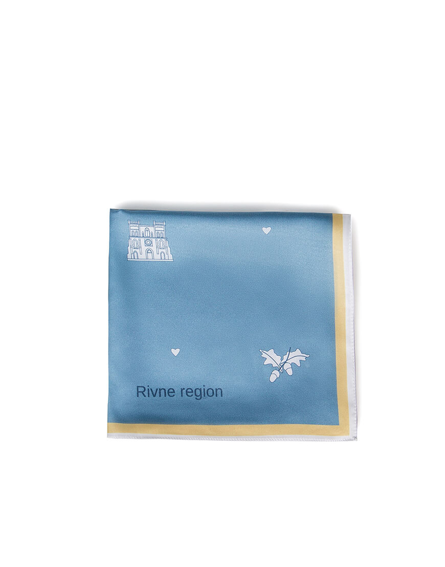 Хустинка з символами Рівненщини із штучного шовку, край з потаємним швом, зробленним вручну. Дрібний принт