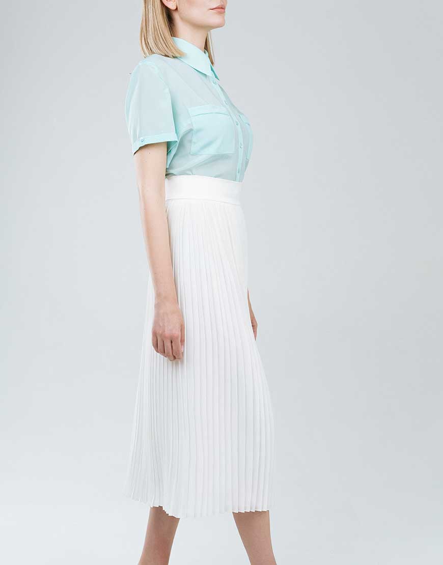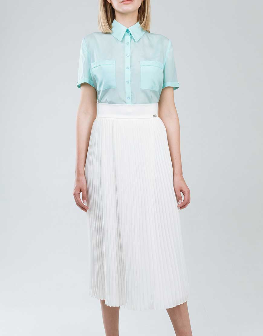 Сорочка прямого крою з накладними кишенями на лінії грудей. Рукав короткий вшивний, комір класичний. Застібка — гудзики спереду.