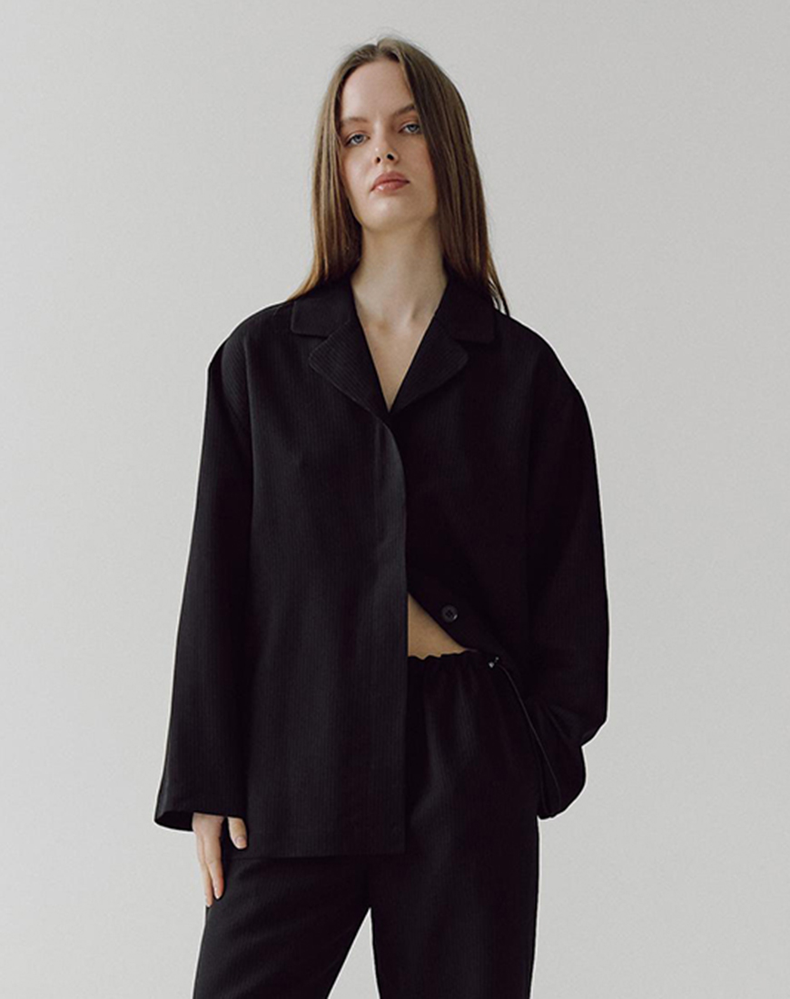 Фактурна тканина чорного кольору в тоненьку білу смужку.