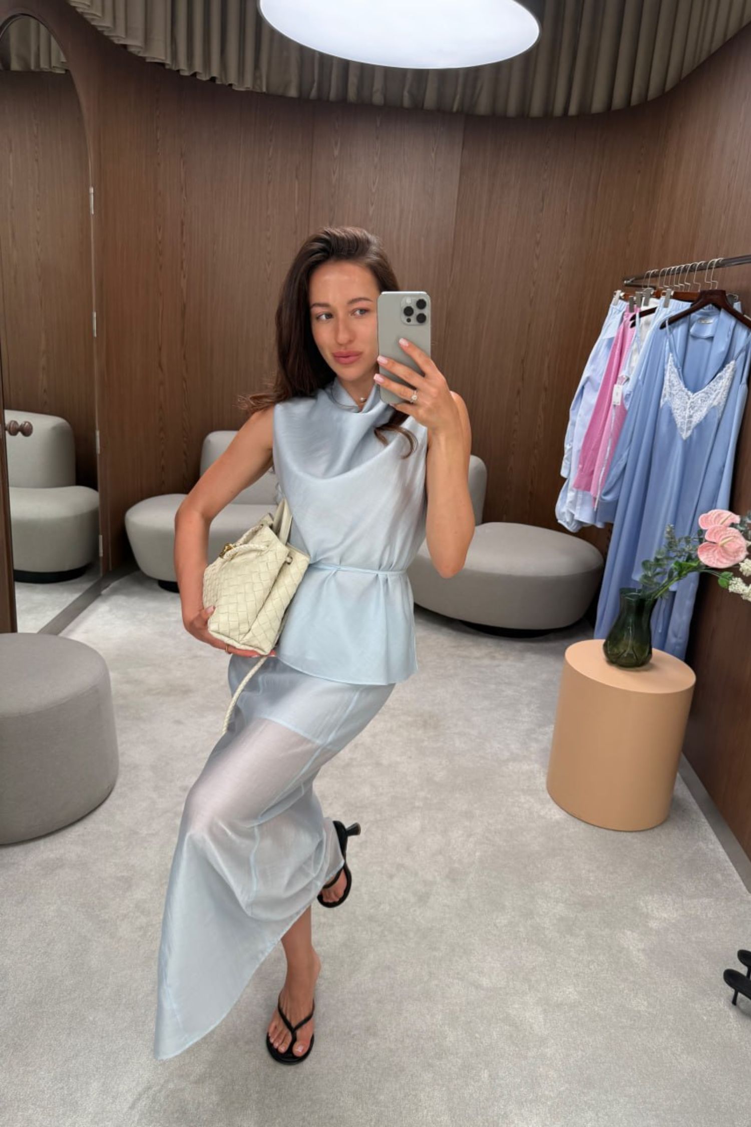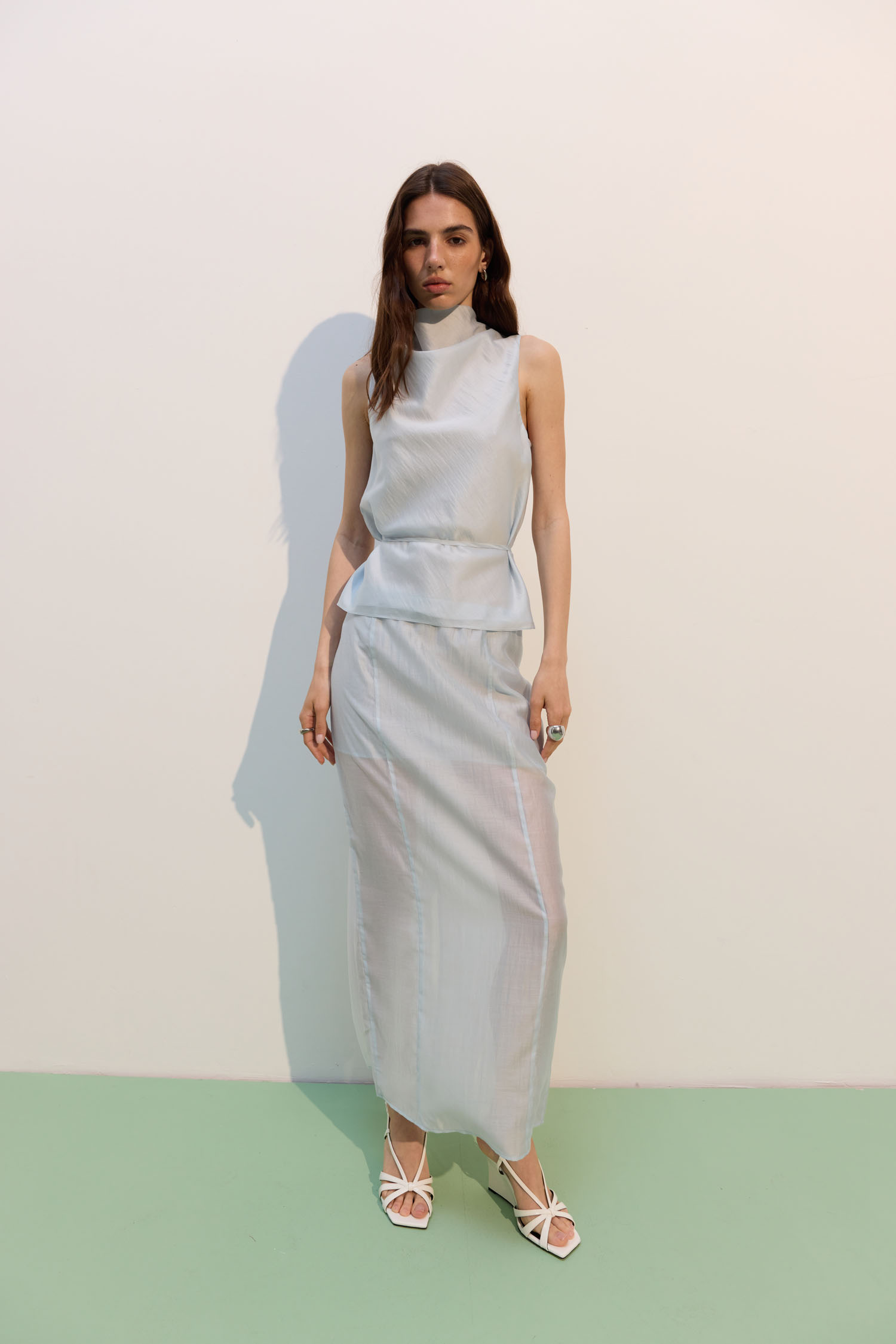ДоставкаСпідниця максі в відтінку Iced Blue. Прямого крою, пошита з легкого напівпрозорого тенселу. Має вшиту міні-спідницю для додаткового комфорту. Крій формує стриману силуетну лінію. Можна доповнити топом у тон для елегантного образу на особливі події.