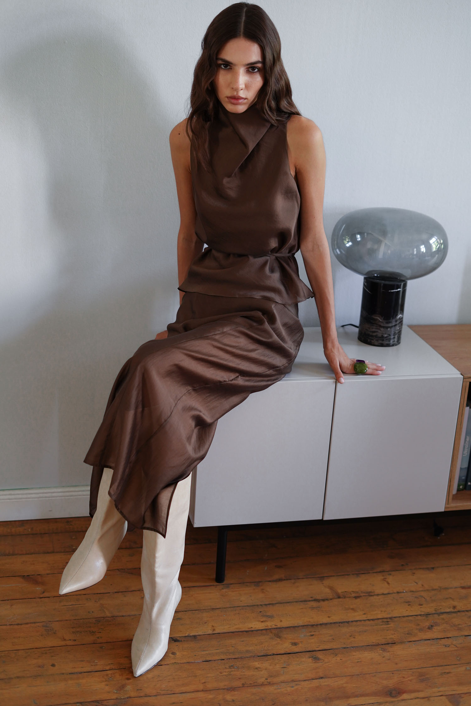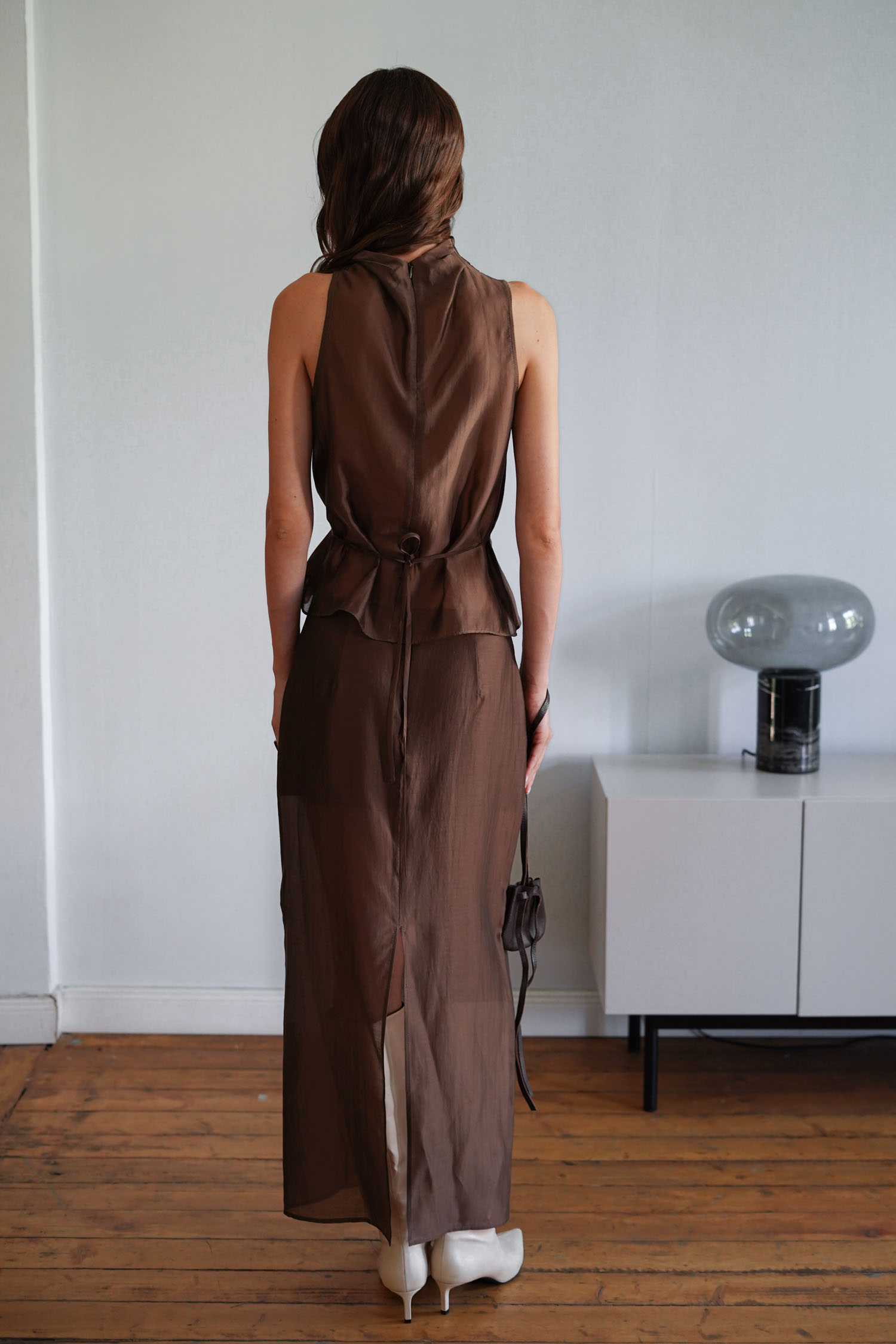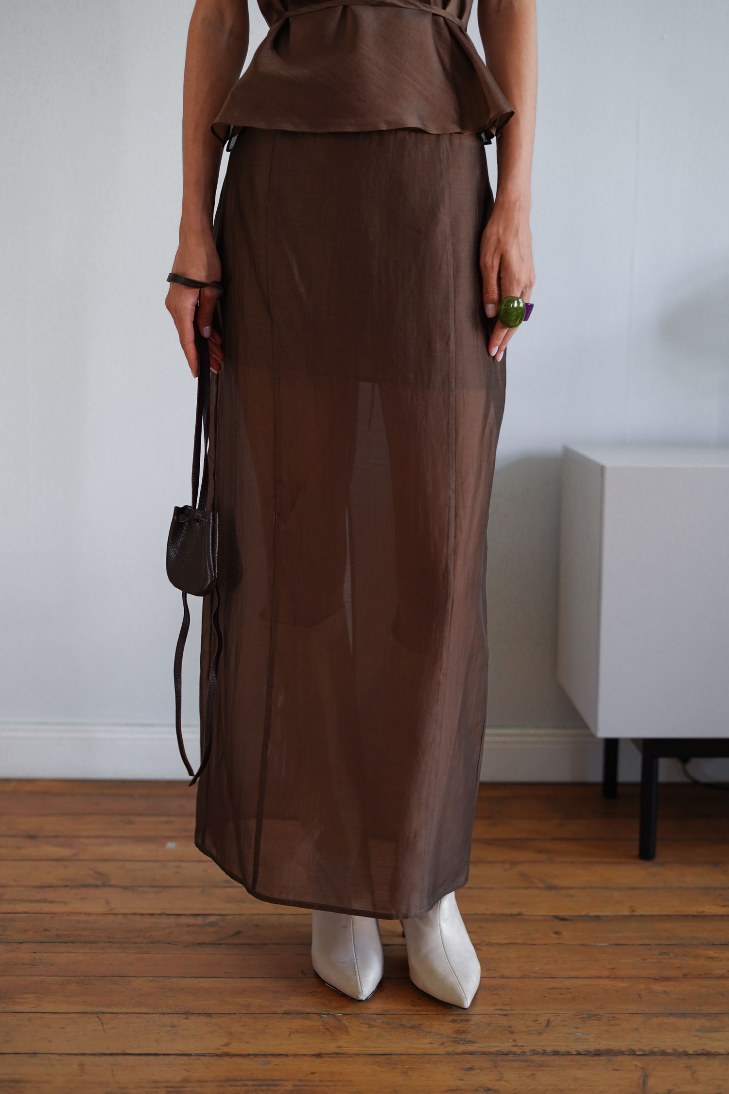 ДоставкаСпідниця максі шоколадного відтінку з легкого напівпрозорого тенселу прямого крою. Має розріз позаду. Всередині вшита міні-підкладка. Поєднання з топом у тон створює завершений вигляд для особливих моментів.
